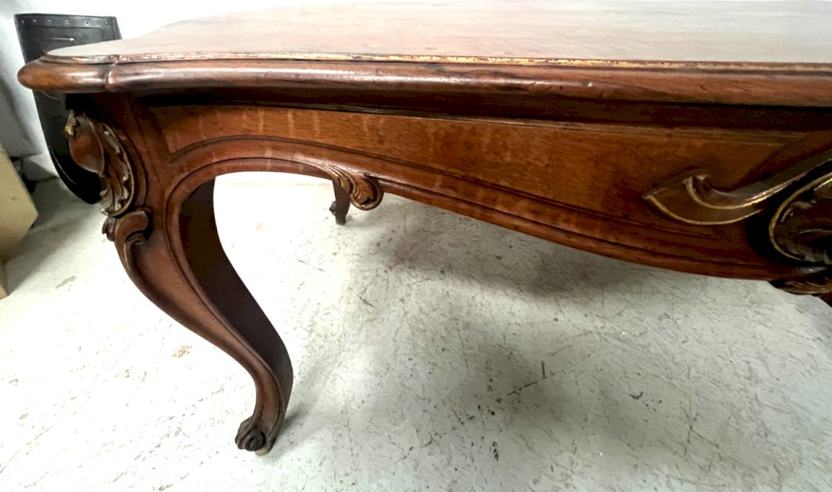 Louis XV style desk in solid walnut with gold accents Four curved and sculpted legs with scroll details Finely carved apron with shell decorations Wooden top Good condition Dimensions H 75 x L 164 x W 100 cm Period late 19th century Color: Brown Type: Simple desk Era: 19th century and earlier Subtype: With drawer Country of origin: France Height: 75 Material: Walnut Style: Louis XV, Neoclassical Length: 164 Width: 100