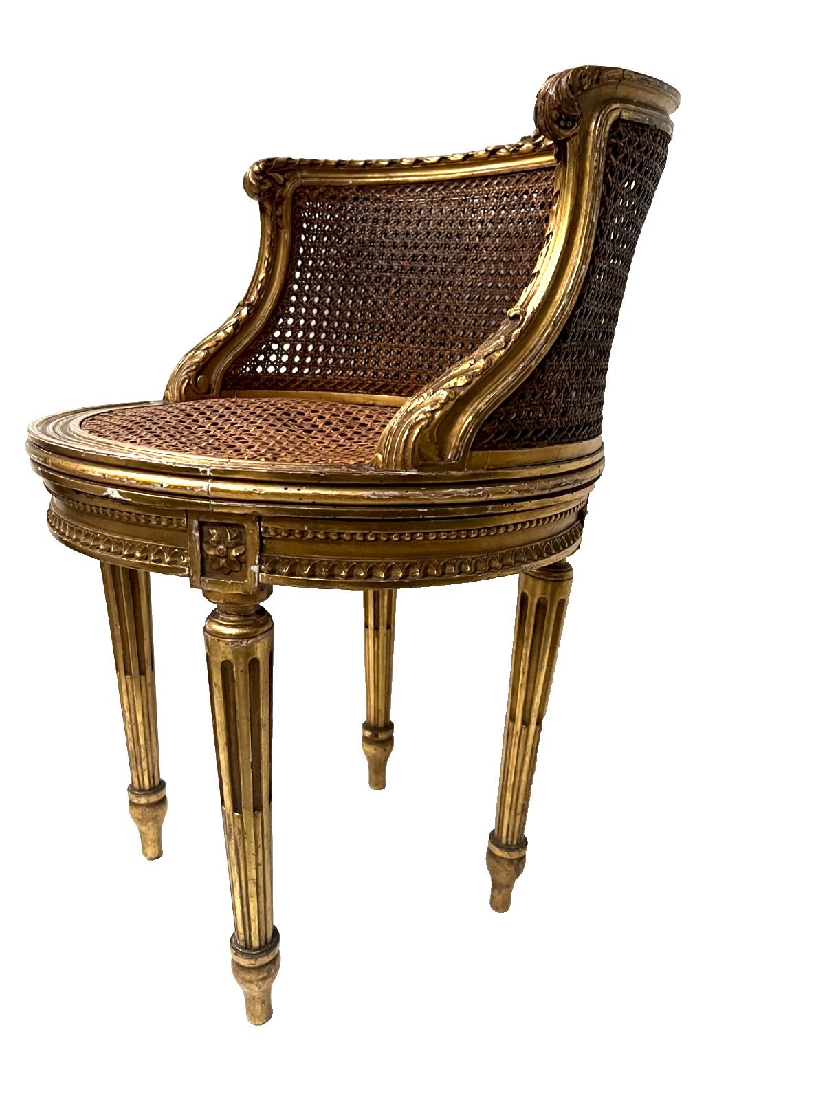 Louis XVI style armchair in gilded wood, seat and backrest with cane backing, rounded backrest carved with flower and acanthus leaf, four turned legs with fluted grooves. Antique restoration, see photos. Dimensions: H 75 x W 47 x D 45 cm. 20th century. Color: Gilded. Number of pieces: 1. Type: Armchair. Origin: France. Period: 20th-century design. Country of origin: France. Height: 75. Material: Beech. Length: 47. Width: 45.
