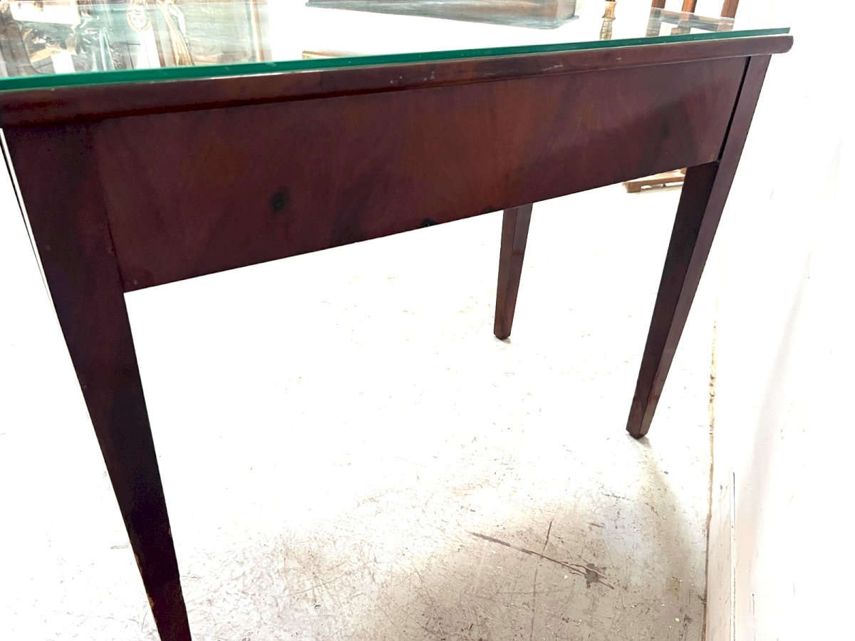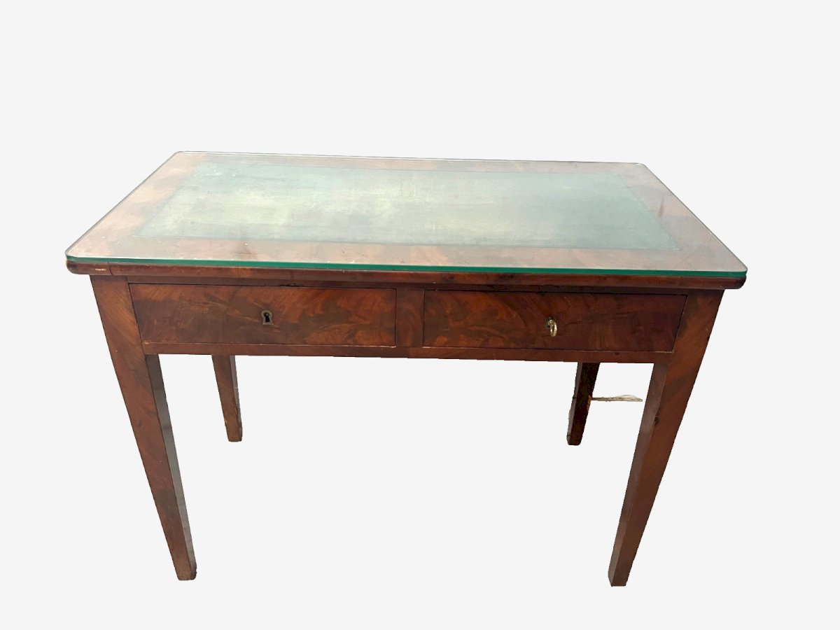 Flat desk in Directoire style made of mahogany and veneer Four conical legs Two drawers in front Top in worn green leather see photos Thick glass protection plate Good condition Dimensions H 75 x W 98 x D 51 cm Mid 19th century Type: desk Period: 19th century and earlier Origin: France Country of origin: France Height: 75 Material: Mahogany Style: Louis XVI Length: 98 Width: 51