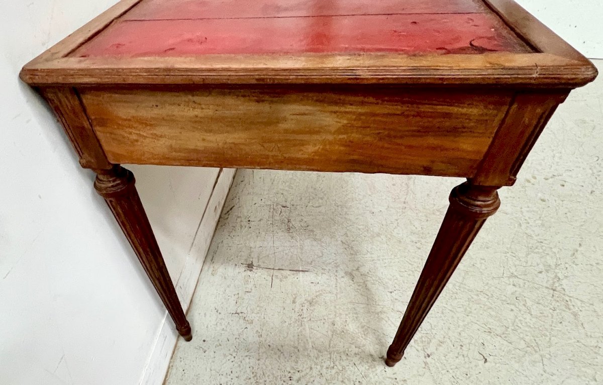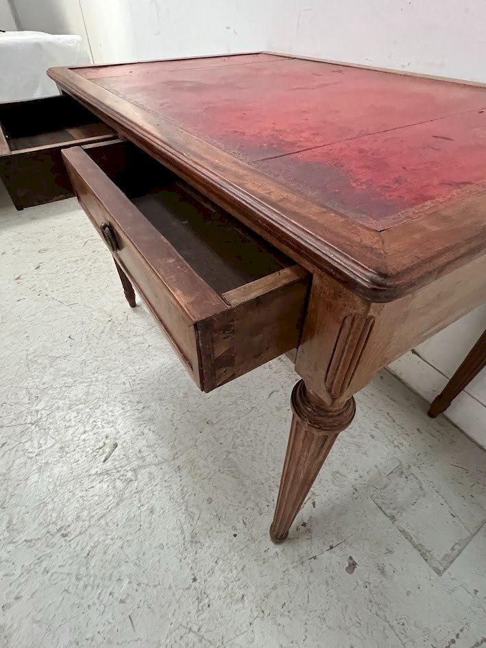 Louis XVI style beech desk stained Four turned legs with flutes Two front drawers Red leather top Used condition see photos Dimensions H 76 x W 100 x D 65 cm 20th century Type: Simple desk Period: 20th century design Country of origin: France Height: 76 Material: Beech Length: 100 Width: 65