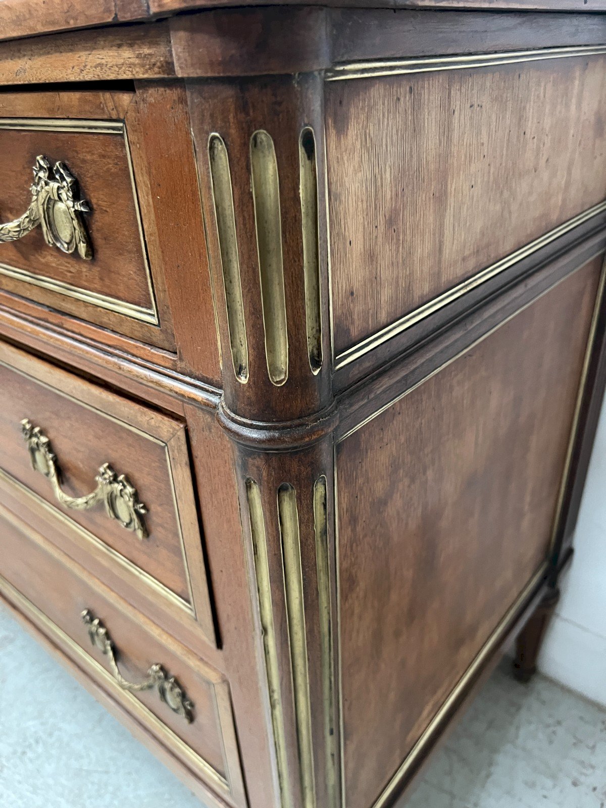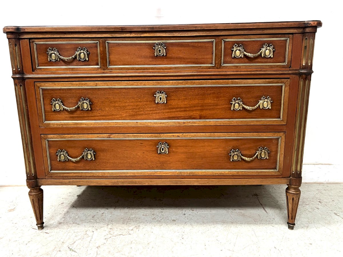 Louis XVI style mahogany commode Three front drawers with brass frames Turned feet with bronze sabots Sides with brass frame moldings Rounded uprights with brass flutes good condition Dimensions H 90 x L 128 x 61 cm Napoleon III period Color: Gray Type: Commode, Chiffonier Origin: France Subtype: 3 drawers Height: 87 Style: Louis XVI Material: Mahogany Length: 120 Width: 54