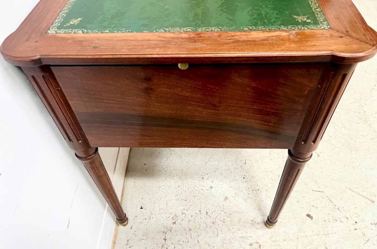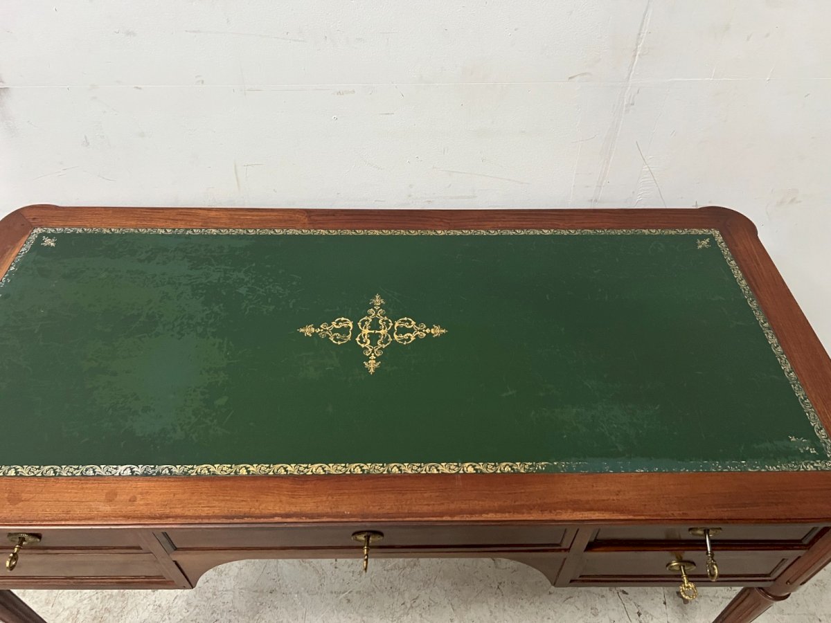 Flat desk in Louis XVI style made of mahogany and veneer Four fluted spindle legs Four drawers at the front and two side pull-outs Top covered in green leather with a gold trim and central motif Very good condition Dimensions H 77 x W 141 x D 65 cm Side pull-outs L 30 x 48 cm 20th century Type: Simple desk Period: 20th-century design Country of origin: France Height: 77 Material: Mahogany Length: 141 Width: 65