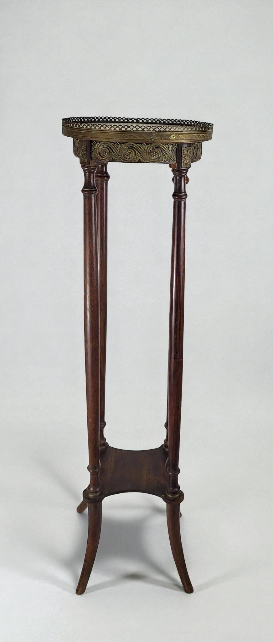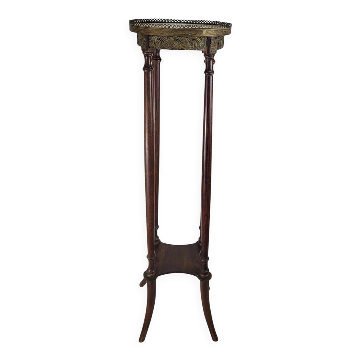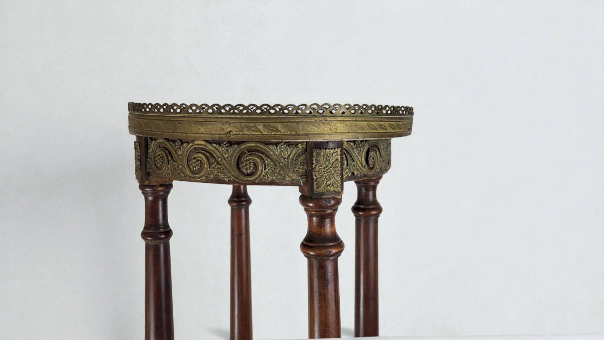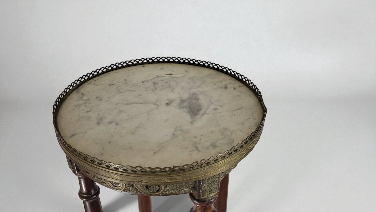 Louis XVI style pedestal table from the Napoleonic III era / mahogany / large size / white marble top / open gallery and gilded brass mount / shelf spacer. Height 108.5 cm. Diameter 30.5 cm. It is in good condition with usual signs of use and age. Delivery via Cocolis and/or nearby Paris suburbs, please inquire. L: 30 W: 30 H: 108