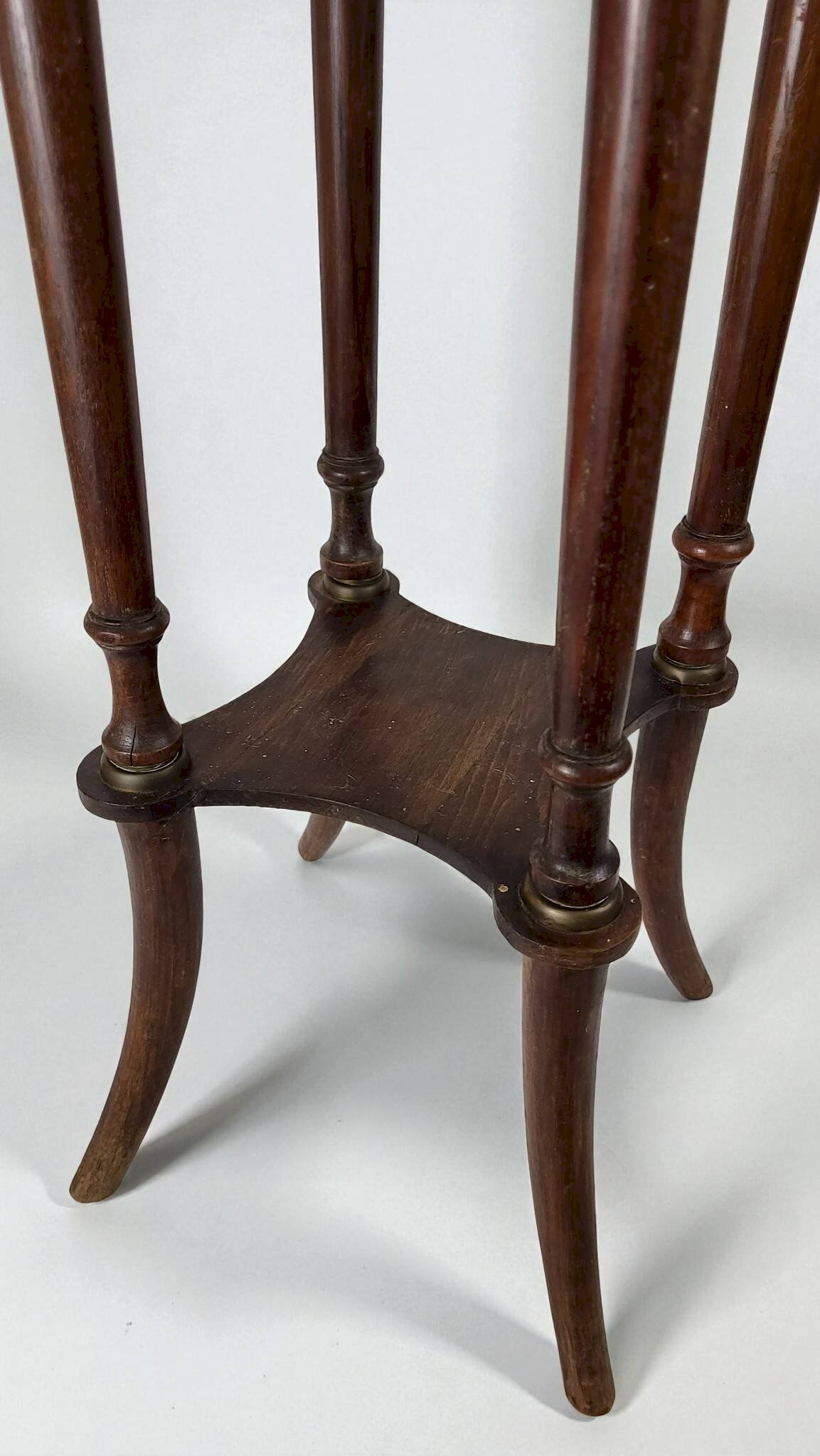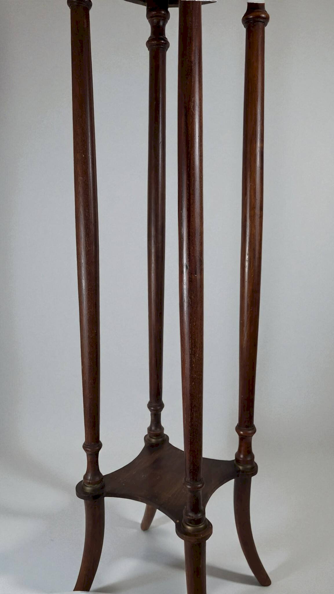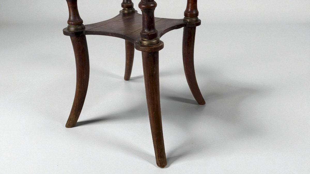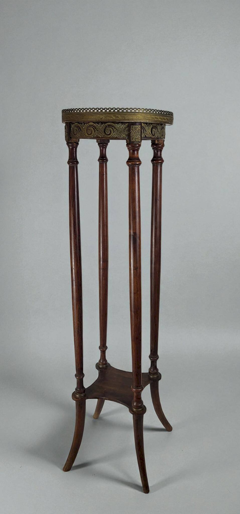 Louis XVI style pedestal table from the Napoleonic III era / mahogany / large size / white marble top / open gallery and gilded brass mount / shelf spacer. Height 108.5 cm. Diameter 30.5 cm. It is in good condition with usual signs of use and age. Delivery via Cocolis and/or nearby Paris suburbs, please inquire. L: 30 W: 30 H: 108