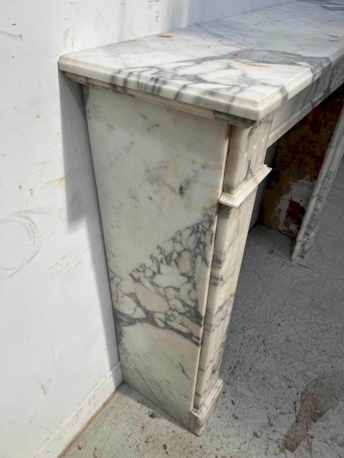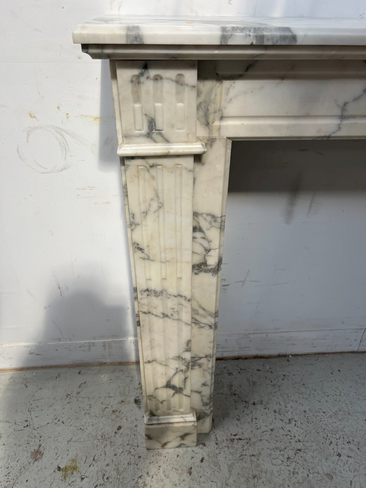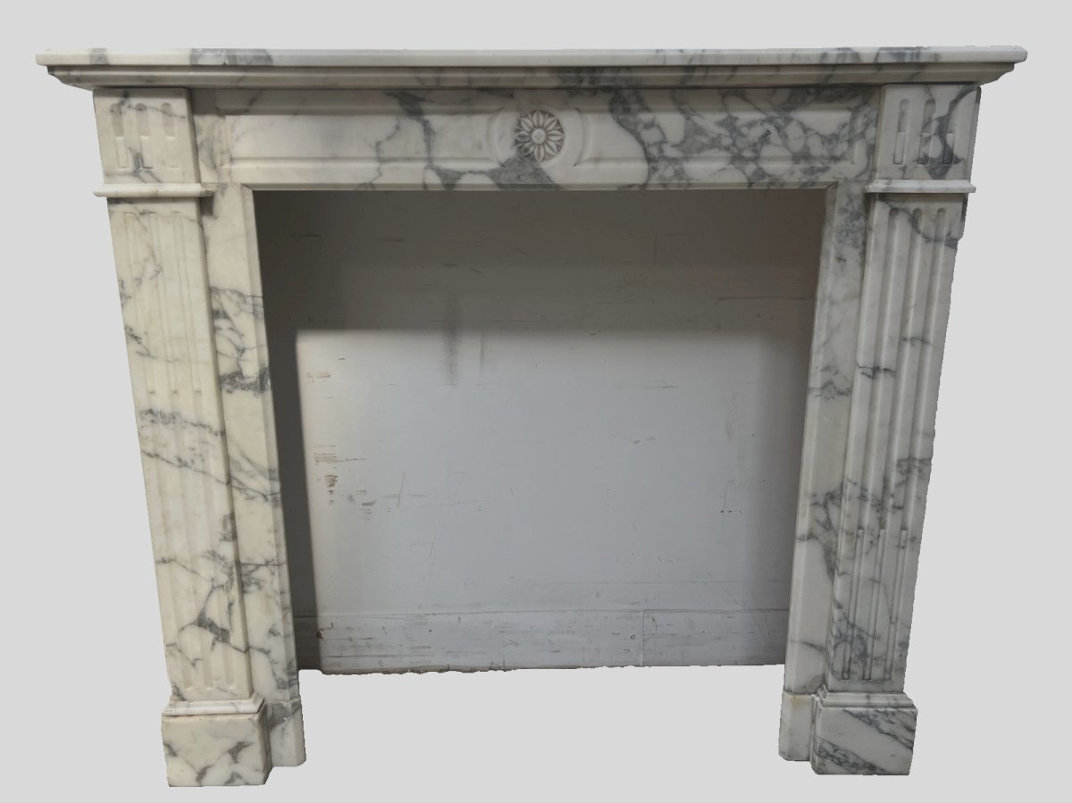 Louis XVI style fireplace made of veined white CARRARA marble. Two straight legs with fluted grooves. Frieze with fluted grooves and recessed rosette. Very good condition. Fireplace ready to be installed in your interior. Dimensions H 109 x L 128 x W 35 cm, firebox H 94 x L 80 cm. 19th century period. Type: Fireplace. Period: 19th century and earlier. Subtype: Complete fireplace. Height: 109. Style: Louis XVI. Material: Marble. Length: 128. Width: 35.