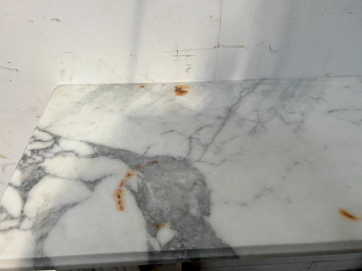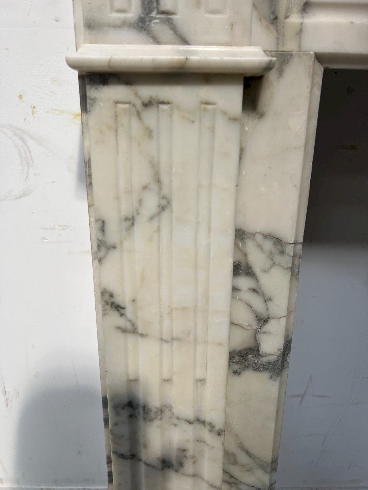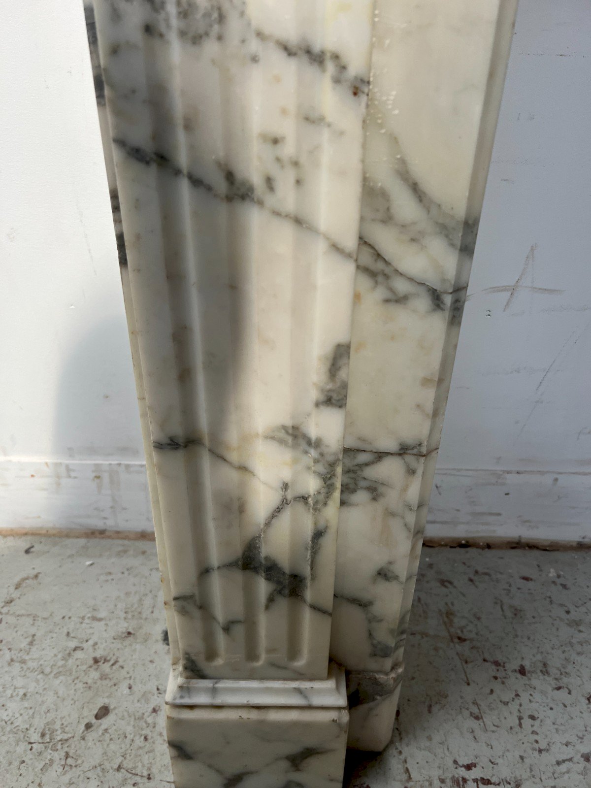 Louis XVI style fireplace made of veined white CARRARA marble. Two straight legs with fluted grooves. Frieze with fluted grooves and recessed rosette. Very good condition. Fireplace ready to be installed in your interior. Dimensions H 109 x L 128 x W 35 cm, firebox H 94 x L 80 cm. 19th century period. Type: Fireplace. Period: 19th century and earlier. Subtype: Complete fireplace. Height: 109. Style: Louis XVI. Material: Marble. Length: 128. Width: 35.