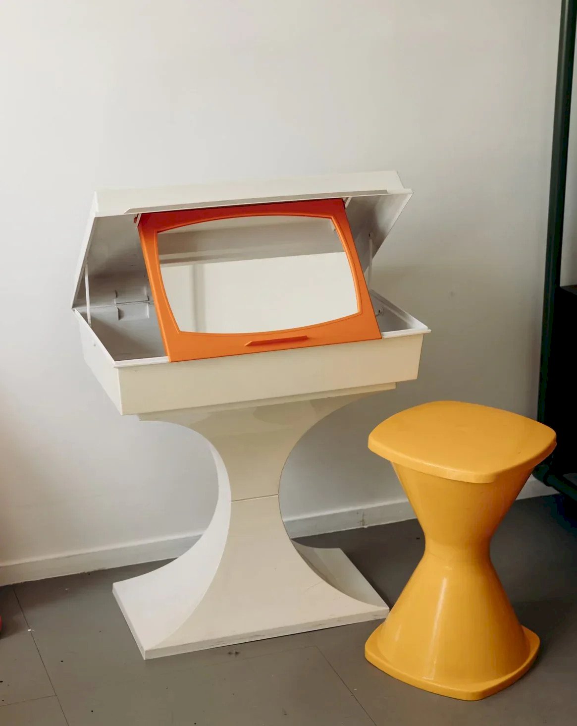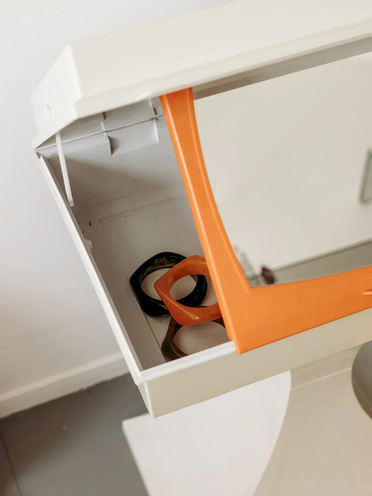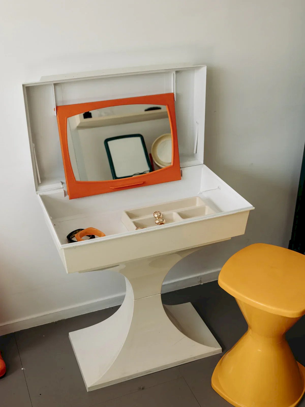 Discover our white plastic vanity, an elegant and practical piece of furniture to enhance your space. Its integrated mirror allows you to get ready easily, while its clever compartment provides an ideal space to store your jewelry and accessories. Although a few signs of wear and slight yellowing of the plastic attest to its history, its vintage charm makes it an undeniable asset for any decor. Add a retro touch to your interior with this unique and functional vanity. Length: 59 cm Width: 35.5 cm Height (closed): 66 cm Height (open): 97 cm A brief history of the vanity The term "vanity" appeared in the early 20th century, even though the furniture has existed since antiquity. Comprising a tabletop, one or more mirrors, and numerous drawers, the vanity is a storage piece, but above all a place for preparing oneself where one applies makeup, perfumes, and hairstyling. Originally, this furniture was suitable for both men and women, but it quickly became the embodiment of feminine mystery. The vanity can indeed feature secret compartments to hold intimate correspondence. Today, the vanity is making a comeback and works wonderfully in all styles of interiors! Condition: Used: Item has been used. Item shows some signs of superficial wear, fully operational, and functioning correctly. It may be a display model or an item returned to the store after a short period of use. Possible imperfections. Brand: Debongout Type: Curated product Material: Plastic Style: Country Personalized: Vanities