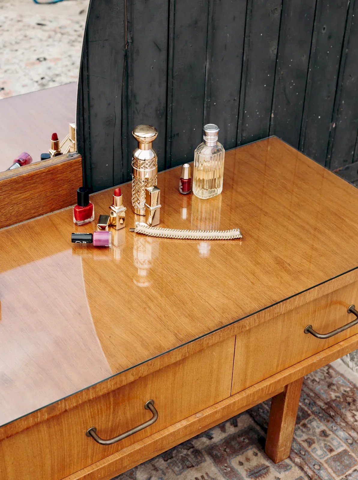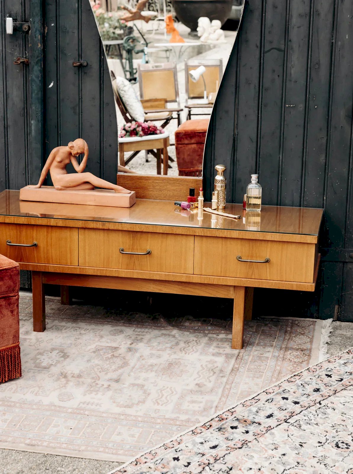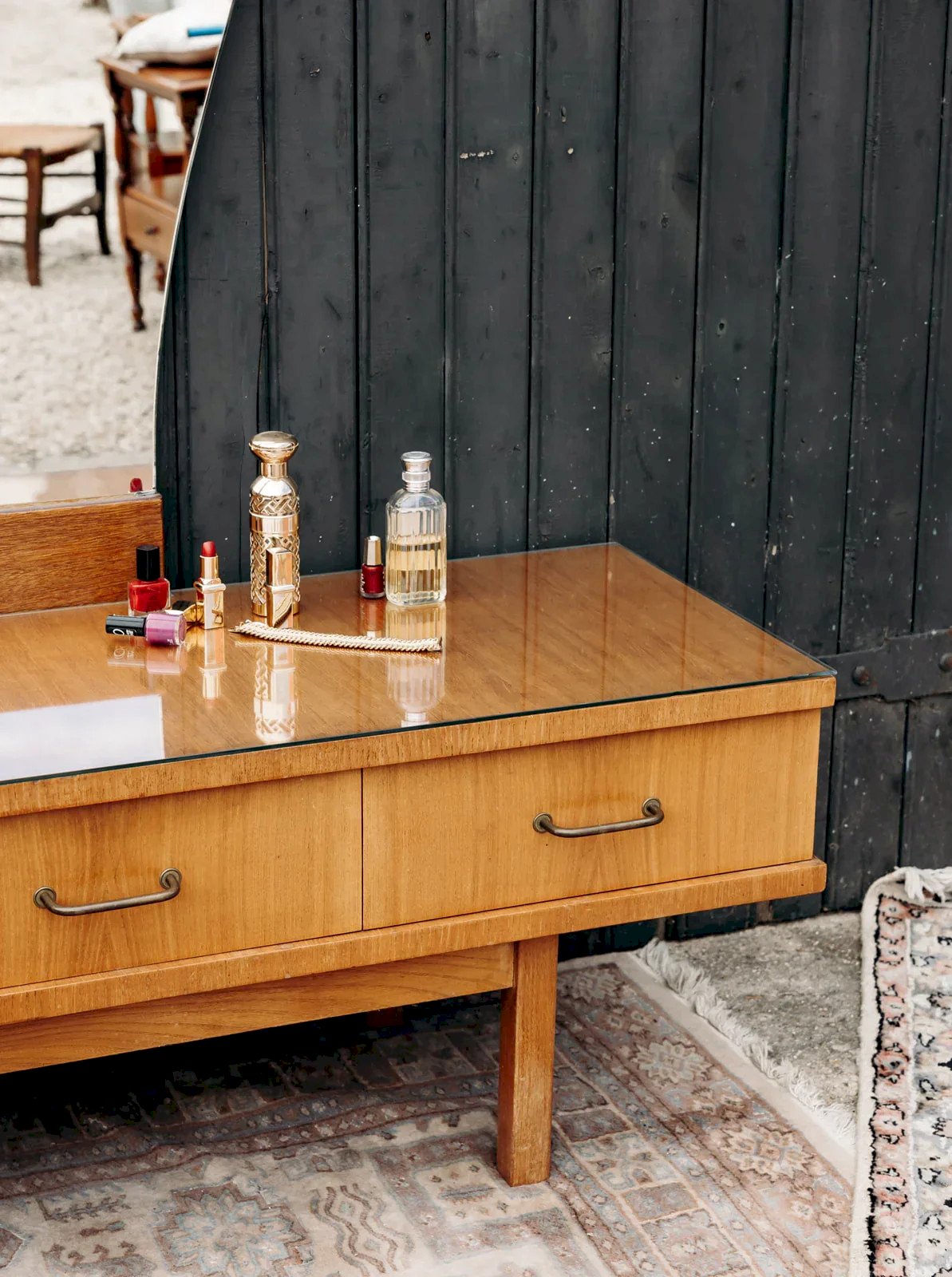 Bring charm and functionality to your interior with this beautiful wooden dressing table in an authentic style. Its three drawers equipped with brass handles offer practical storage space, while the glass top protects the wood and adds a touch of elegance. The removable mirror completes this piece of furniture by giving it character and versatility, perfect for a decoration that is both refined and practical. Length: 130 cm Width: 44 cm Total height: 159 cm Height of the furniture: 45 cm Height of the drawers: 13 cm A little history of the dressing table The term "dressing table" appeared in the early 20th century, while the furniture itself has existed since antiquity. Composed of a tabletop, one or more mirrors, and numerous drawers, the dressing table is not only a storage piece but also a preparation space where one applies makeup, perfumes, and hairstyles. Originally, this furniture was suitable for both men and women, but it quickly became the embodiment of feminine mystery. The dressing table can indeed feature secret compartments to store private correspondence. Today, the dressing table is making a comeback and works very well in all interior styles! Condition: Used: Item has been used. Item shows some signs of superficial wear... Used: Item has been used. Item shows some signs of superficial wear, fully operational and working correctly. It may be a demonstration model or an item returned to the store after a short period of use. any imperfections. Brand: Debongout Type: Vintage product Material: Wood, Glass Style: Country Customizable: Dressing tables