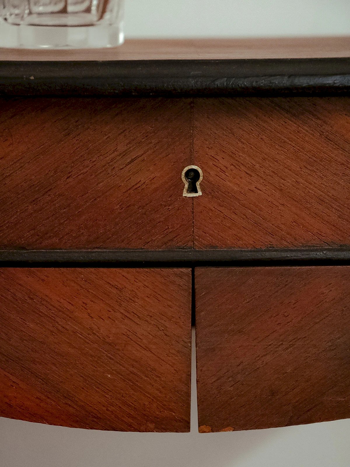 Enhance your beauty corner with this dressing table featuring a wood veneer reminiscent of marquetry, set on a curved black base that gives it an elegant and graphic silhouette; its compact size makes it easy to integrate into a bedroom or dressing room. Its top lifts up, and its two small drawers offer discreet storage for beauty products and accessories, perfect for a refined daily routine. It is sold without a key. Slight signs of wear on the drawers contribute to its charm. Length: 53 cm Width: 37 cm Height: 71 cm Drawer height: 4.5 cm A little history of the dressing table The term "dressing table" appeared in the early 20th century, although the piece of furniture has existed since antiquity. Composed of a surface, one or more mirrors, and numerous drawers, the dressing table is a storage unit, but above all a preparation space where one applies makeup, perfume, and styles hair. While originally this furniture was suitable for both men and women, it quickly became the embodiment of feminine mystery. The dressing table can indeed feature secret compartments to hold intimate correspondence. Today, the dressing table is making a comeback and works very well in all styles of interiors! Condition: Used: Item has been used. Item shows some signs of superficial wear... Used: Item has been used. Item shows some signs of superficial wear, fully operational and functioning correctly. It could be a demonstration model or an item returned to the store after a short period of use. Possible imperfections. Brand: Debongout Type: Curated product Material: Wood Style: Country Personalized: Dressing tables