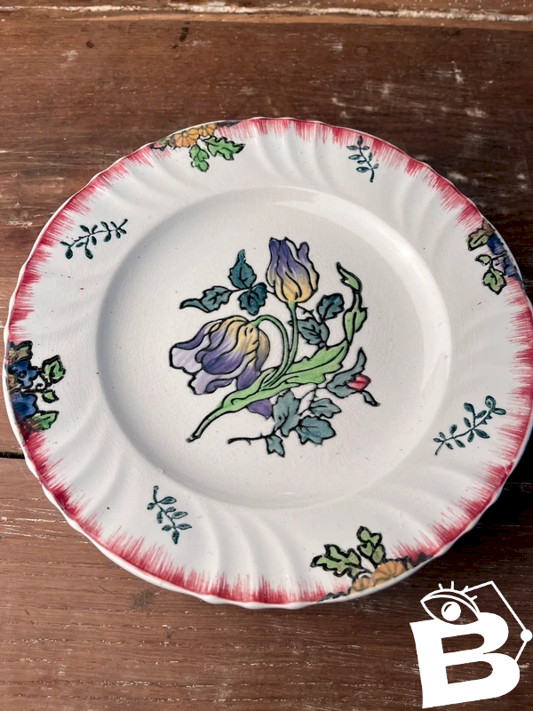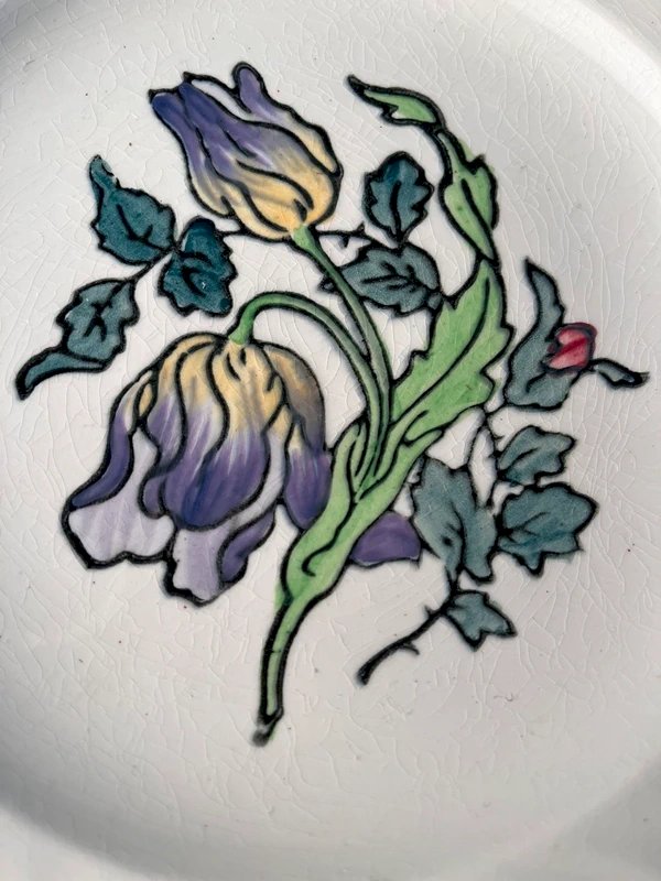 Low compote dish or raised plate Longwy model Marseille in old earthenware with polychrome patterns depicting tulips.