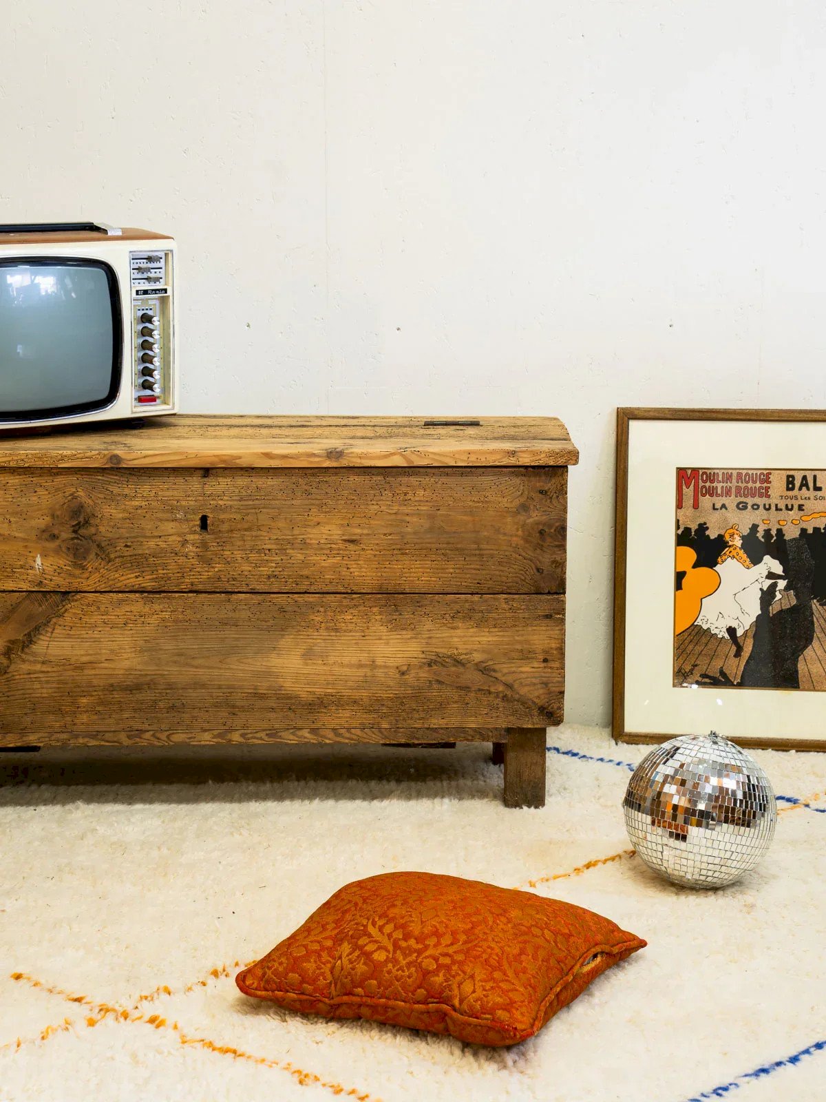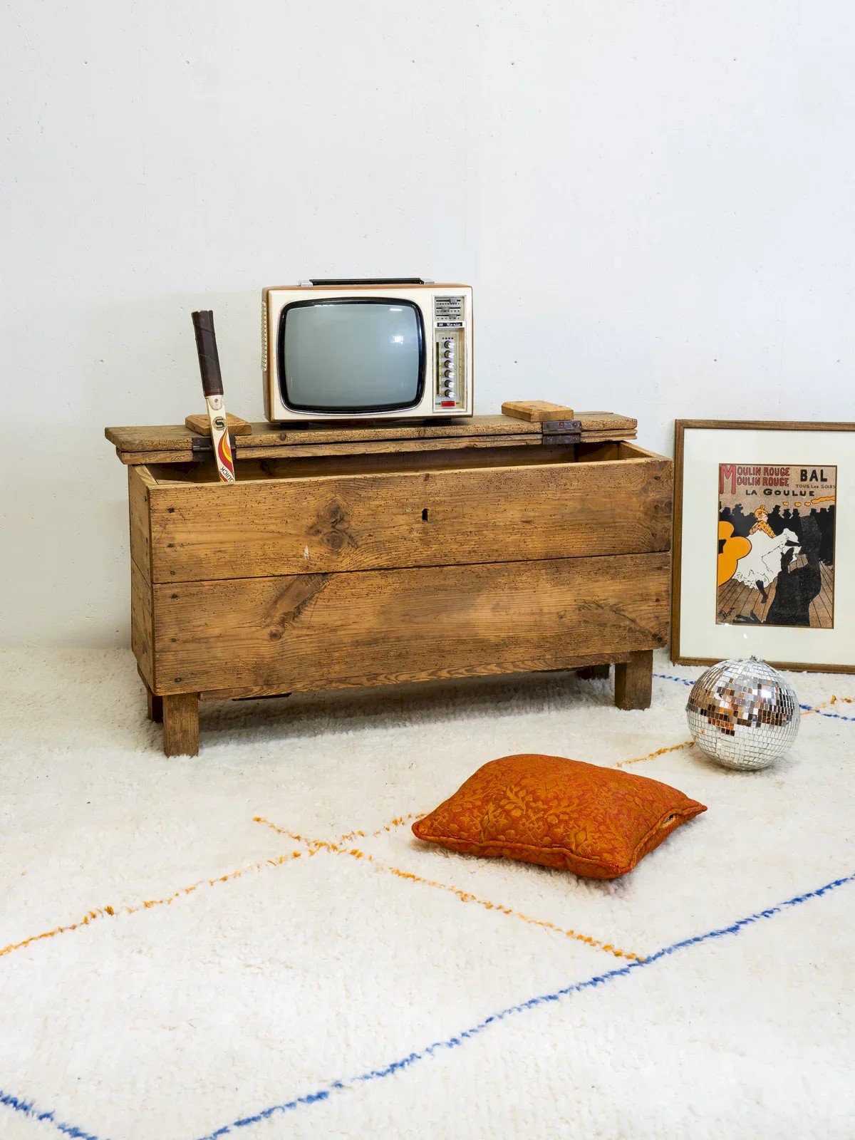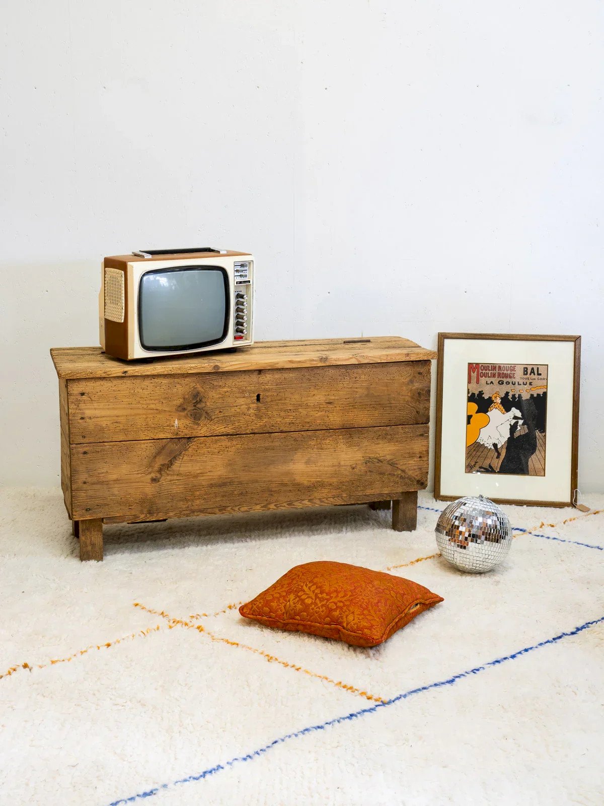 Adopt this wooden chest on legs, with a sleek design and proportions that fit perfectly in an entrance, at the foot of the bed, or as a side table. Its internal volume offers generous and practical storage. The wood emphasizes a natural and bright aesthetic, inviting a sober and warm ambiance at home, while the decorative lock is not functional. There are a few signs of time that tell its story. Length: 105 cm Width: 31.5 cm Height: 54 cm Depth: 38 cm Weight: 25 kilograms Condition: Used: Item that has been used. Item showing some superficial wear marks, fully operational and functioning correctly. It may be a demonstration model or an item returned to the store after a short period of use. the possible imperfections. Brand: Debongout Type: Curated product Material: Wood Style: Country