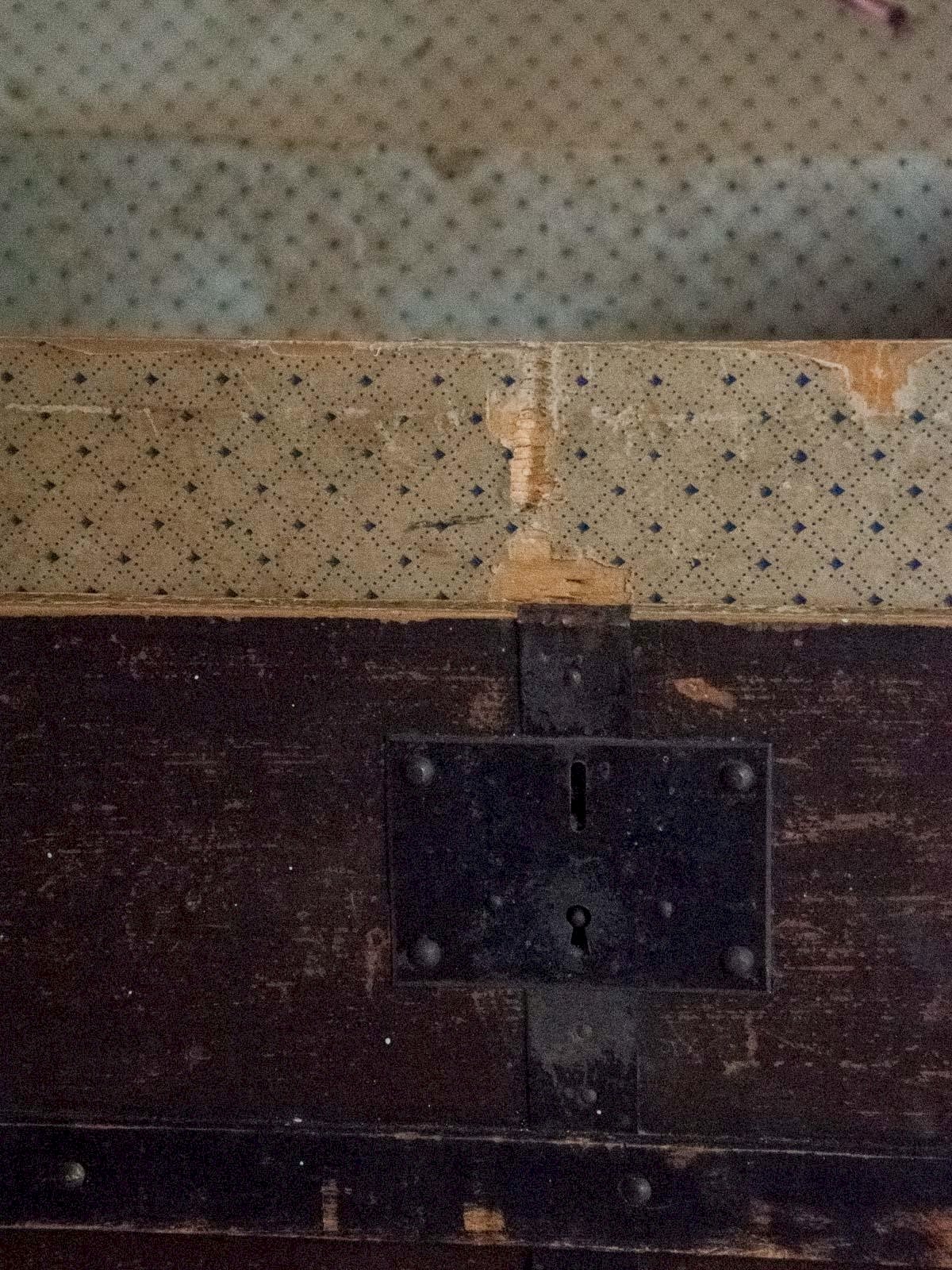 Invite a spirit of adventure into your home with this very large wooden travel trunk, adorned with black metal details and a rounded lid that gives it a unique silhouette. Its generous volume and compartmentalized fabric interior make it ideal for storing linens, books, or blankets, while it can also serve as a bar or decorative element in a living room or entryway. The blend of wood and metal adds a vintage and industrial touch that is warm and elegant. Some signs of use contribute to its authenticity. Length: 87 cm Width: 53.5 cm Height: 64 cm A brief history of the trunk: One of the oldest known trunks dates back to the golden age of Egyptian pharaohs. Numerous chests have indeed been found in the tomb of Tutankhamun. Even the Greeks and Romans used them on all significant journeys. At that time, the trunk was a wooden and bronze chest, sometimes adorned with ivory and precious metal ornaments. The lid was flat to allow for stacking trunks in the means of transport used. Upon the discovery of America in 1492, trunks filled with all the new fruits and products from the New World crossed the ocean to reach the Old World. The industrial revolution swept through the 19th century with the beginning of a new concept of travel trunks. Little by little, the chest found its place in interiors, becoming the perfect container for childhood souvenirs or a practical coffee table! Condition: Used: Item has been used. Item showing some superficial signs of wear, fully operational and functioning correctly. It may be a demonstration model or an item returned to the store after a short period of use. Possible imperfections. Brand: Debongout Type: Vintage product Material: Wood, Metal Style: Country