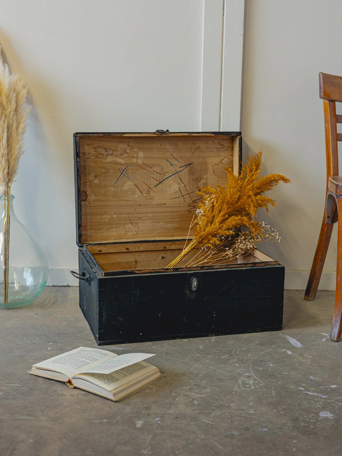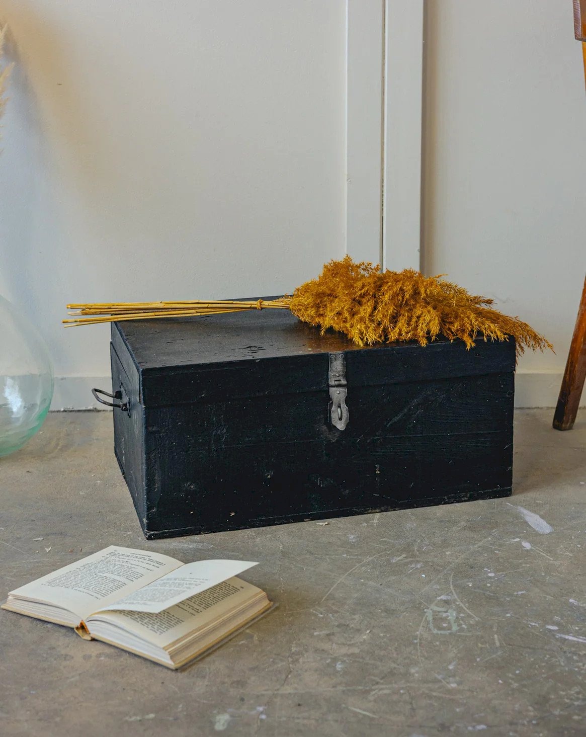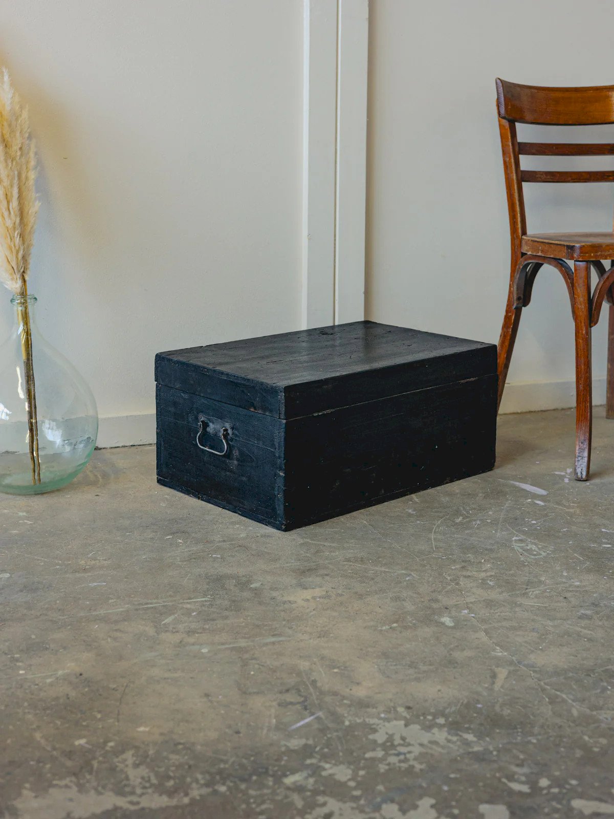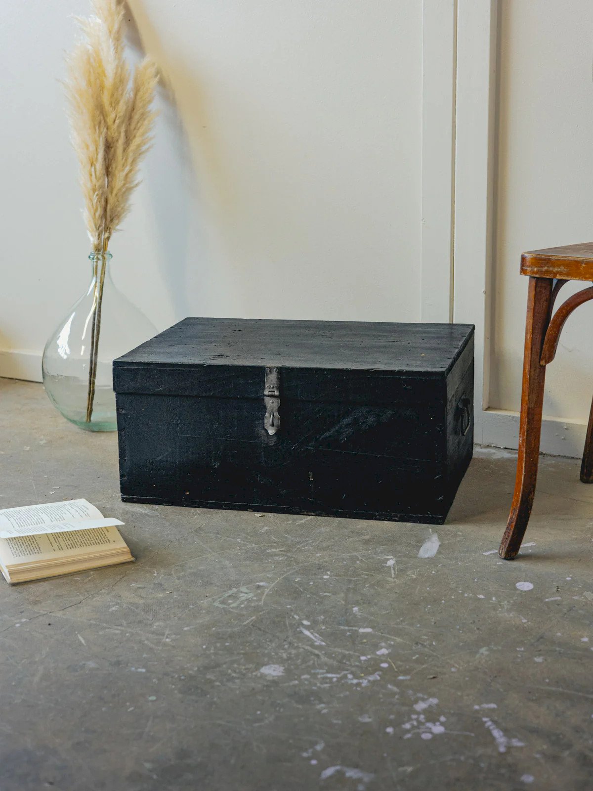 Bring this black trunk with a sleek finish into your home for both a practical and aesthetic touch. Its two side metal handles make transportation easy, and the metal strap that fits on top guarantees a reliable and stylish closure. Its design, intended to hold blankets, documents, or small everyday items, makes it a versatile element to enhance the entryway, living room, or bedroom, creating a refined and welcoming atmosphere. Length: 58 cm Width: 38 cm Height: 26 cm Total height, when open: 57 cm Condition: Used: An item that has been used. Item showing some superficial signs of wear... Used: An item that has been utilized. Item showing some superficial signs of wear, fully operational and functioning correctly. It may be a display model or an item returned to the store after a short period of use. any potential imperfections. Brand: Debongout Type: Thrifted product Material: Wood, Metal Style: Country
