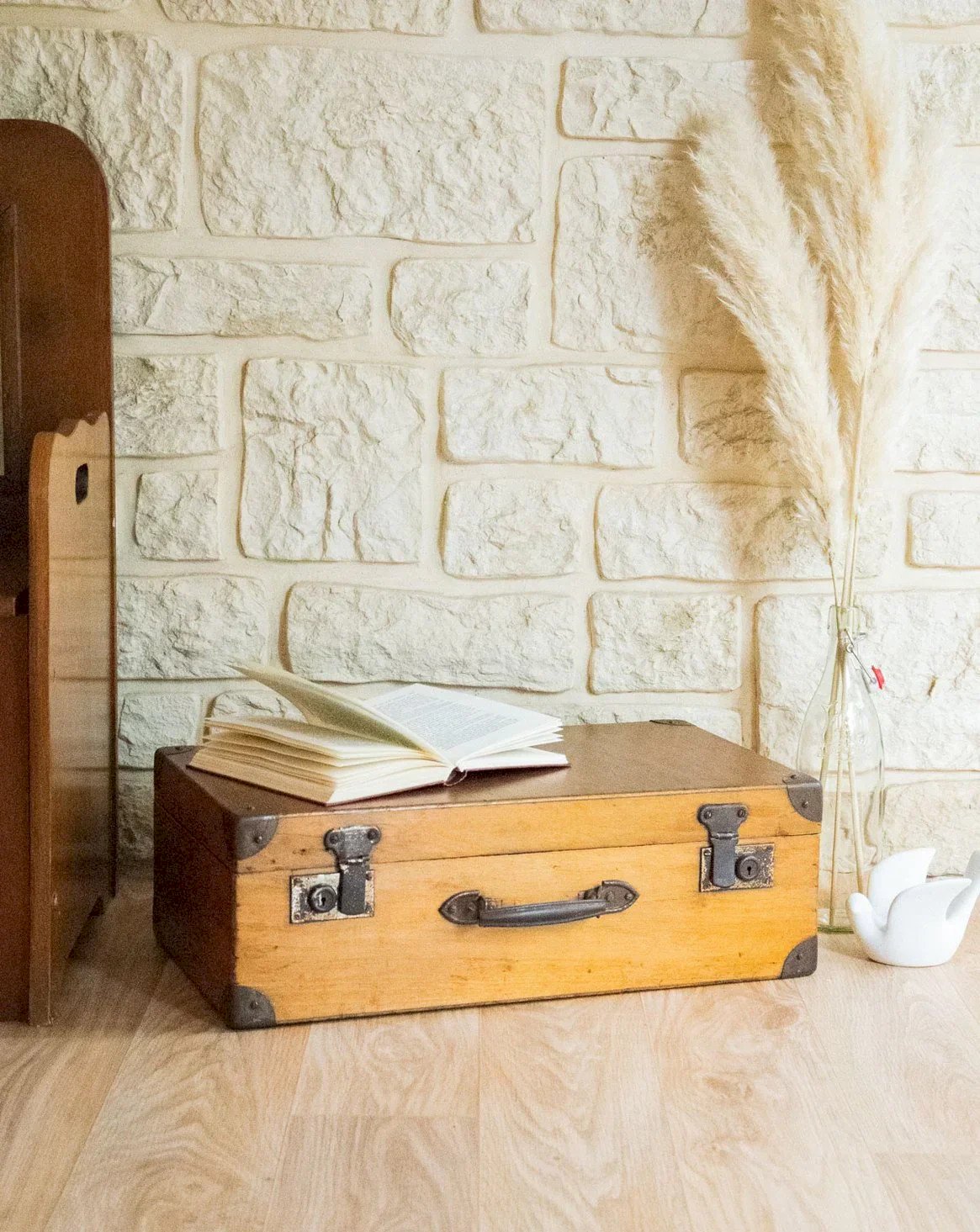 Give your interior a vintage wooden suitcase, enhanced with metal handles and corners that give it a beautiful personality. Its interior capacity and compact proportions make it a smart storage solution or an original side table, perfect for an entryway, living room, or bedroom with a style evoking travel and discovery. Its natural patina adds warmth and authenticity to your decor. Slight signs of wear are present. Length: 55 cm Width: 42.7 cm Height: 31.5 cm Drawer height: 13 cm Condition: Used: Item has been used. Item shows some superficial signs of wear, fully operational and functioning properly. It may be a display model or an item returned to the store after a short period of use. Any possible imperfections. Brand: Debongout Type: Vintage product Material: Wood, Metal Style: Country