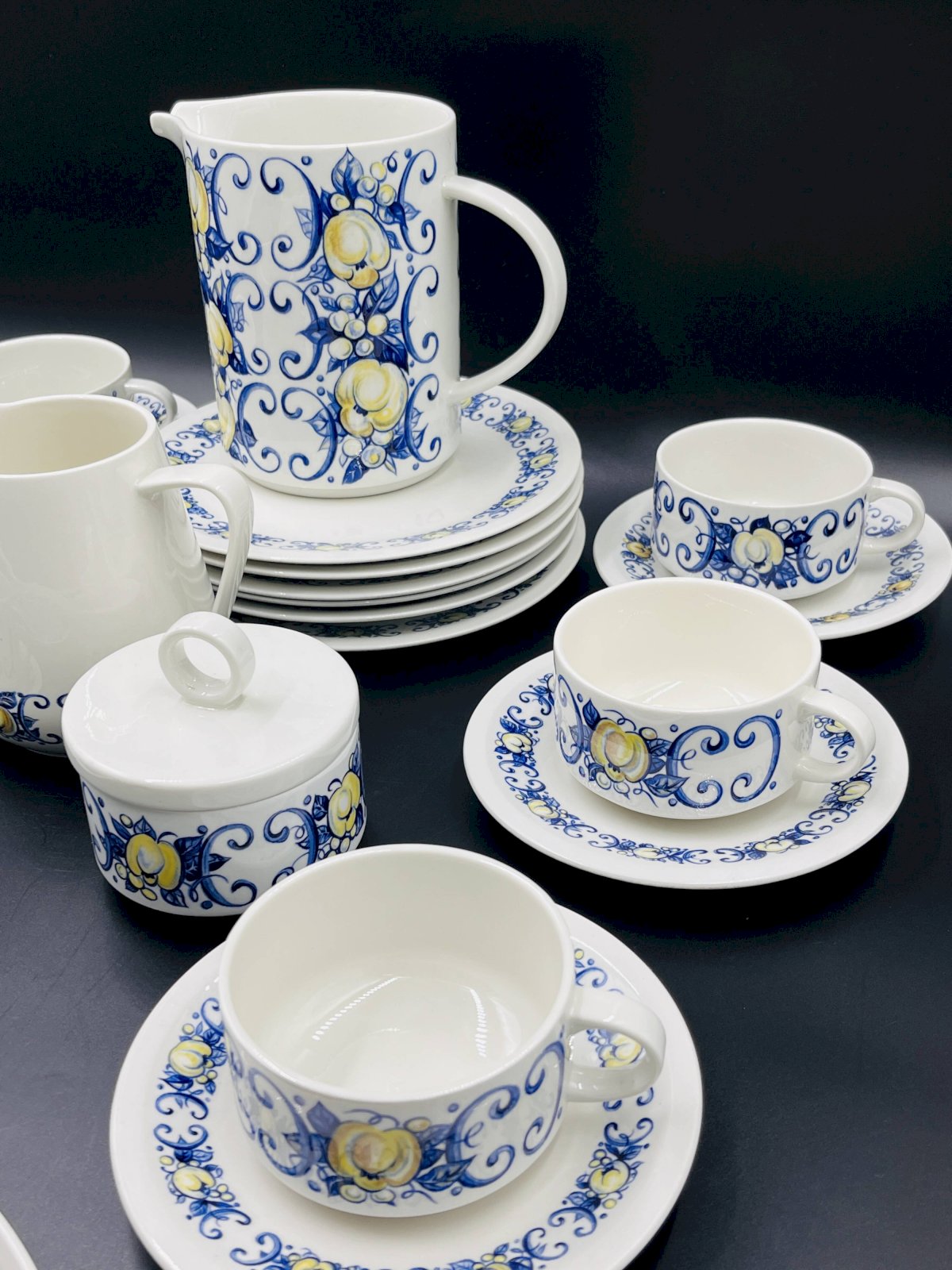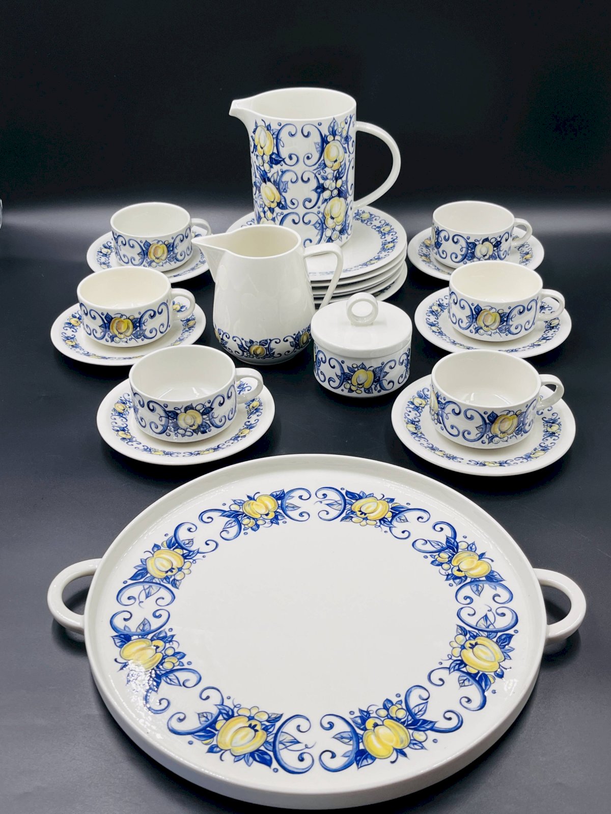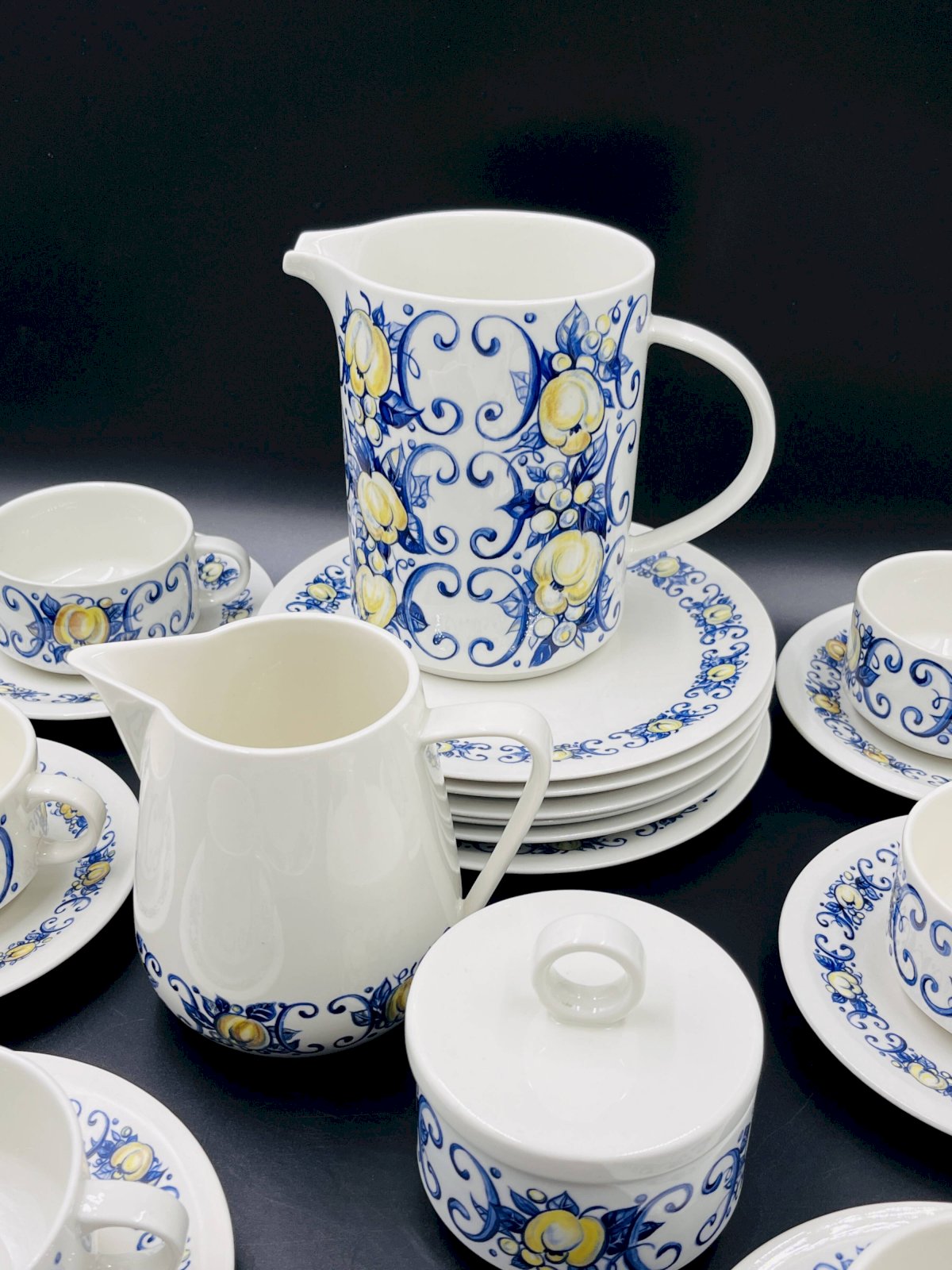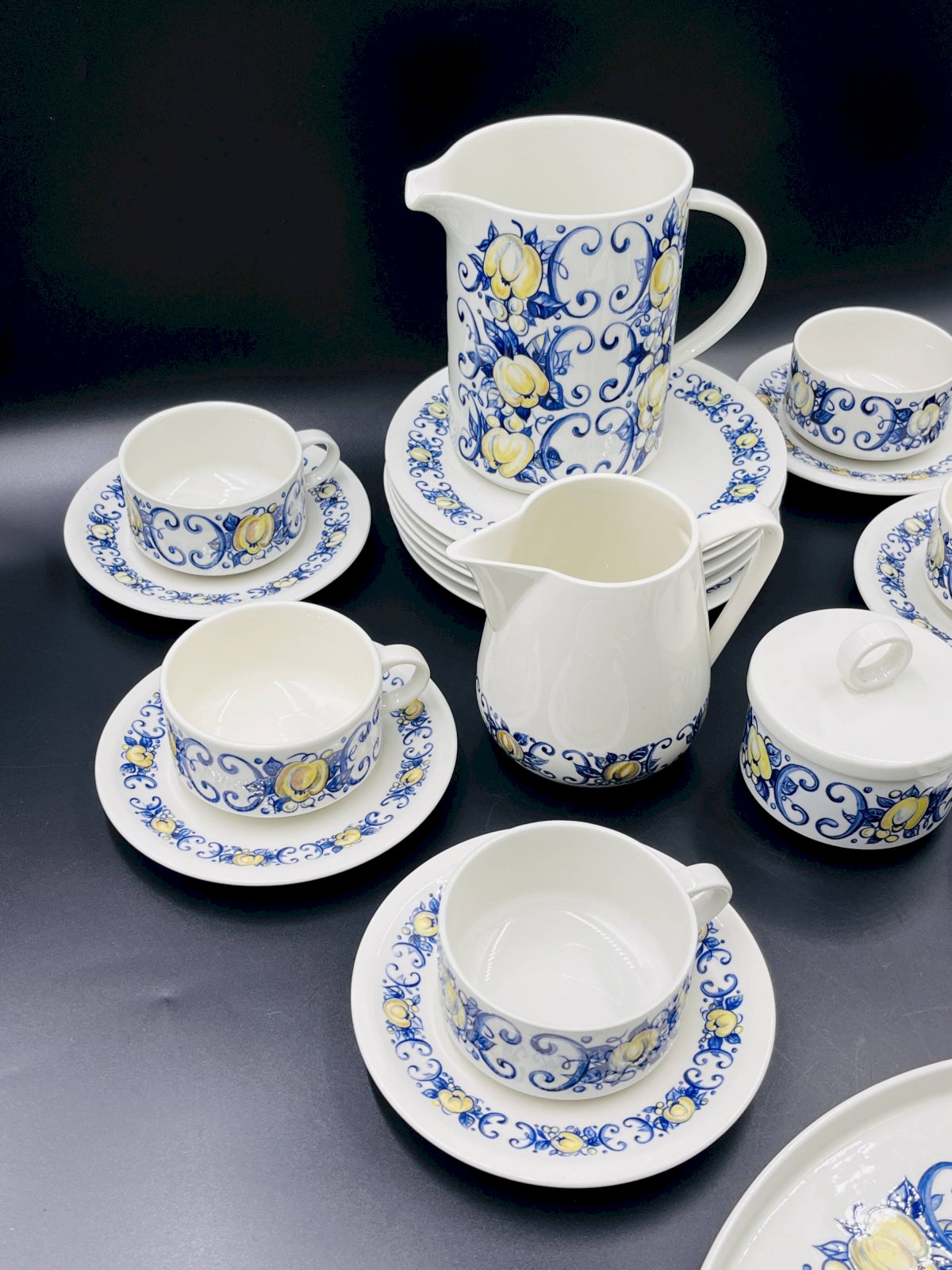 This beautiful porcelain set, made in Luxembourg, is adorned with delicate floral patterns in blue and yellow, evoking a classic and refined aesthetic.