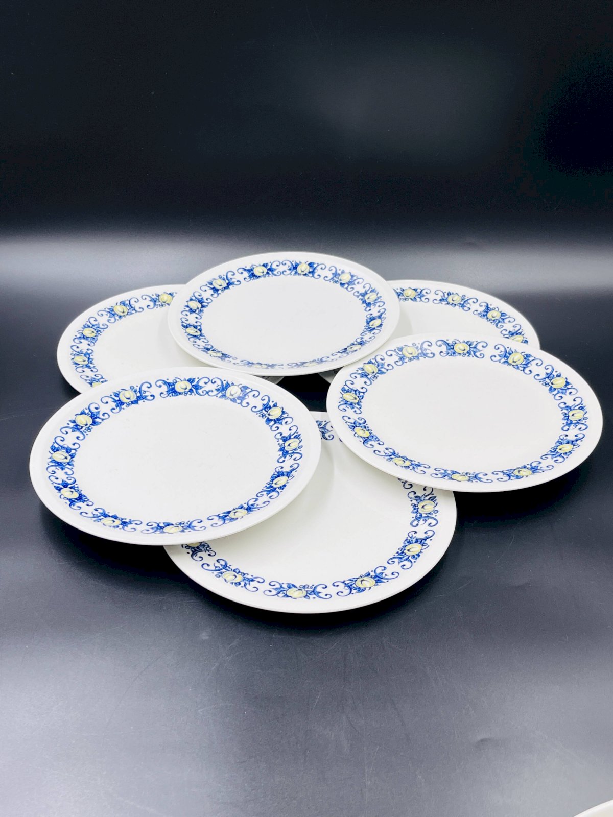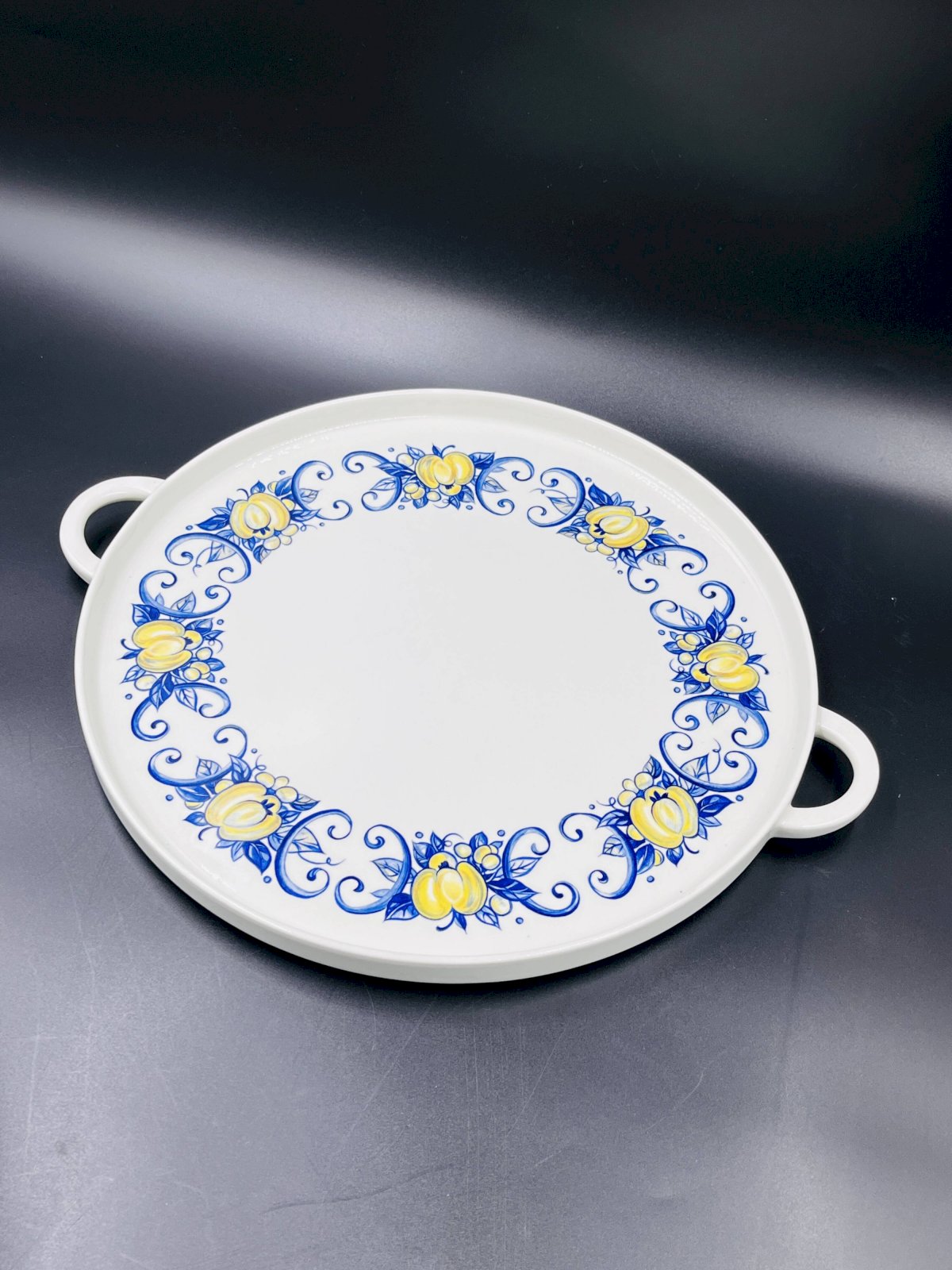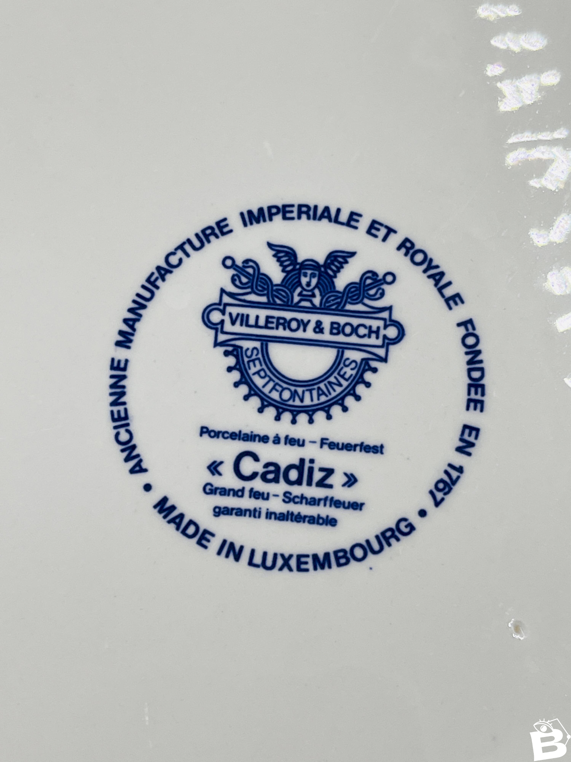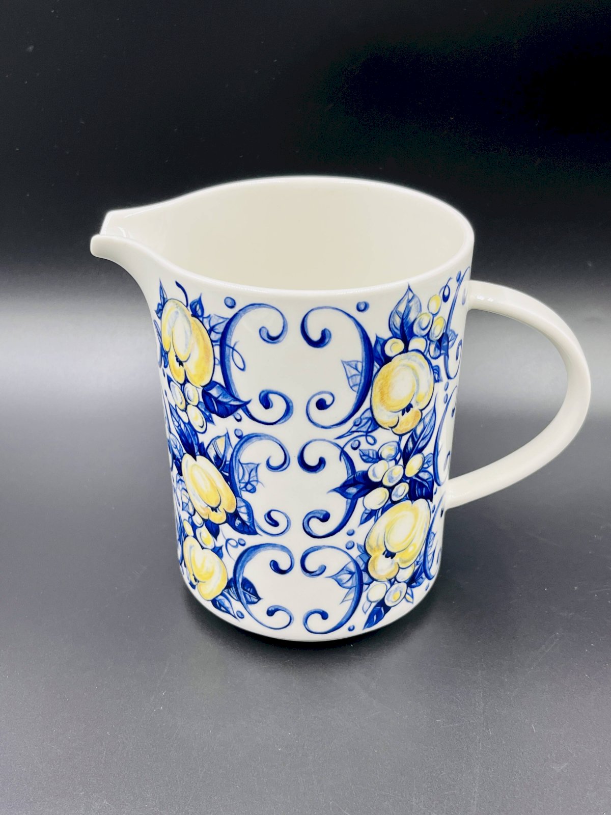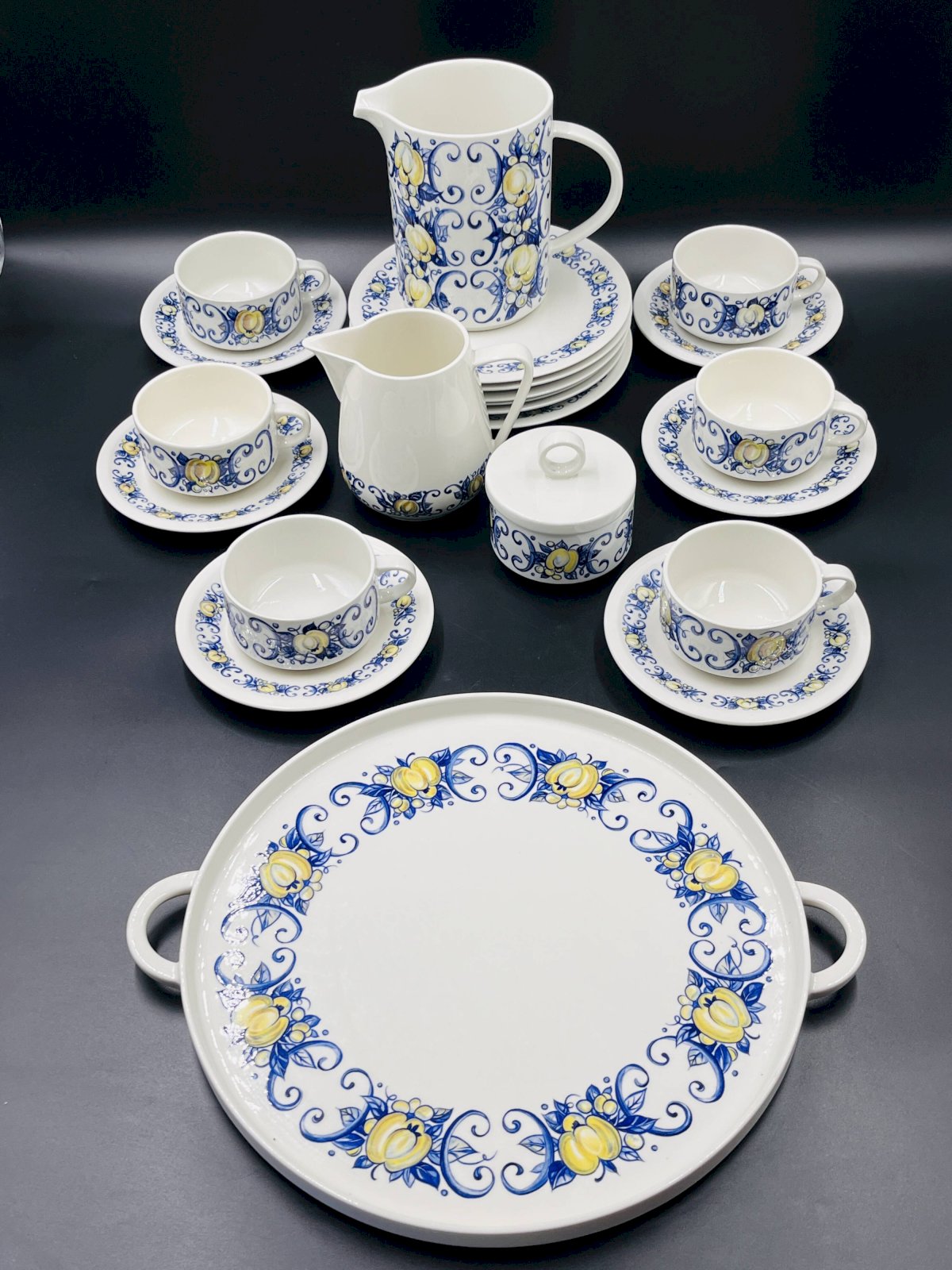 This beautiful porcelain set, made in Luxembourg, is adorned with delicate floral patterns in blue and yellow, evoking a classic and refined aesthetic.