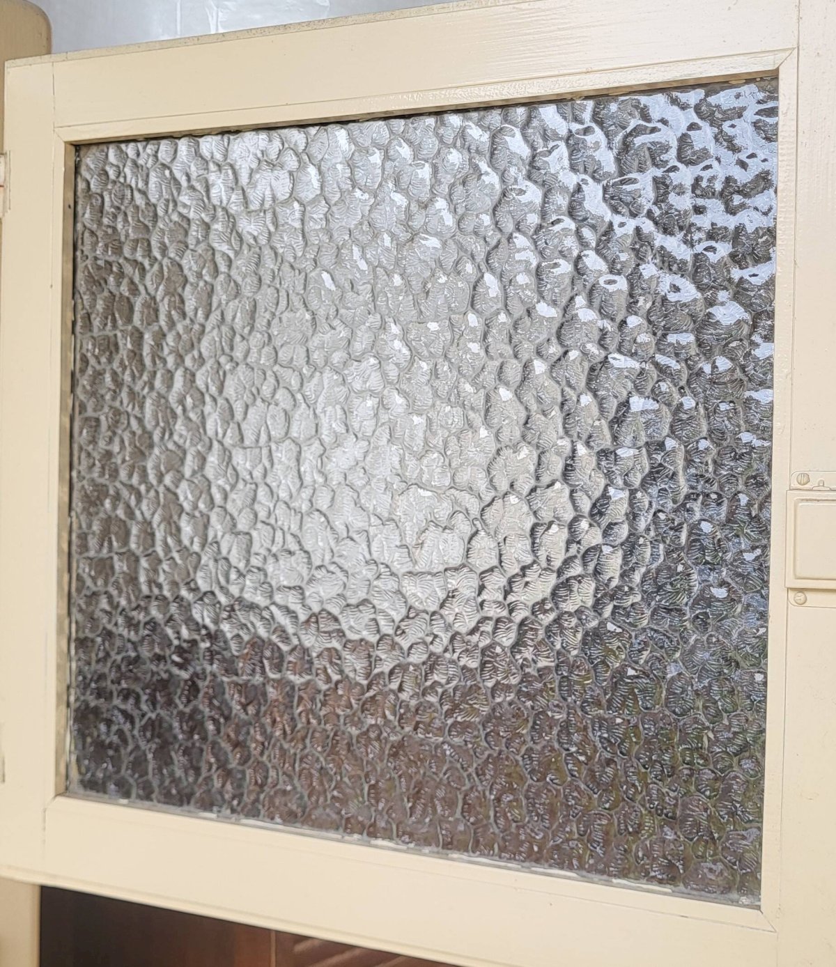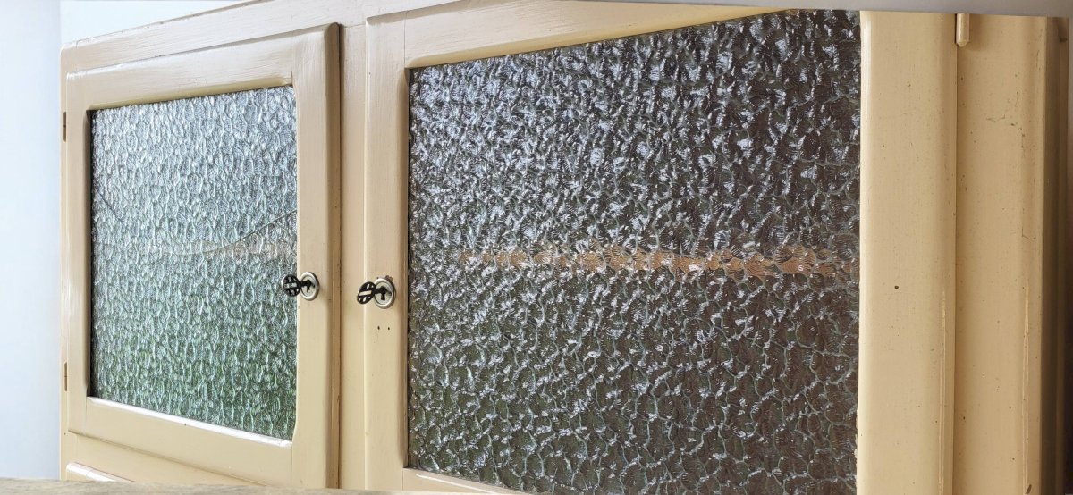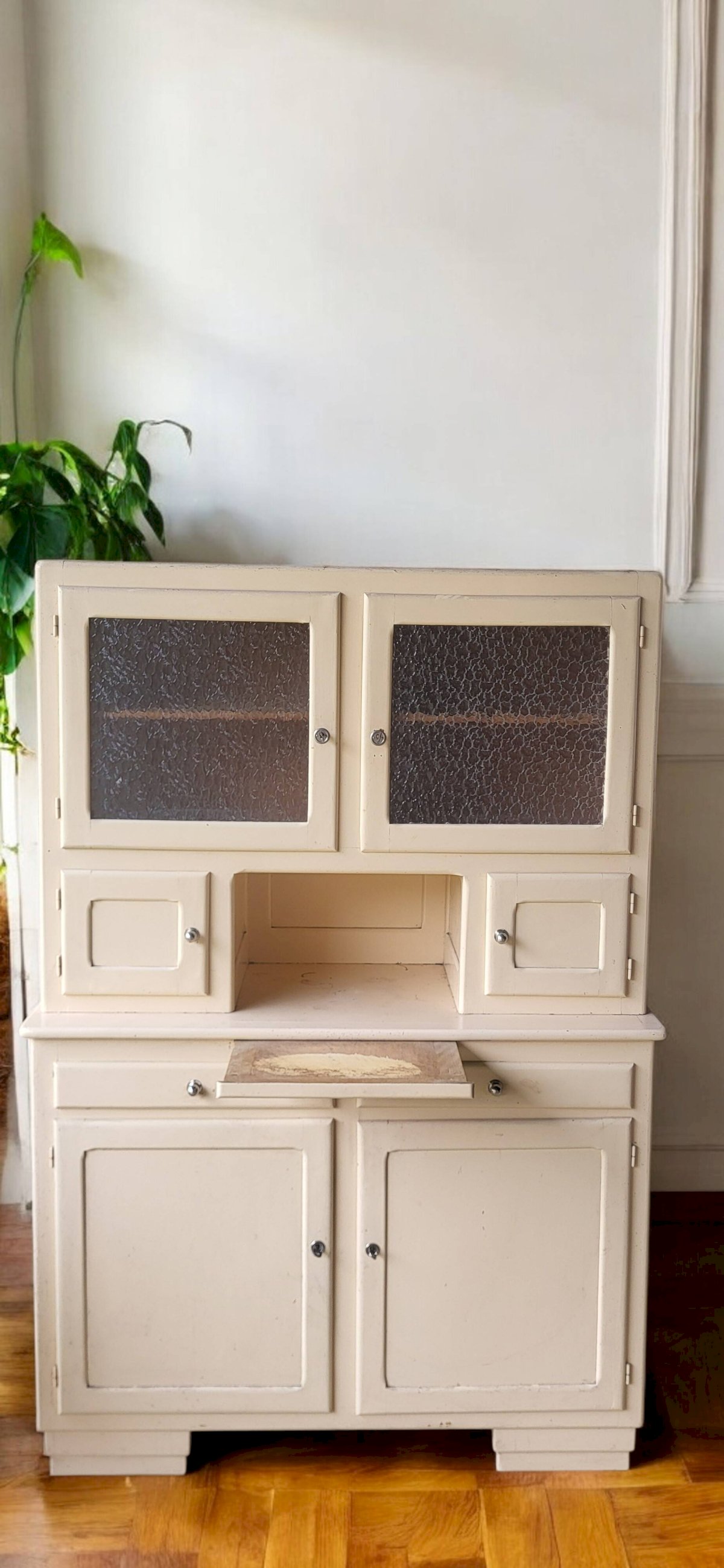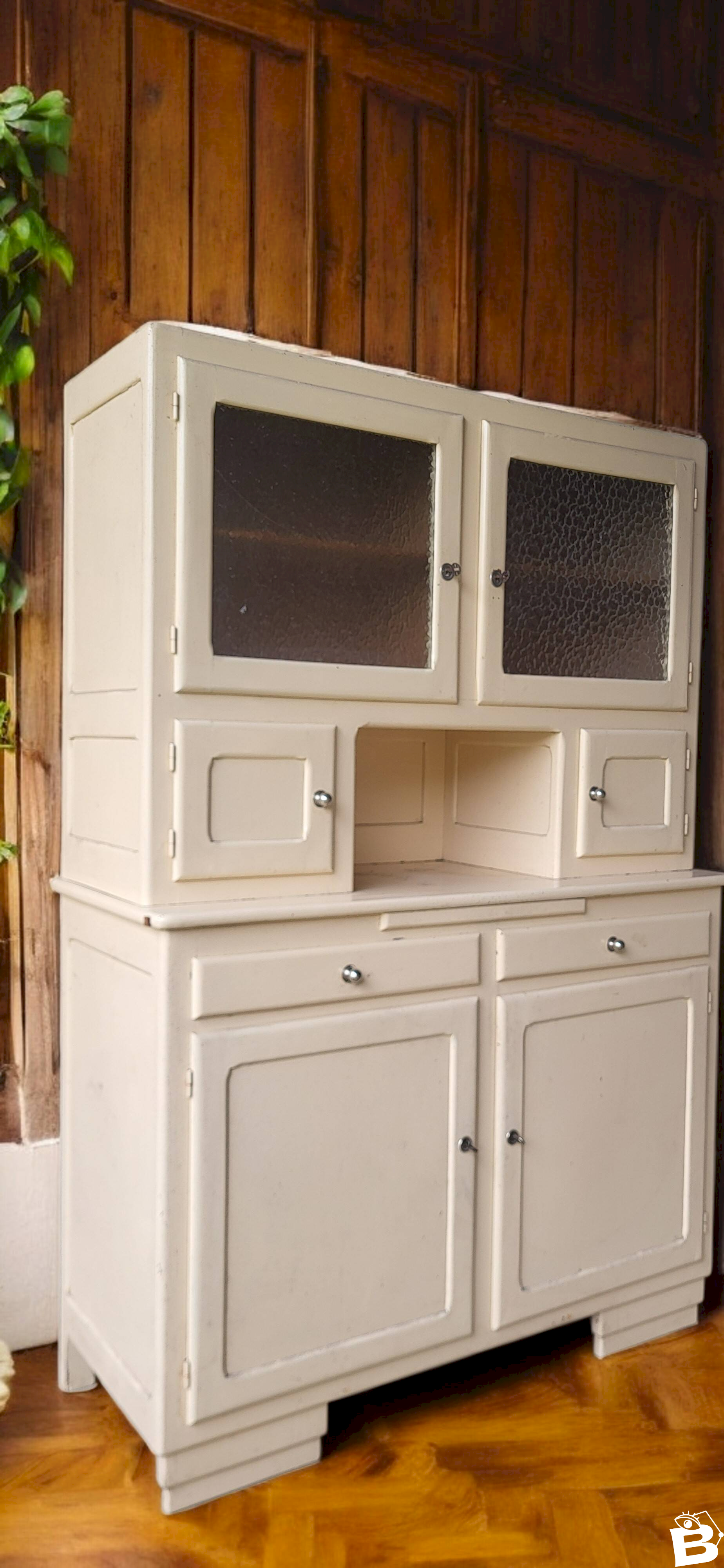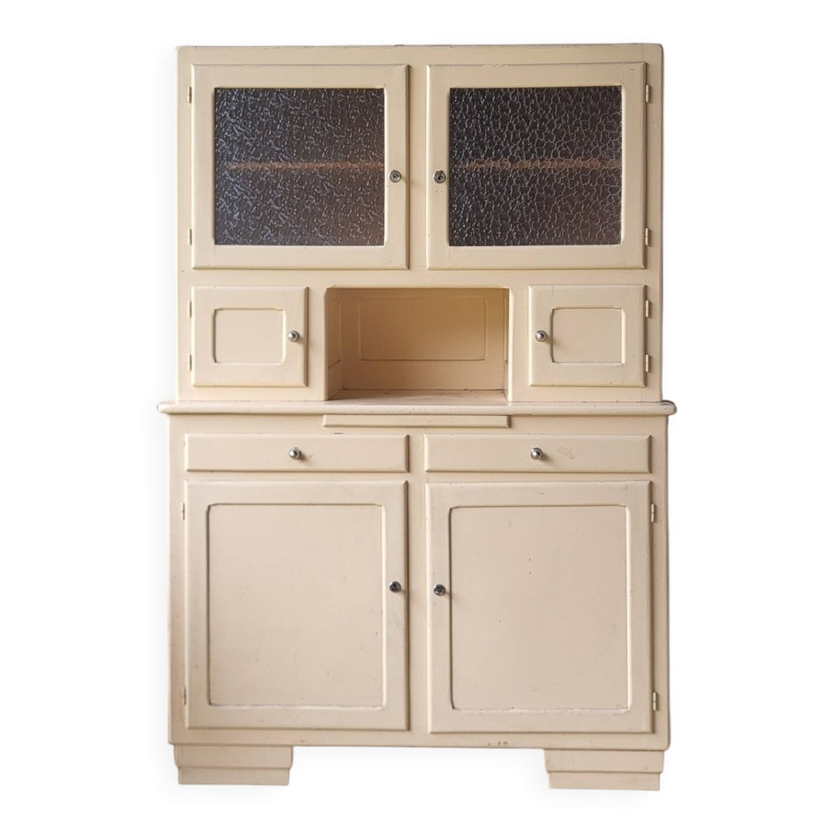 Mado buffet in cream painted wood. Width 160 cm, height 166 cm, depth 48 cm. Of good size, this piece of furniture is typical of the 1950s... a classic. The upper part is glazed, and it's worth noting that the left glass is cracked (see photo).