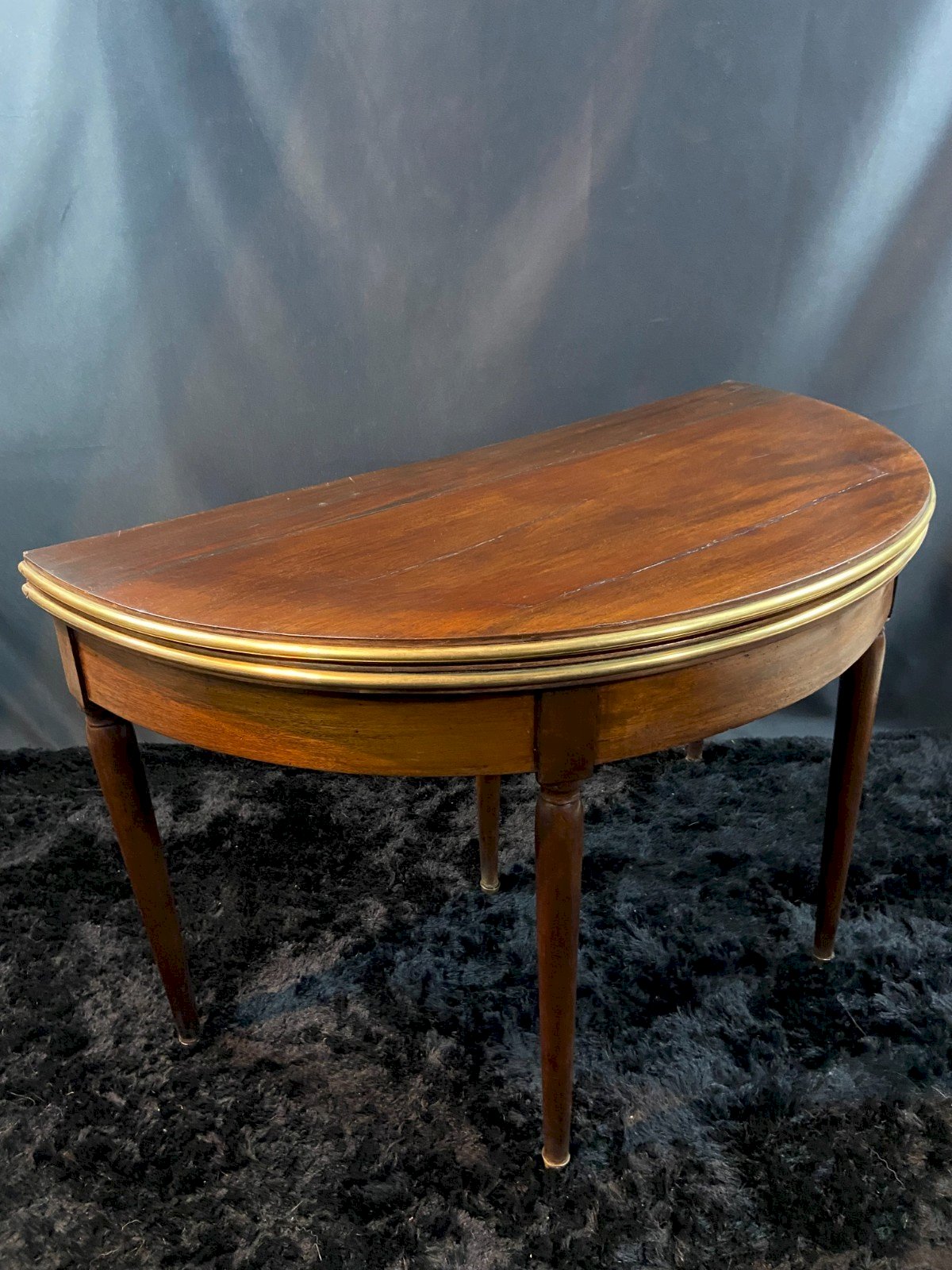 Half-moon mahogany table from the late Louis XVI period, forming a gaming console table from the 18th century. The top opens to reveal an interior surface covered with green felt. The edge is enhanced with a wide brass border. The tapered legs rest on bronze caps. Dimensions: - in folded configuration: Height 70 x span 109 x 54 cm - in deployed configuration: Height 67.8 x diameter 109 cm. I note the presence of small cracks on the surface of the top, various small usual marks, as well as slight superficial stains on the felt. There is a missing veneer at the back, at the thickness of a top. Free withdrawal possible in the historic center of Bourges (Notre-Dame Church). - Orders are left at the foot of your home. - Dimensions are always specified: no disputes will be accepted if the piece does not fit in your staircase or if your ceiling is too low... for example. - Specific delivery rates apply for islands: Corsica, Sardinia, Sicily, Balearic Islands......... - Delivery times are generally very short for all major metropolitan areas. - These may be extended for extremely isolated destinations and particularly poorly served areas: do not hesitate to contact me beforehand. Type: Table Period: 19th century and before Country of origin: France Sub-type: Console Style: Louis XVI Material: Mahogany Shape: Half-moon