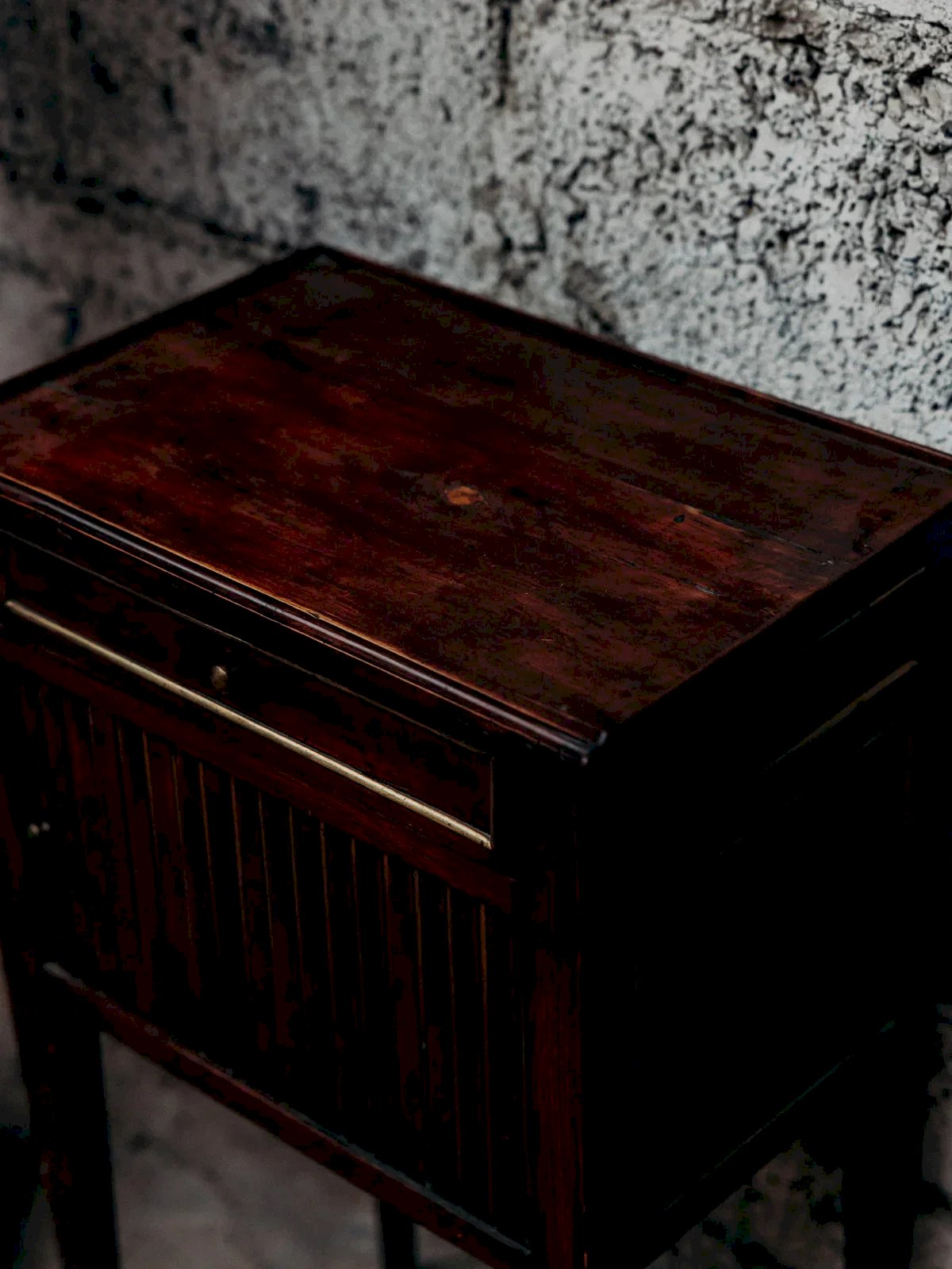 Discover this elegant mahogany bedside table with a vintage design, featuring a drawer highlighted by a delicate golden trim. It also has a practical sliding cabinet for storing your everyday items. Its tall and slender legs give it a light and refined silhouette. Perfect as a nightstand or end table, it adds a retro chic touch to your interior. A piece that is both functional and decorative. Length: 42 cm Width: 29 cm Height: 73 cm Drawer height: 6 cm Sliding cabinet height: 29 cm A brief history of the bedside table The term "bedside table" has referred since the Middle Ages to a small piece of furniture placed next to the bed. Initially designed as a support for a lamp or personal items, the bedside table has evolved over time to include drawers and shelves. Essential in the bedroom, it now combines functionality and design, adapting to all interior styles. Condition: Used item. Item shows some signs of superficial wear, fully operational and functioning correctly. It may be a demonstration model or a return item after a short period of use. Any imperfections. Brand: Debongout Type: Thrifted product Material: Wood, Mahogany Style: Contemporary Customizable: Bedside tables