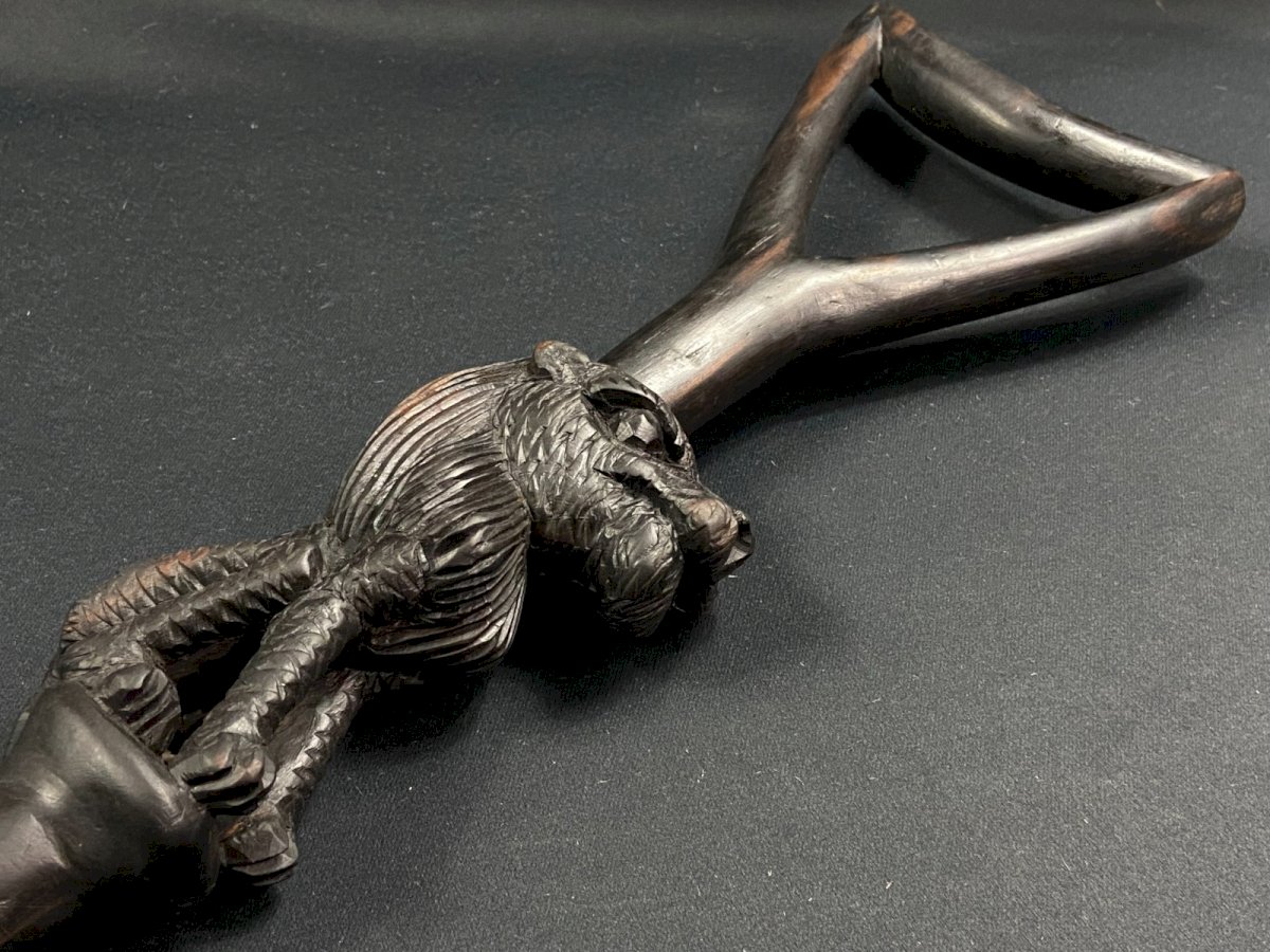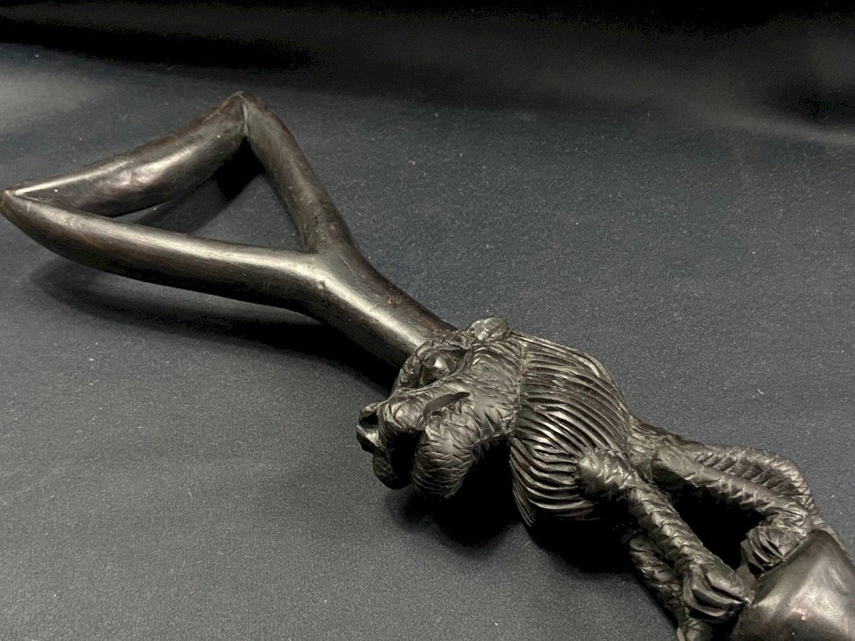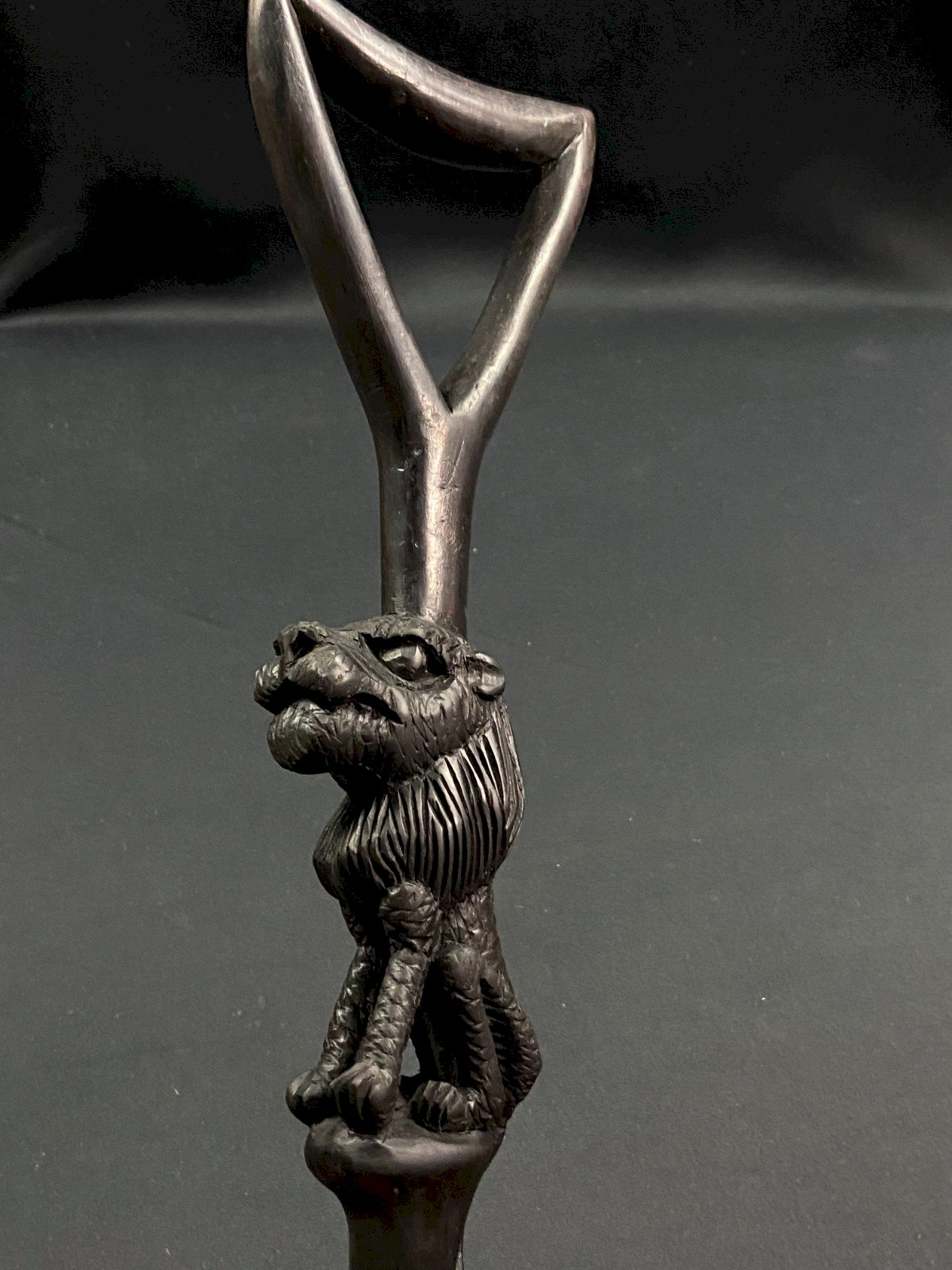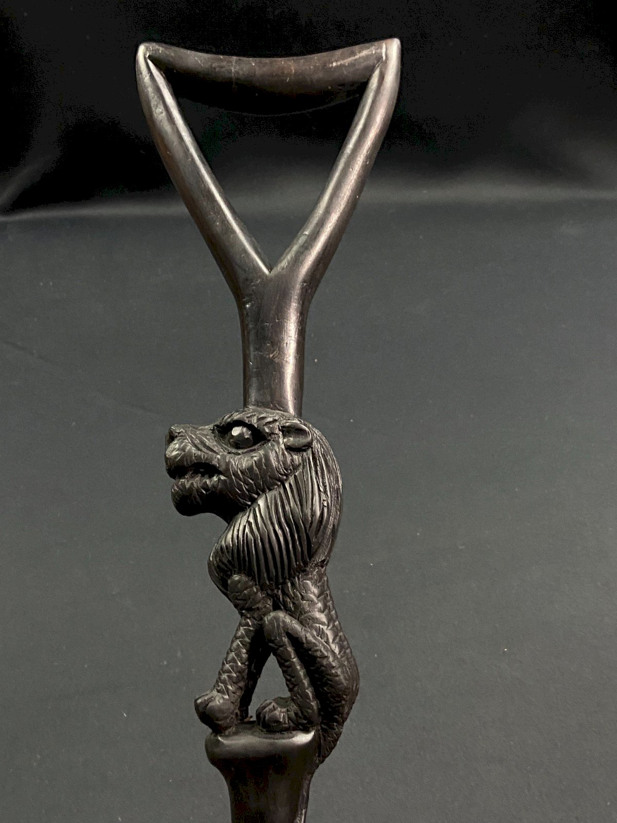 Makonde ceremonial cane from Tanzania in carved ebony featuring a lion, shaped from a single piece with a Y-shaped handle. Straight shaft, well-polished with a conical end. Max dimensions: Length 95 x 12.5 cm. Very nice density. Weight: 796 grams. A symbol of prestige for a chief or notable. Extremely careful shipping worldwide. Materials sourced from: United Republic of Tanzania. Authenticity: Original. Type: Cane. Origin: Africa. Material: Wood.