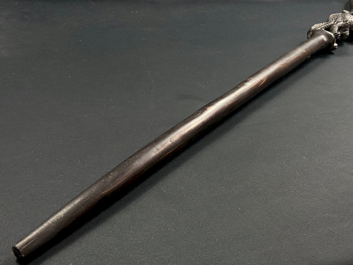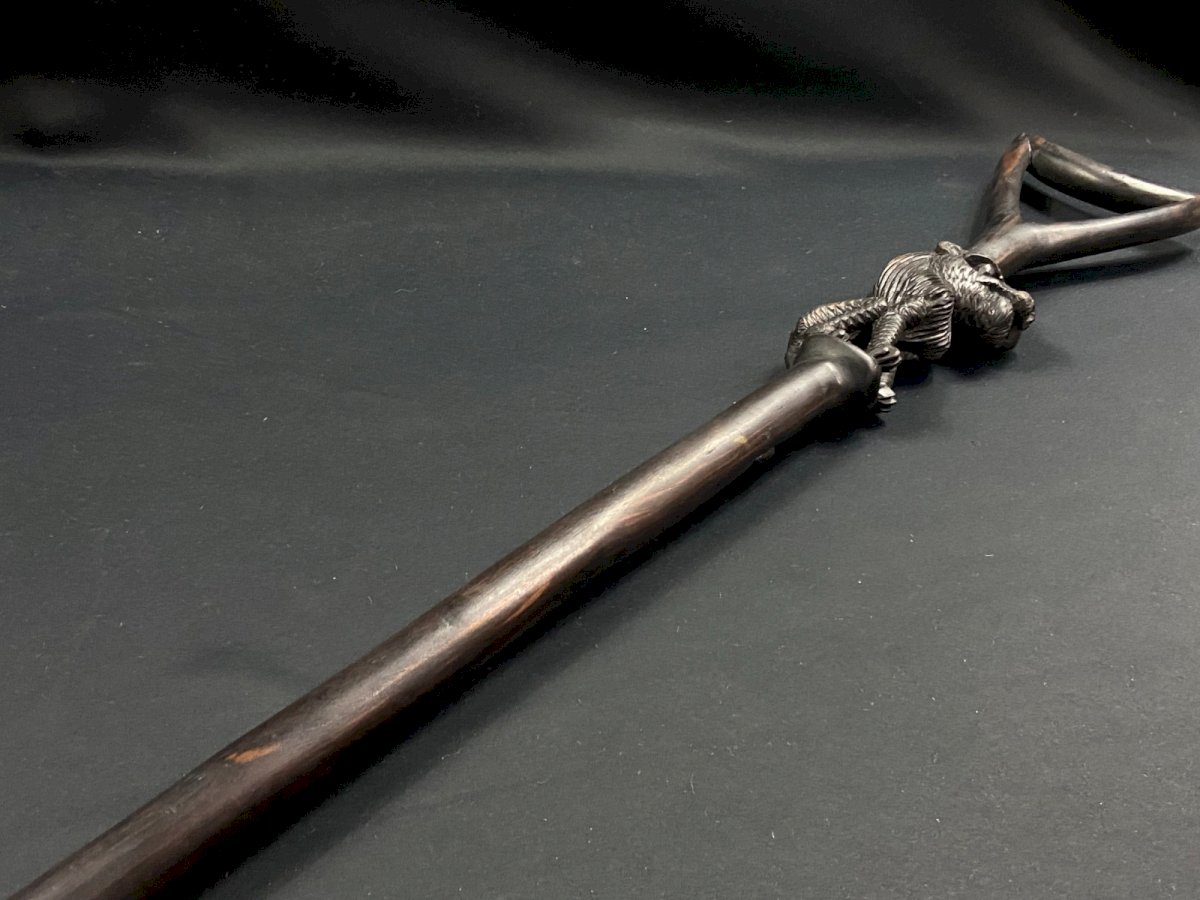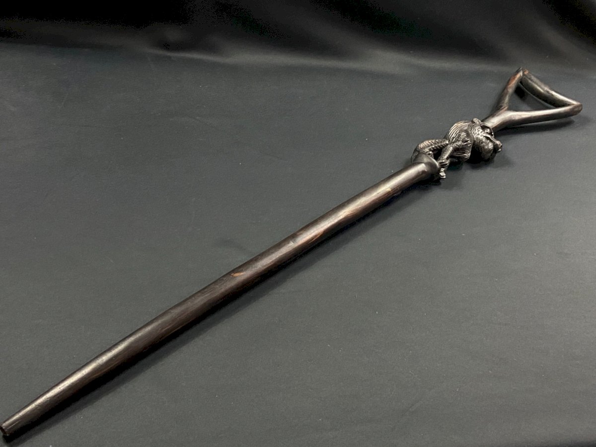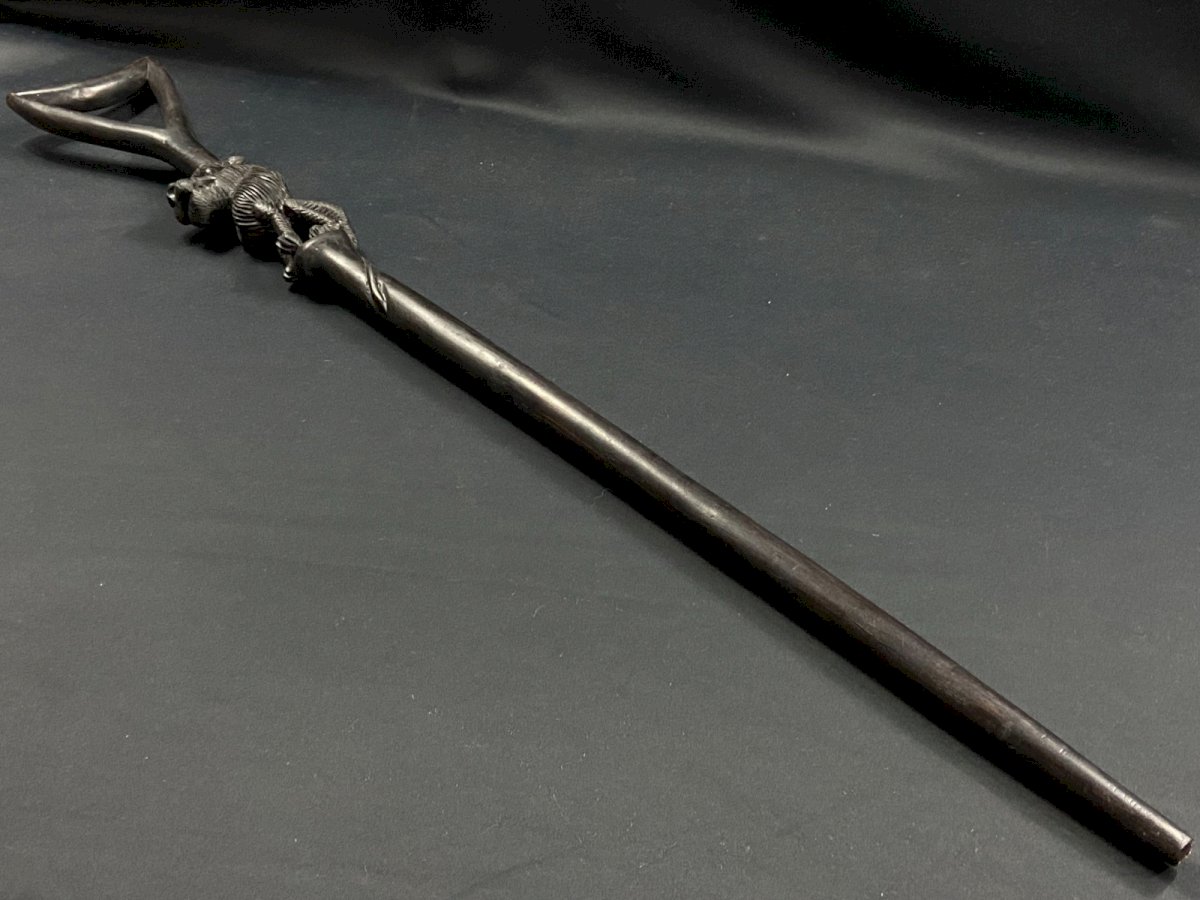 Makonde ceremonial cane from Tanzania in carved ebony featuring a lion, shaped from a single piece with a Y-shaped handle. Straight shaft, well-polished with a conical end. Max dimensions: Length 95 x 12.5 cm. Very nice density. Weight: 796 grams. A symbol of prestige for a chief or notable. Extremely careful shipping worldwide. Materials sourced from: United Republic of Tanzania. Authenticity: Original. Type: Cane. Origin: Africa. Material: Wood.