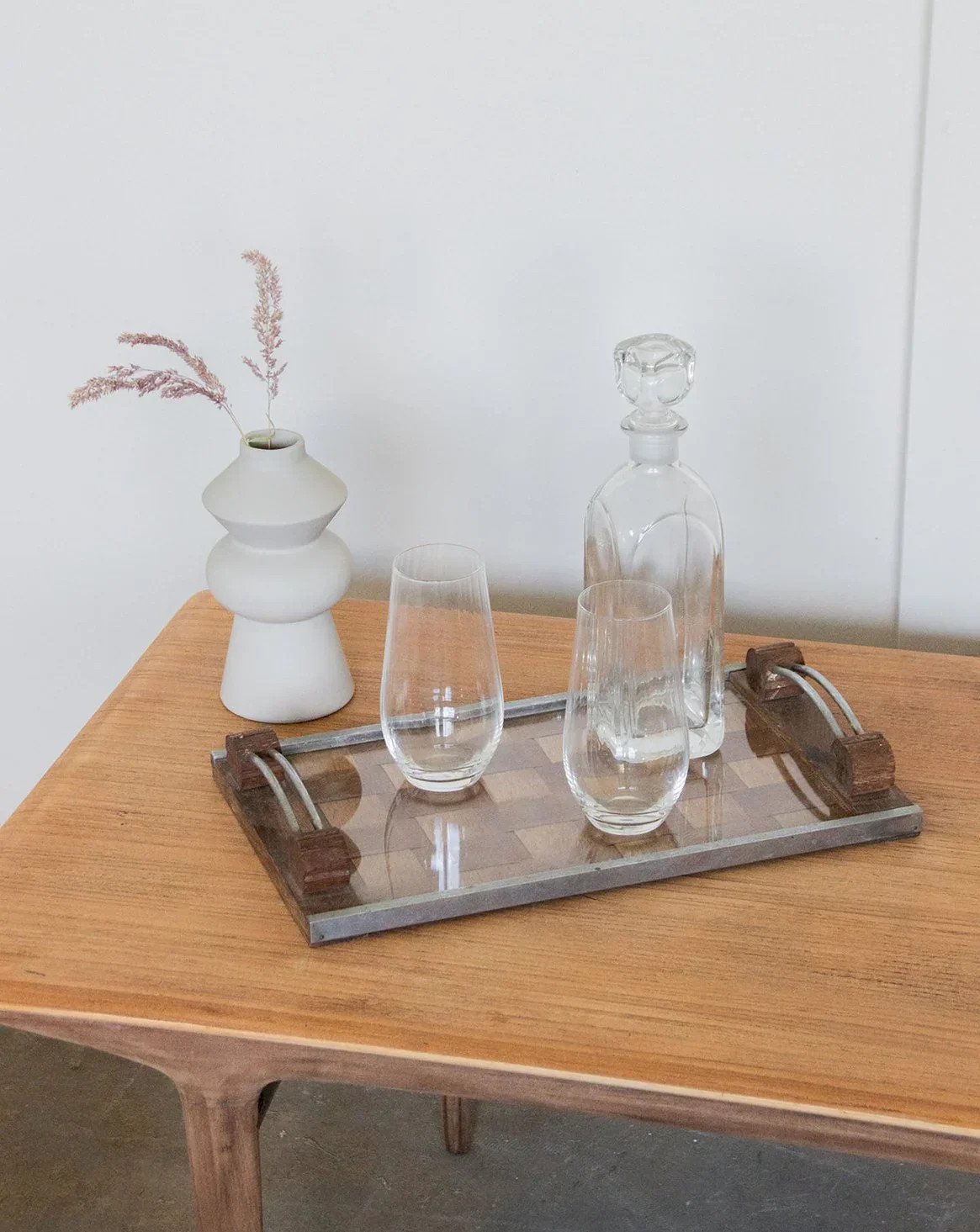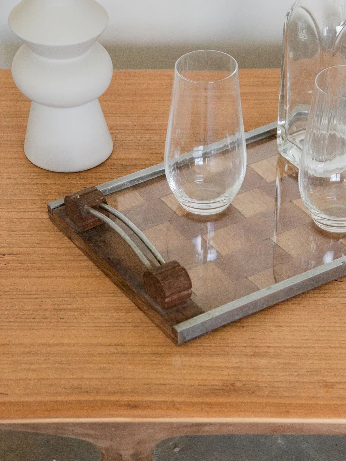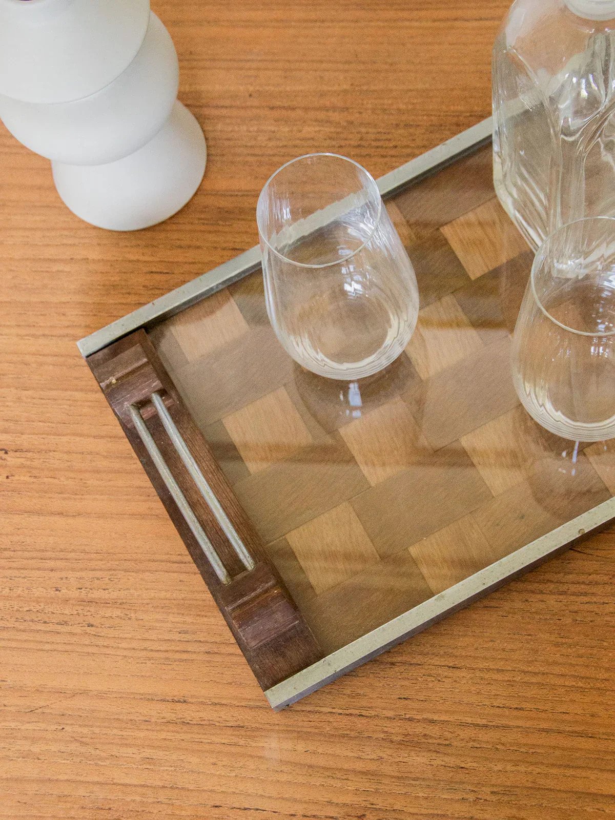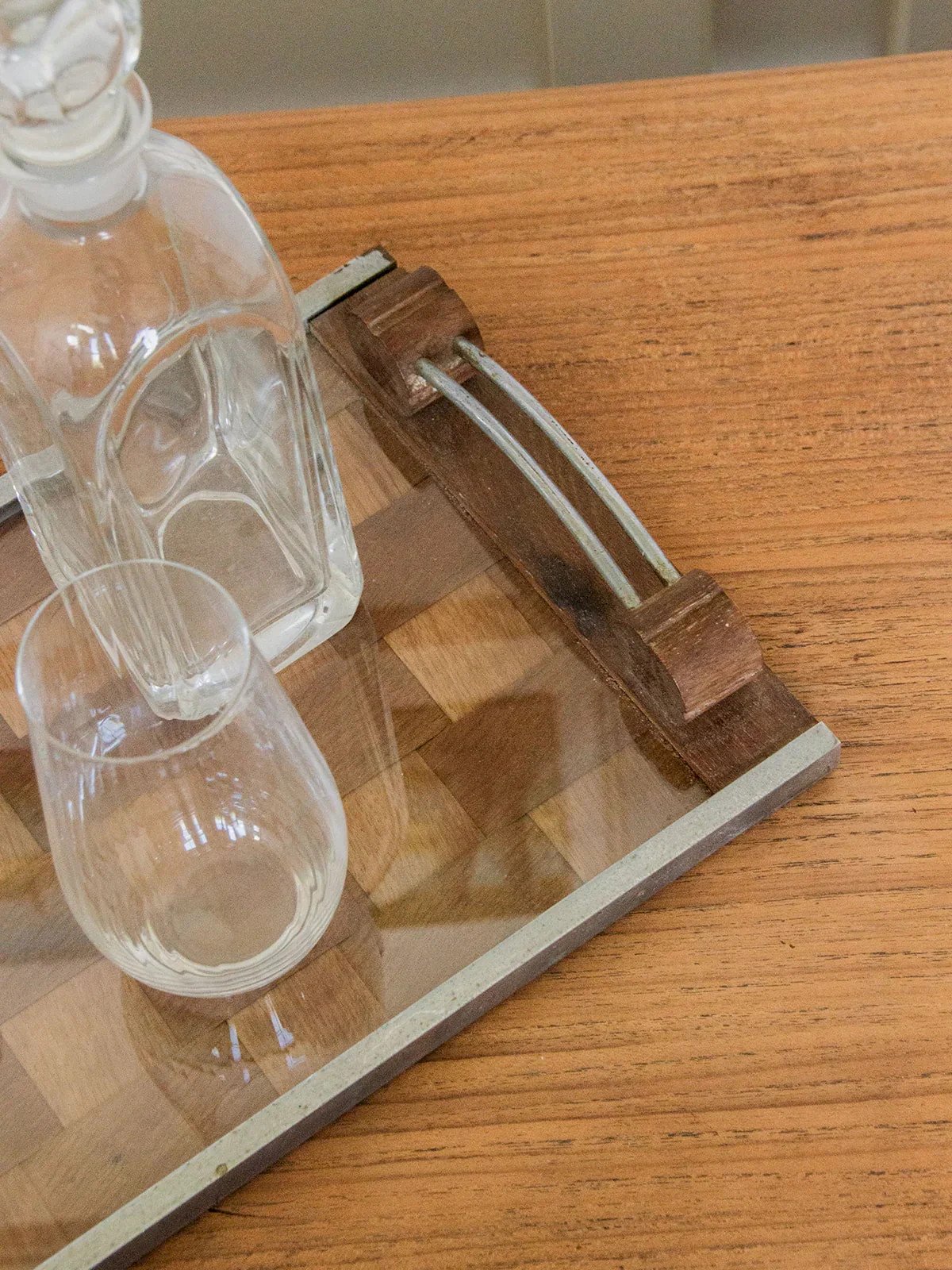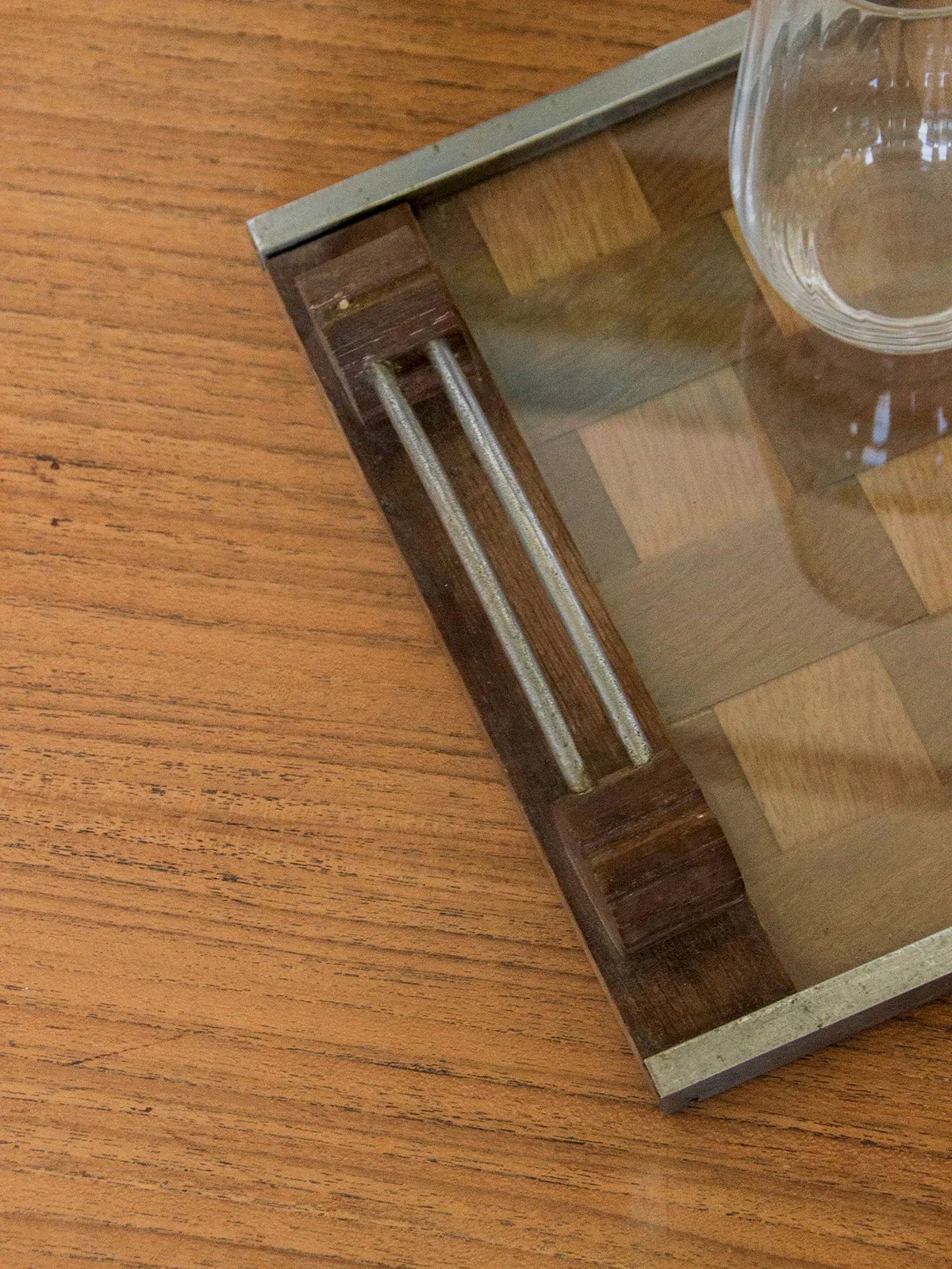 Discover this wooden tray, decorated with an elegant checkerboard pattern protected by a transparent glass. Its metal rim gives it an industrial and refined touch. The handles, combining wood and metal, provide a solid and aesthetic grip. Both practical and decorative, it is suitable for serving as well as displaying. A beautiful design object, perfect for enhancing your convivial moments. Length: 42 cm Height: 5 cm Depth: 25 cm Condition: Used: Item has been used. Item shows some signs of superficial wear, ... Used: Item has been used. Item shows some signs of superficial wear, fully operational and functioning correctly. It may be a demo model or an item returned to the store after a short period of use. any possible imperfections. Brand: Debongout Type: Curated product Material: Wood, Metal Style: Country