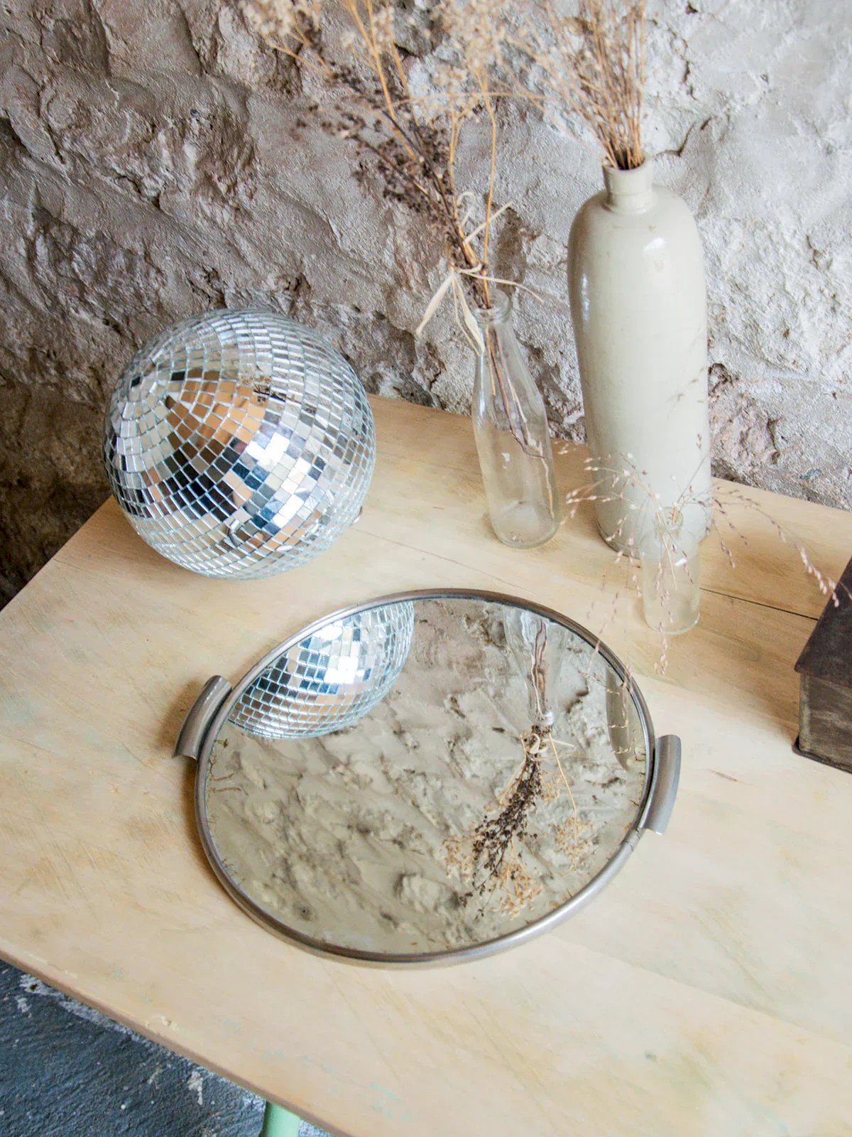 Discover this elegant mirror tray made of glass and metal, perfect for enhancing your interior decor. With its contemporary design and meticulous finishes, it brings a touch of elegance to any room. Ideal for displaying your decorative objects or serving your appetizers in style, this tray combines functionality and aesthetics. A must-have for lovers of refined decoration. Online exclusive, the meeting will take place at your home! Diameter: 30 cm Condition:Used: Item that has been used. Item showing some surface wear marks,...Used: Item that has been used. Item showing some surface wear marks, fully operational and functioning correctly. It may be a demonstration model or an item returned to the store after a short period of use. any possible imperfections. Brand: Debongout Type: Vintage product Material: Glass, Metal Style: Country