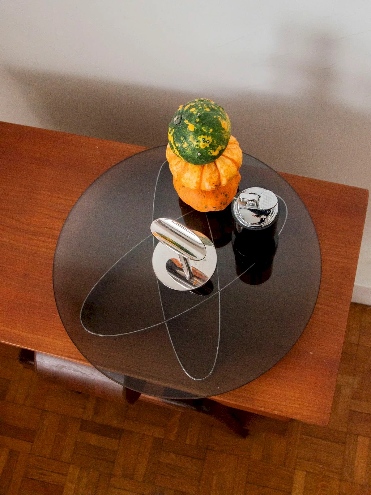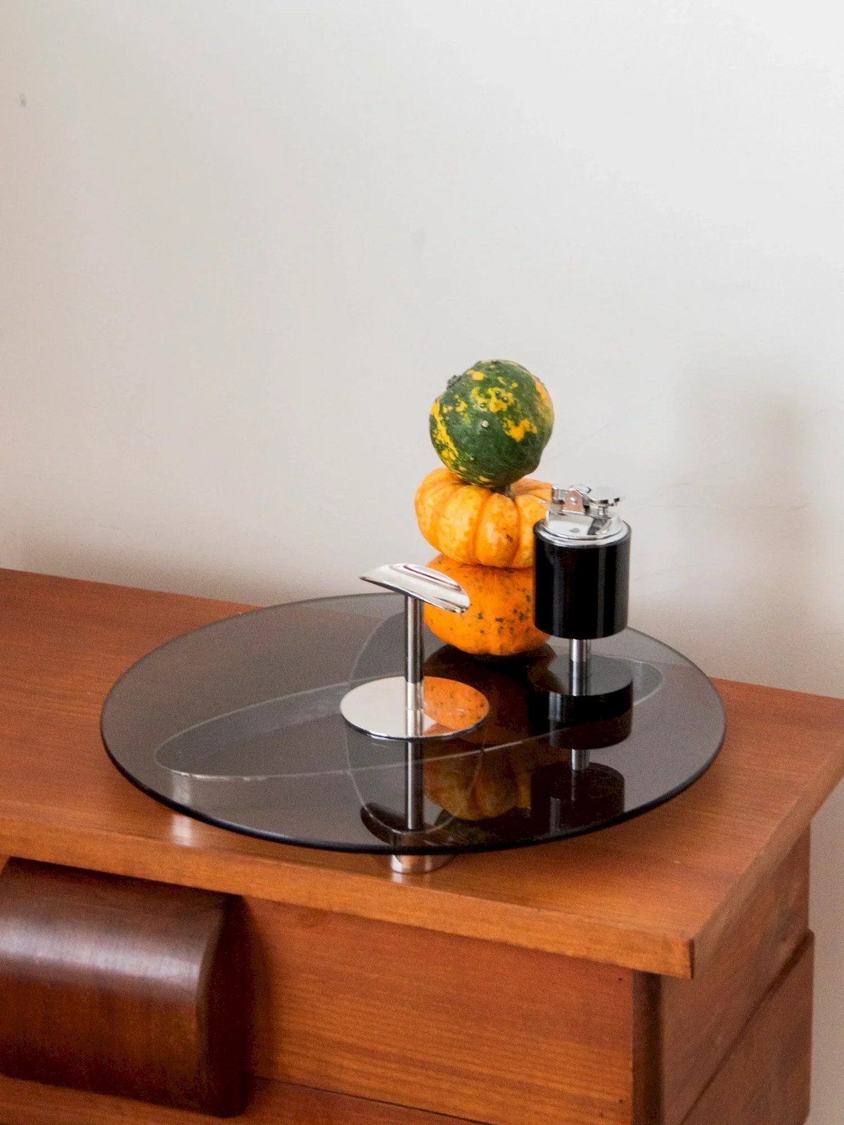 Elevate your appetizers with this 1970s smoked glass and chrome cheese platter, where the roundness of the tray interacts with a sculptural base for a distinctly Space Age look. Its compact size offers an ideal surface for presenting cheeses, dried fruits, and snacks during your evenings, while the smoked glass adds a subtle warmth and the chrome brings a graphic touch. A retro-chic piece with a defined charm, in very good condition. Height: 10 cm Diameter of the tray: 32 cm Condition: Used: An item that has been used. Item showing some superficial wear marks, ...Used: An item that has been used. Item showing some superficial wear marks, fully operational and functioning correctly. It may be a demonstration model or a returned item after a short period of use. any potential imperfections. Brand: Debongout Type: Found product Material: Glass, Chrome Style: Country