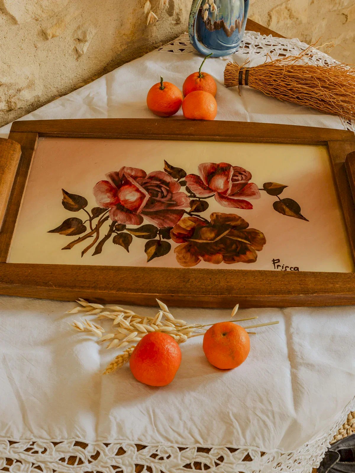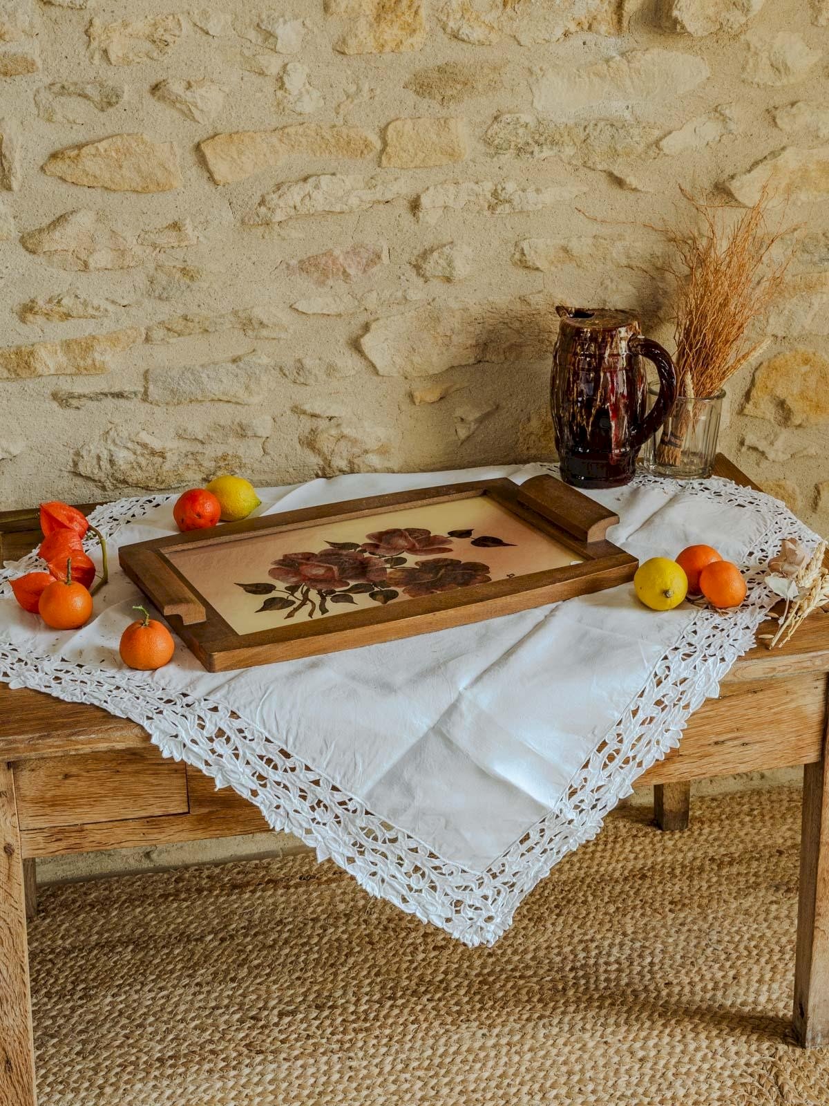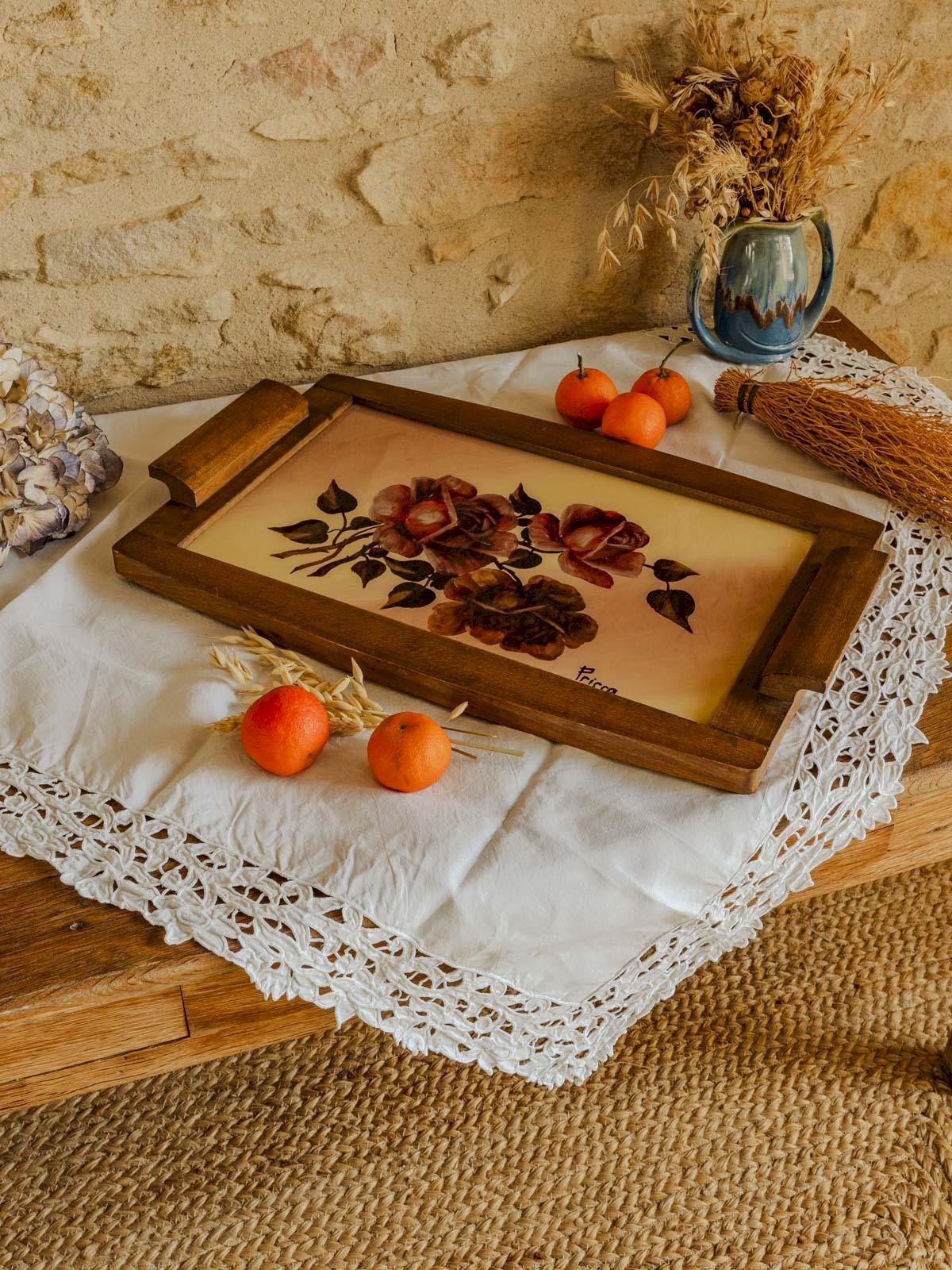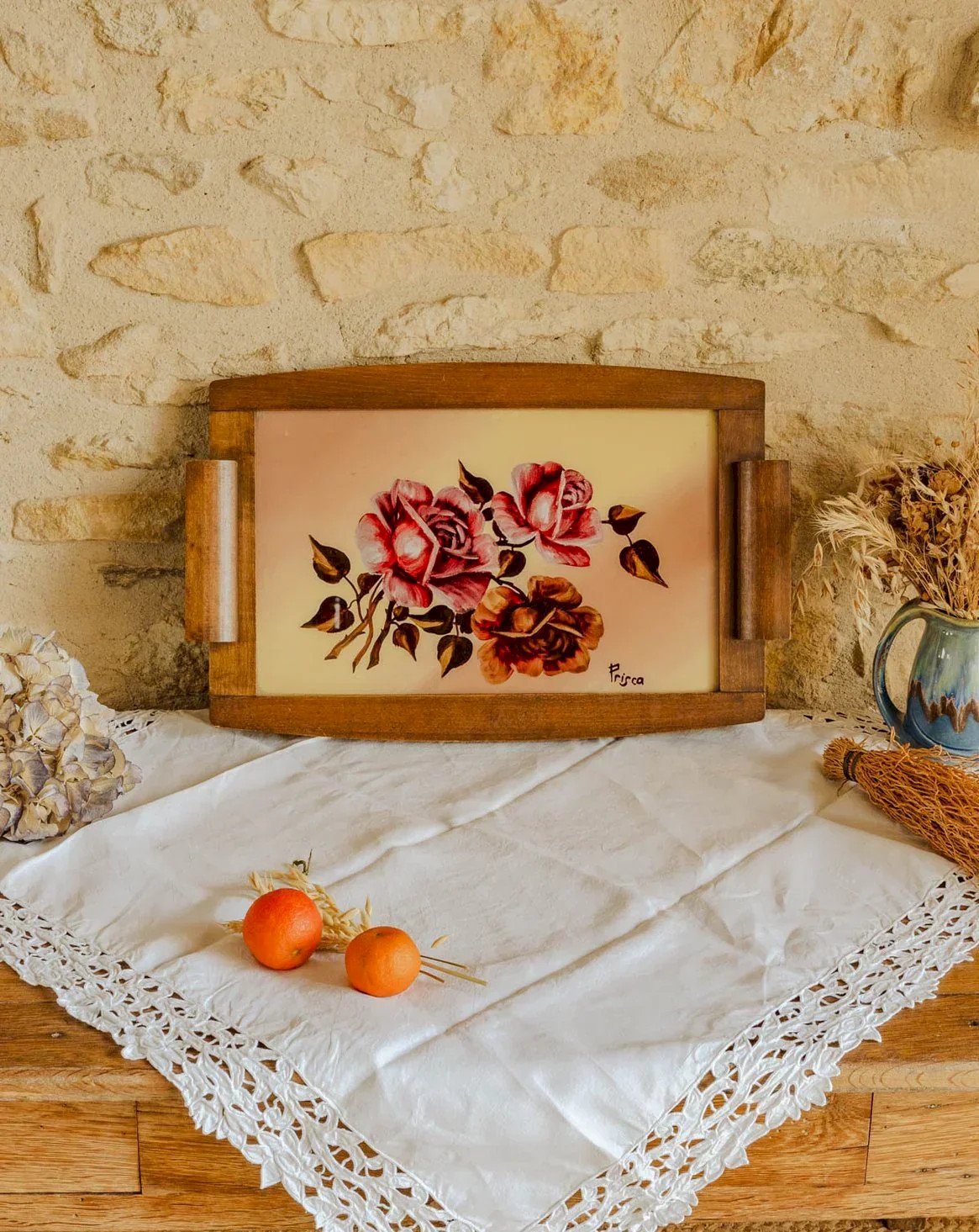 Discover this vintage tray signed by Prisca, dating from the 1950s, featuring a delicate rose pattern at its center, protected by glass and surrounded by a warm wooden frame. Its elongated shape allows it to accommodate cups and sweets, showcase candles or decorative objects, and serve as an elegant centerpiece. The combination of wood and glass infuses a retro and poetic atmosphere, ideal for a charming decoration. Length: 50 cm Width: 32 cm Height: 5 cm Condition: Used: Item that has been used. Item showing some signs of superficial wear, fully operational and functioning correctly. It may be a demo model or an item returned to the store after a short period of use. Possible imperfections. Brand: Debongout Type: Vintage product Material: Wood, Glass Style: Country