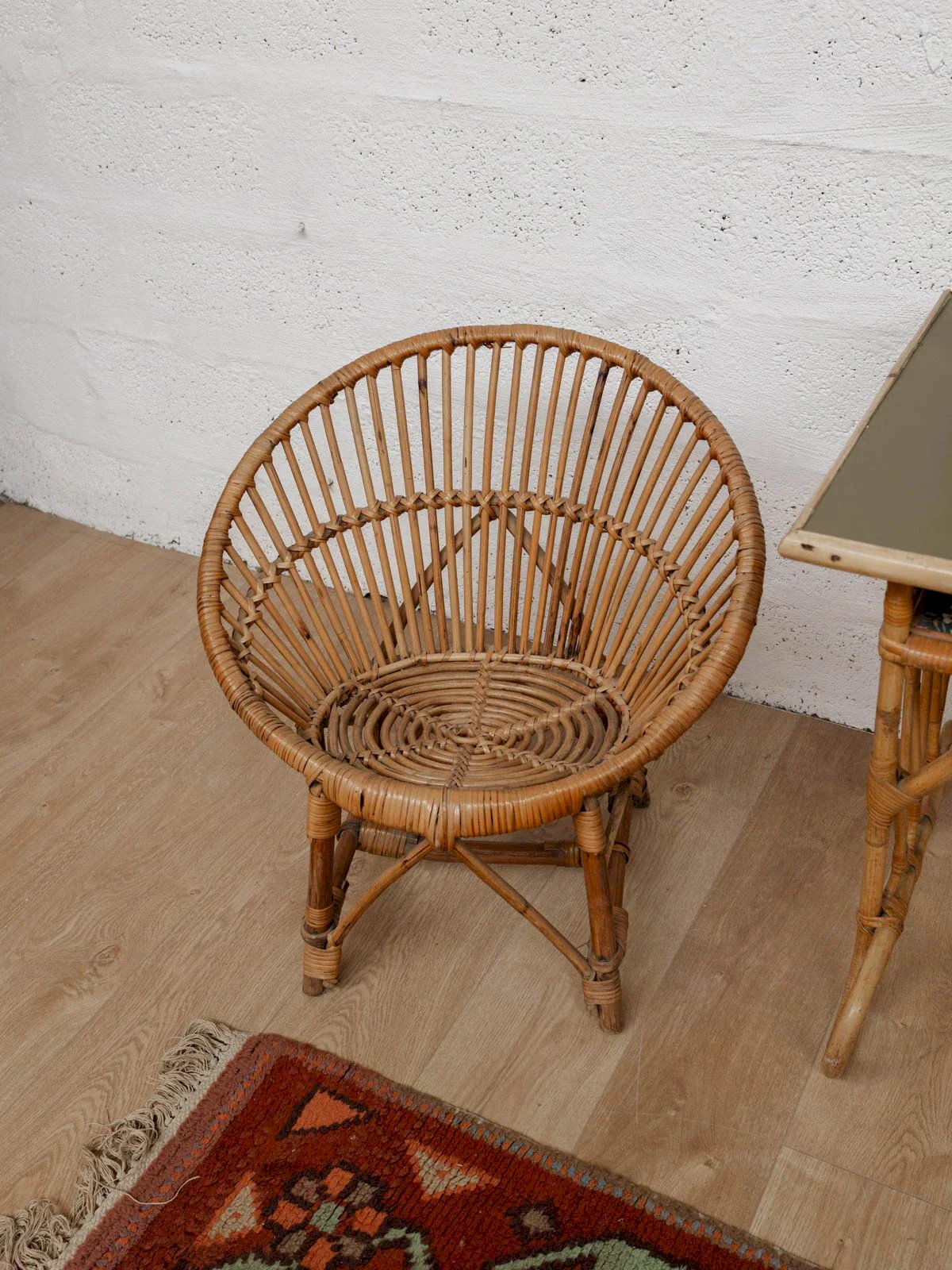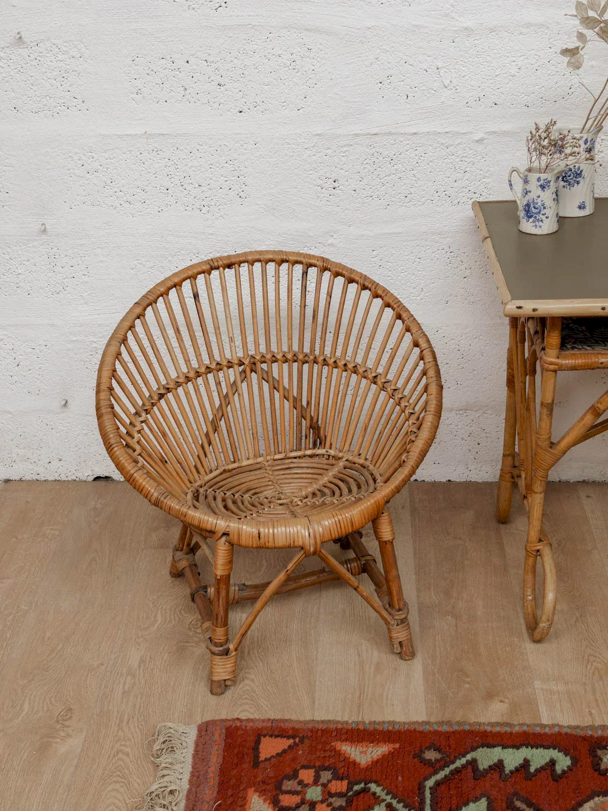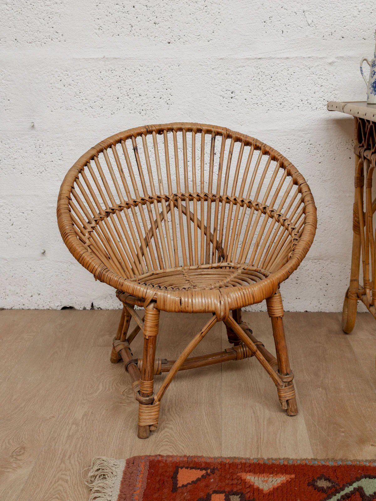 Discover this charming child's chair made of rattan with a round backrest, perfect for adding a touch of elegance and comfort to your little one's room. Designed with quality materials, it ensures both sturdiness and lightness. Its delicate vintage-style design will integrate harmoniously into any decor. Ideal for playing, reading, or even a small meal, this chair will quickly become your child's favorite spot. Length: 64 cm Height: 65 cm Seat height: 34 cm Condition: Used: Item that has been used. Item showing some signs of superficial wear, fully operational and functioning correctly. It may be a demo model or an item returned to the store after a short period of use. Any possible imperfections. Color: Multicolor Height: Rattan Width: Armchairs and loungers Brand: Debongout Type: Thrifted product Material: Rattan Style: Country
