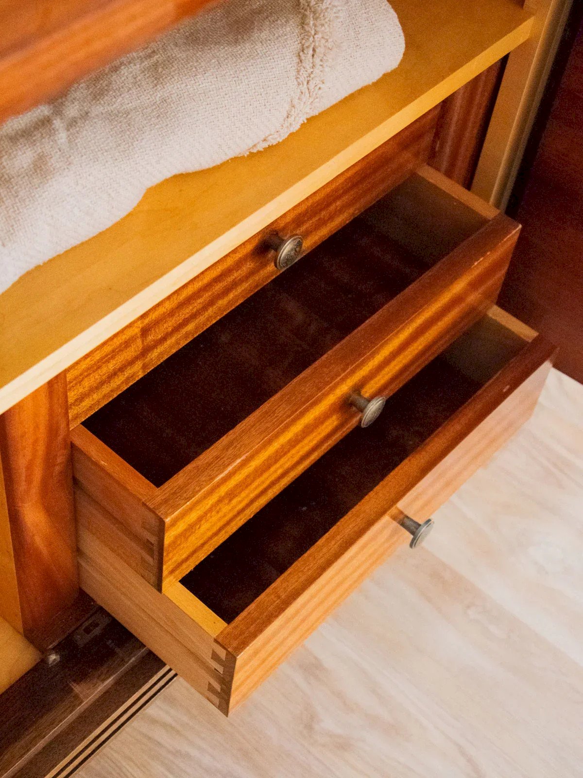 Enhance your interior with this 1960s sideboard featuring Art Deco charm, part of a selection from the Mondial du Prestige de l'Ameublement; its balanced lines evoke a discreet elegance. Made of lacquered wood, it offers ample storage space behind four doors, three functional drawers, and two spacious shelves, while the brass handles and key closure add a refined and practical touch that fits into a warm living room or dining area. Light traces of time and use are present. Length: 230 cm Width: 53 cm Height: 97.5 cm Drawer height: 8 cm Shelf dimensions: 109.5 x 43.5 cm Height of compartments on the right: 29 cm Height of the upper compartment on the left: 25 cm Height of the lower compartment on the left: 33 cm Length of drawers (x3): 38.5 cm A brief history of the sideboard: It was in the 1950s that the first Scandinavian sideboards made their appearance. The Scandinavian-style sideboard is part of the innovative post-war furniture. Its airy lines and rectilinear volumes reflect the understated style of modernist inspiration, showcasing all the features of Norwegian, Swedish, Finnish designers, etc. The Scandinavian sideboard is made using traditional cabinetry, usually in teak wood. It serves as a replacement for the traditional dining room buffet and now also functions as a console. For a stylish and livable living room, the sideboard is the perfect piece of furniture! Condition: Used: Item has been used. The item shows some signs of superficial wear... Used: Item has been used. The item presents some signs of superficial wear, is fully operational and functioning correctly. It may be a display model or an item returned to the store after a short period of use. Potential imperfections. Brand: Debongout Type: Curated product Material: Wood, Brass Style: Contemporary Customized: Sideboards