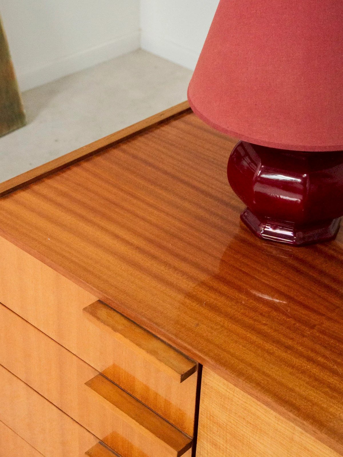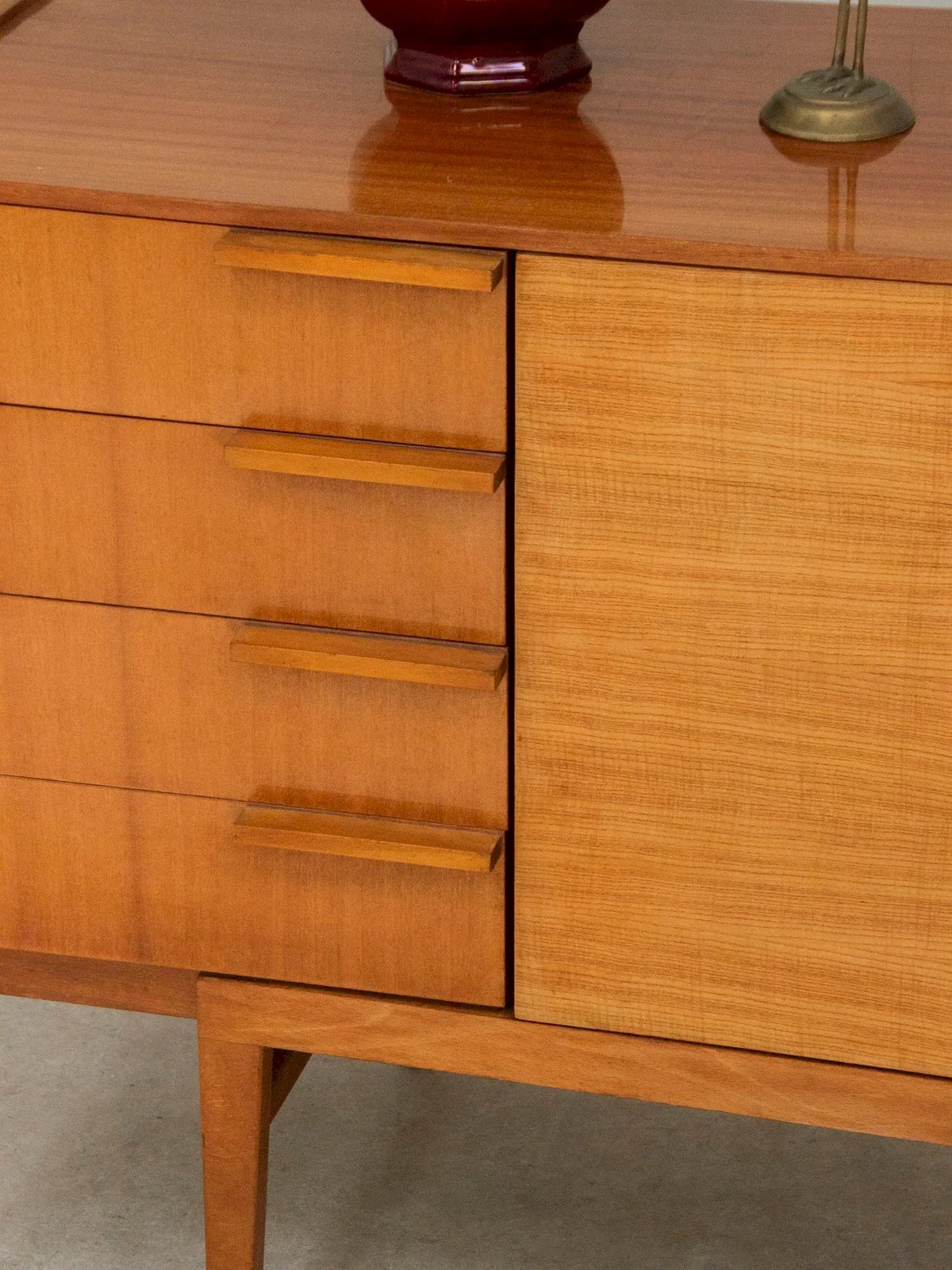 Discover this varnished light wood sideboard, whose smooth finish reveals the natural grain and diffuses a beautiful warmth in the room. Equipped with four drawers, two cupboards, and several shelves, it offers generous and modular storage for dishes, everyday items, or your documents. The long wooden handles and small tapered legs highlight an elegant and slightly retro silhouette, ideal for structuring a living room or dining room with sobriety. Length: 162 cm Width: 45 cm Height: 77 cm Height of the 4 drawers: 8 cm Height of the shelves: 17 cm / 13 cm / 12 cm Height of the middle shelves: 21 cm / 21 cm A brief history of the sideboard It was in the 1950s that the first Scandinavian sideboards appeared. The Scandinavian-style sideboard is part of the innovative post-war furniture. Its airy lines and straight volumes reflect the sober style of modernist inspiration, with all the characteristics of Norwegian, Swedish, and Finnish designers... The Scandinavian sideboard is made with traditional carpentry, usually in teak wood. It is used as a replacement for the traditional dining room sideboard and now serves as a console. For a stylish and pleasant living room, the sideboard is the perfect piece of furniture! Condition: Used: Item that has been used. Item showing some superficial signs of wear...Used: Item that has been used. Item showing some superficial signs of wear, fully operational and functioning correctly. It may be a demonstration model or an item returned to the store after a short period of use. Any imperfections. Brand: Debongout Type: Vintage product Material: Wood Style: Contemporary Customizable: Sideboards