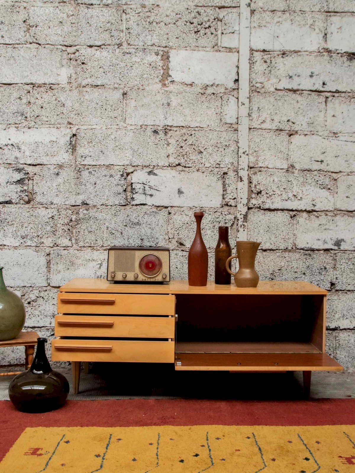 Discover this charming little light wood sideboard, perfect for adding a touch of softness to your interior. Equipped with three practical drawers and a drop-down cabinet, it offers a valuable storage space, although the opening mechanism may be a bit stiff. Its small straight legs and wooden handles add a note of artisanal elegance. With its slightly damaged top, this piece reveals timeless charm and a story to tell. Length: 125 cm Width: 47 cm Height: 50 cm Drawer height: 6 cm Niche height: 27 cm A brief history of the sideboard: The first Scandinavian sideboards made their appearance in the 1950s. The Scandinavian-style sideboard is part of the innovative post-war furniture. Its airy lines and straight volumes reflect the sober style inspired by modernism, incorporating all the characteristics of Norwegian, Swedish, Finnish designers, etc. The Scandinavian sideboard is crafted using traditional cabinetry, typically made of teak wood. It is used as a replacement for the traditional dining room buffet and now serves as a console. For a stylish and pleasant living room, the sideboard is the perfect piece of furniture! Condition: Used: Item has been used. Item shows some superficial signs of wear... Used: Item has been used. Item shows some superficial signs of wear, fully operational and functioning correctly. It may be a demonstration model or an item returned to the store after a short period of use, with possible imperfections. Brand: Debongout Type: Curated product Material: Wood Style: Contemporary Custom: Sideboards