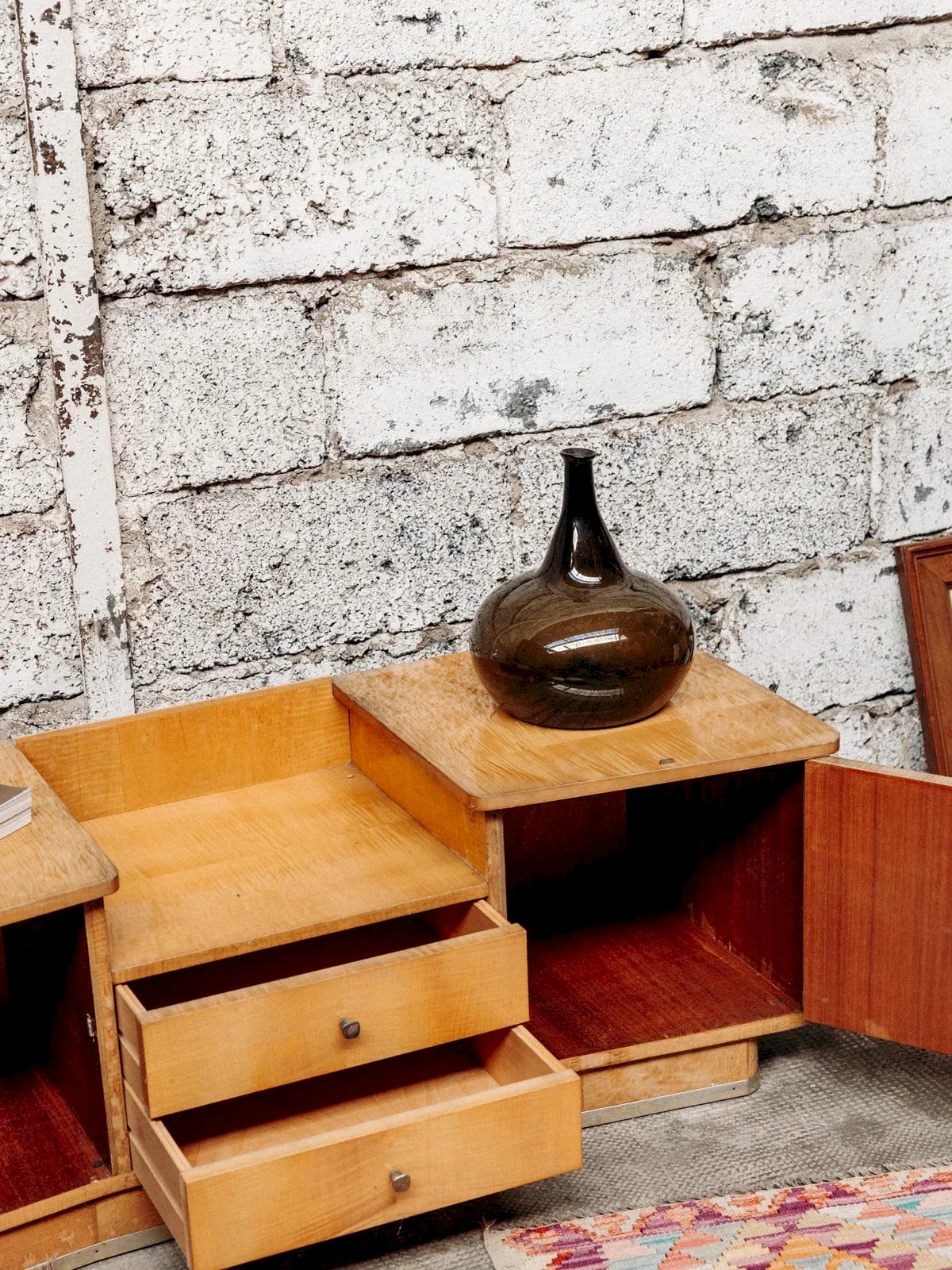 Add a retro touch to your interior with our 1970s storage unit featuring a glossy lacquer finish. With its two drawers and two cabinets, it offers spacious and practical storage space for your essential items. Its vintage design and bold lines will bring character to your decor while fitting perfectly into any modern style. A must-have for lovers of retro charm and functionality. Length: 122 cm Width: 47 cm Height: 44 cm Dimensions of side niches: Length: 34 cm Width: 37 cm Height: 32 cm A brief history of the sideboard: It was in the 1950s that the first Scandinavian sideboards appeared. The Scandinavian-style sideboard is part of the innovative post-war furniture. Its airy lines and straight volumes reflect the sober style inspired by modernism, featuring all the characteristics of Norwegian, Swedish, Finnish designers, and more. The Scandinavian sideboard is made of traditional cabinetry, usually in teak wood. It is used as a replacement for the traditional dining room buffet and now serves as a console. For a stylish and pleasant living room, the sideboard is the perfect piece of furniture! Condition: Used item. Item has been used. Item shows some signs of superficial wear... Used item. Item has been used. Item shows some signs of superficial wear, fully operational and functioning correctly. It may be a demonstration model or an item returned to the store after a short period of use, with possible imperfections. Brand: Debongout Type: Vintage product Material: Wood, Metal Style: Contemporary Custom: Sideboards