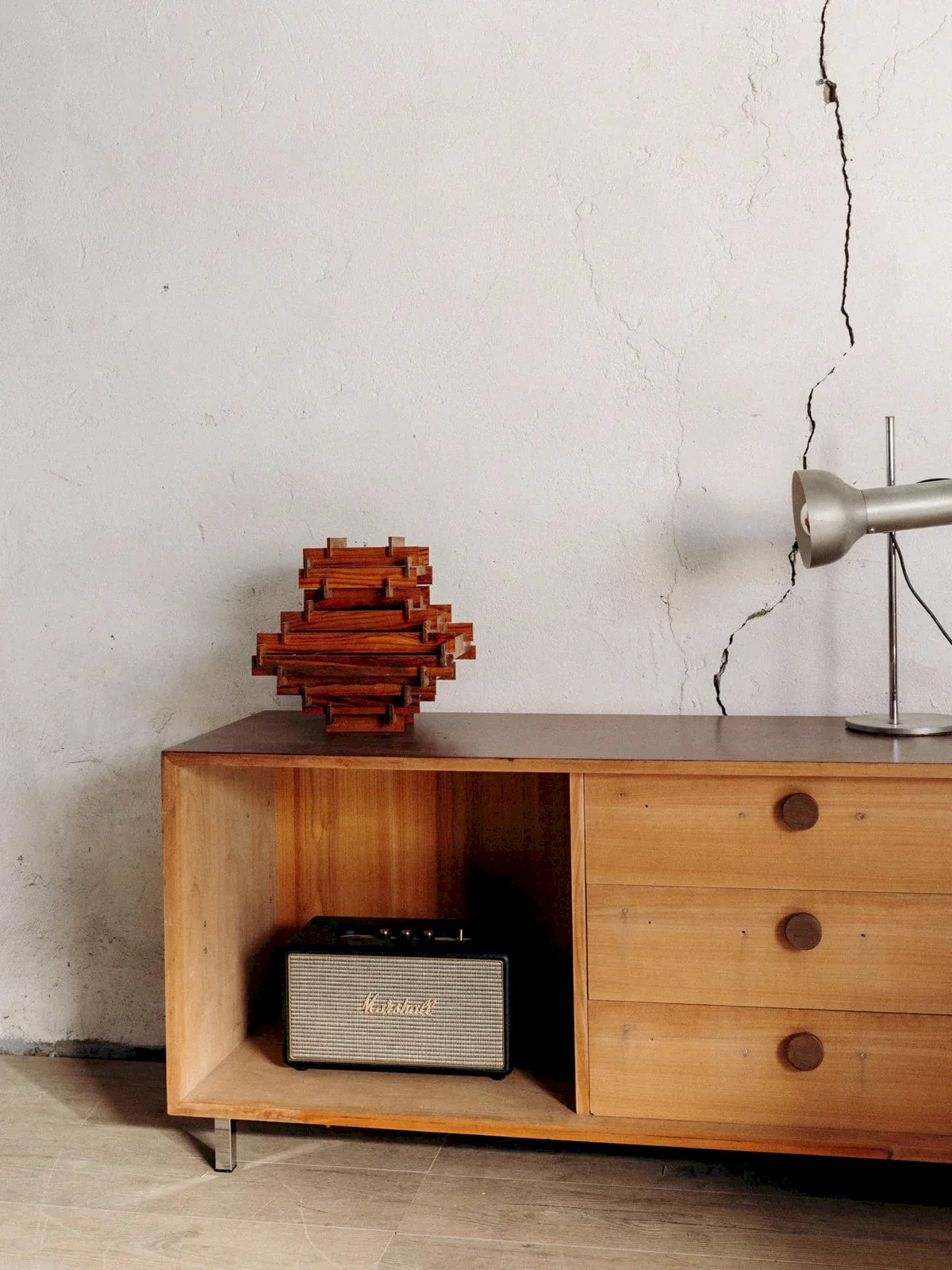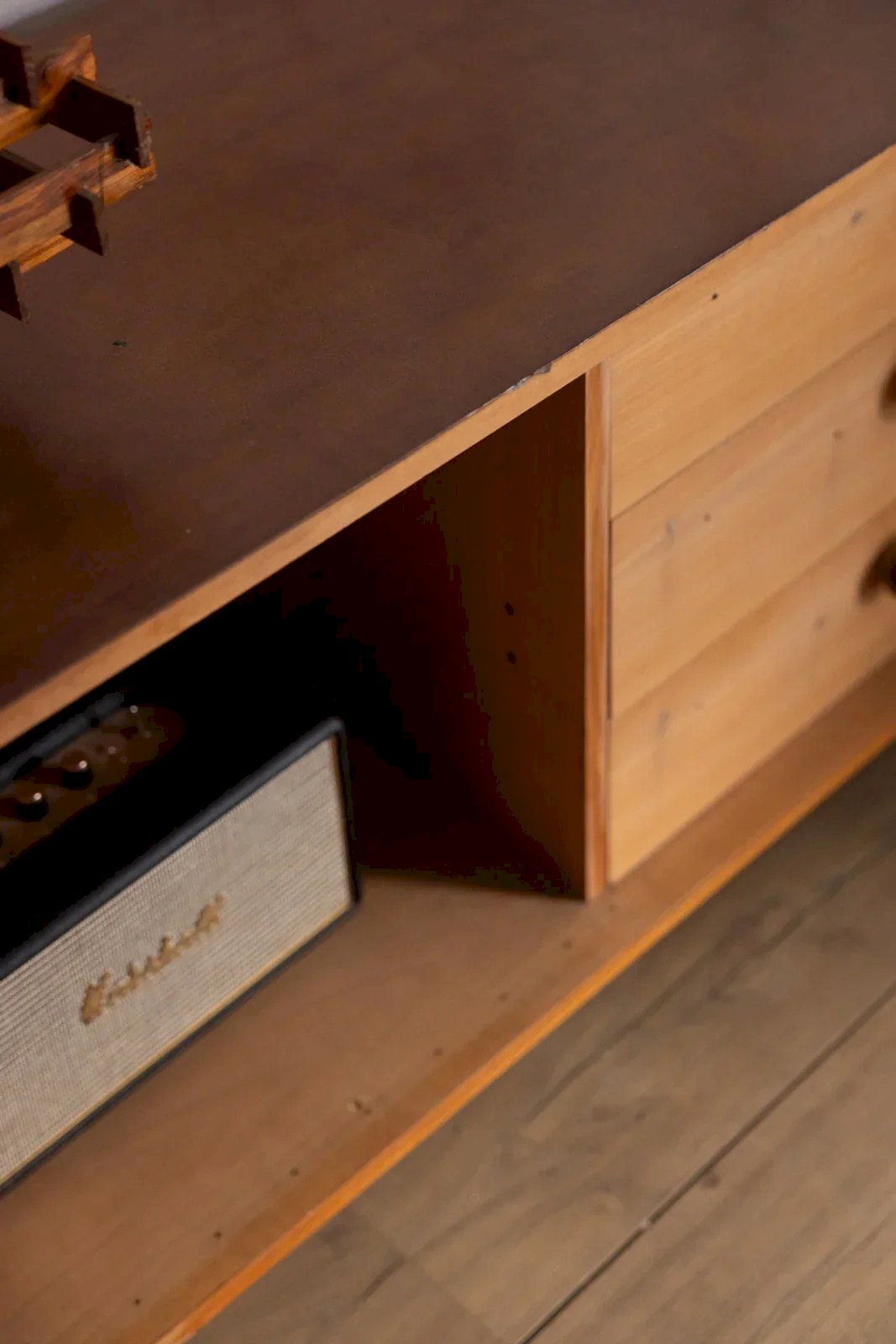 Bring a touch of elegance to your interior with this small wooden sideboard that subtly combines two tones, light and dark. Originally, the piece featured a golden oak color, but its top has been carefully revarnished, giving it a bright and refined appearance. With an open nook and three drawers, it offers both practical and functional storage. The chrome feet add a modern and refined touch to the whole. An ideal piece of furniture to add character while optimizing your space. Length: 120 cm Width: 46 cm Height: 62 cm Drawer height: 11 cm Nook height: 48 cm A brief history of the sideboard: The first Scandinavian sideboards made their appearance in the 1950s. The Scandinavian style sideboard is part of innovative post-war furniture. Its airy lines and straight volumes capture the sober style inspired by modernism, featuring all the characteristics of Norwegian, Swedish, Finnish designers, and more. The Scandinavian sideboard is made using traditional cabinetmaking, usually in teak wood. It is used as a replacement for the traditional dining room buffet and now serves as a console. For a stylish and pleasant living room, the sideboard is the perfect piece of furniture! Condition: Used: Item has been used. Item shows some signs of superficial wear... Used: Item has been used. Item shows some signs of superficial wear, fully operational and functioning correctly. It may be a demonstration model or a return item after a short period of use, with possible imperfections. Brand: Debongout Type: Vintage product Material: Wood, Chrome Style: Contemporary Custom: Sideboards