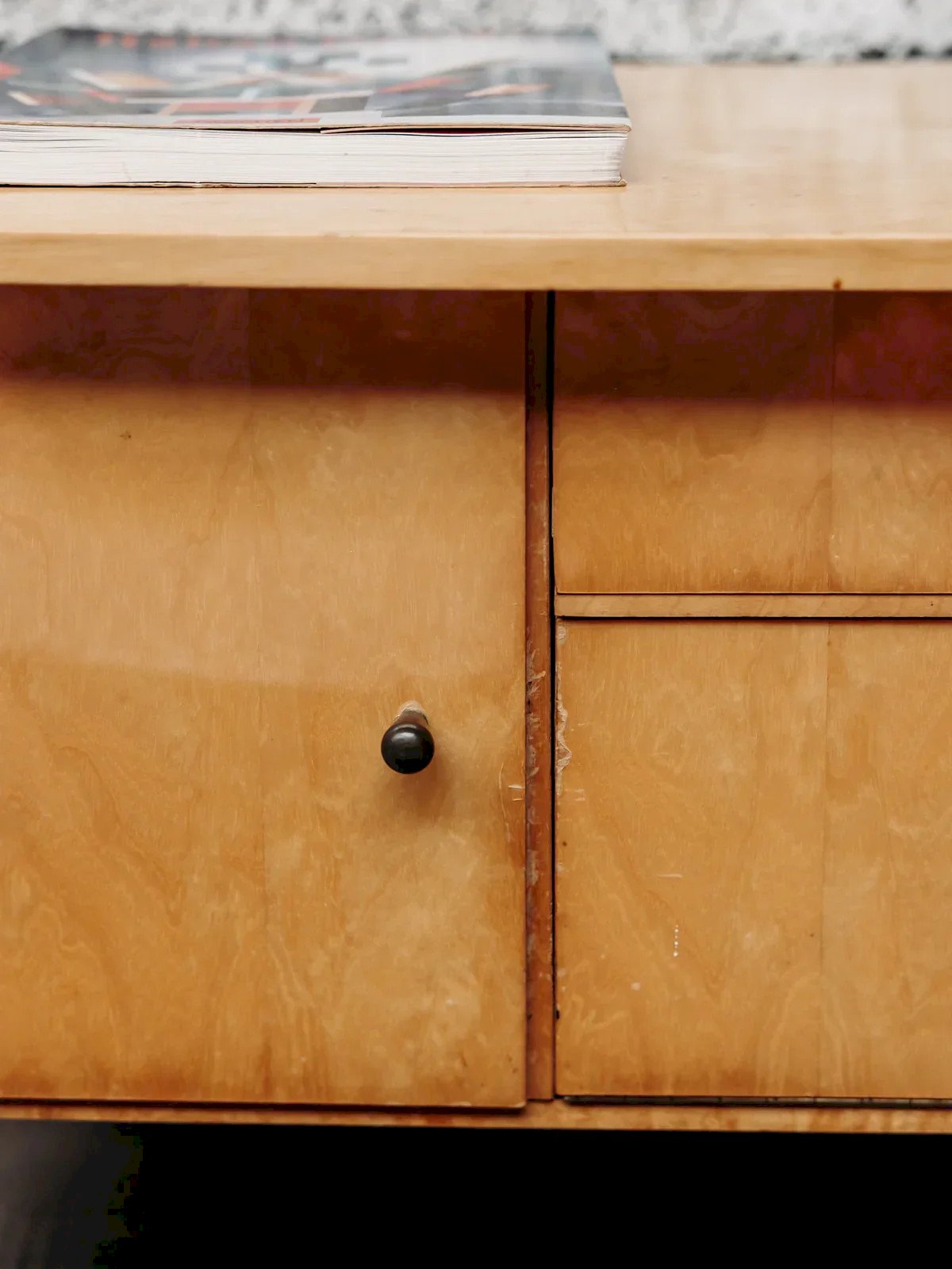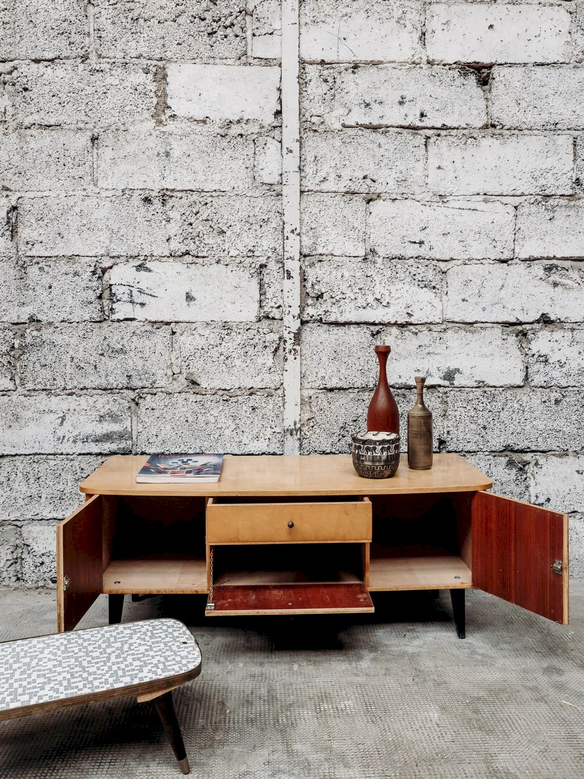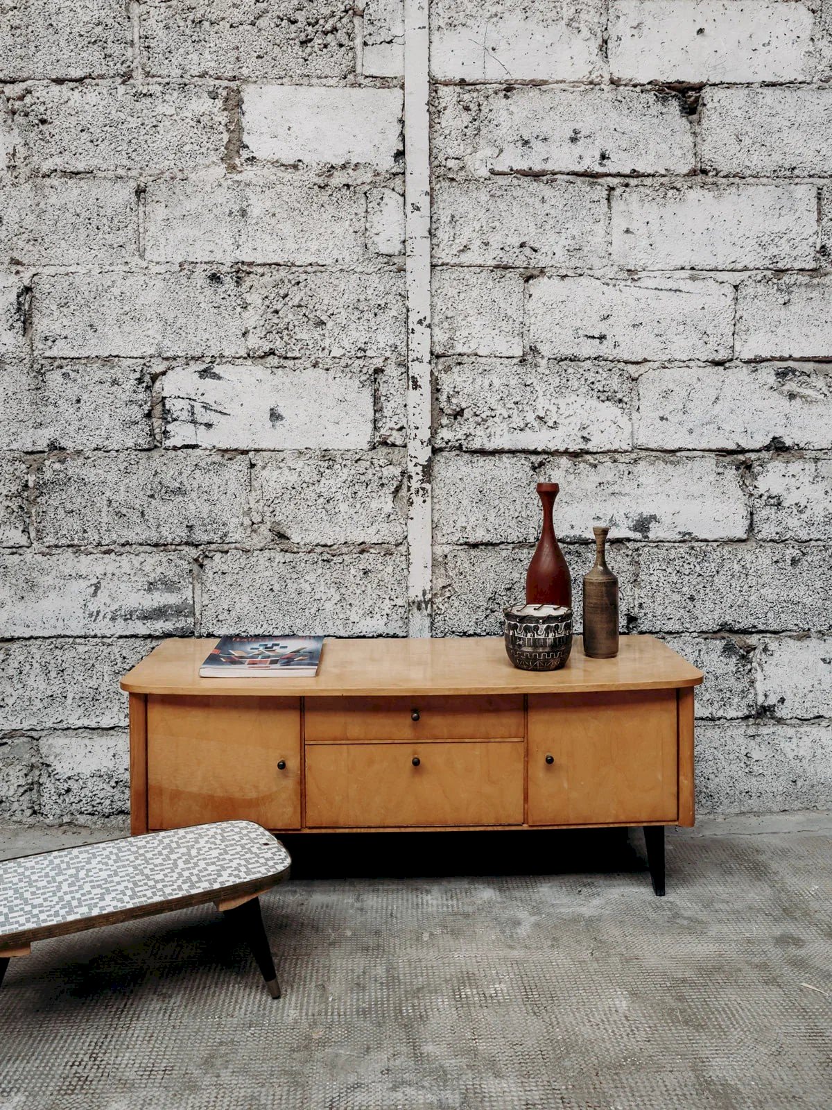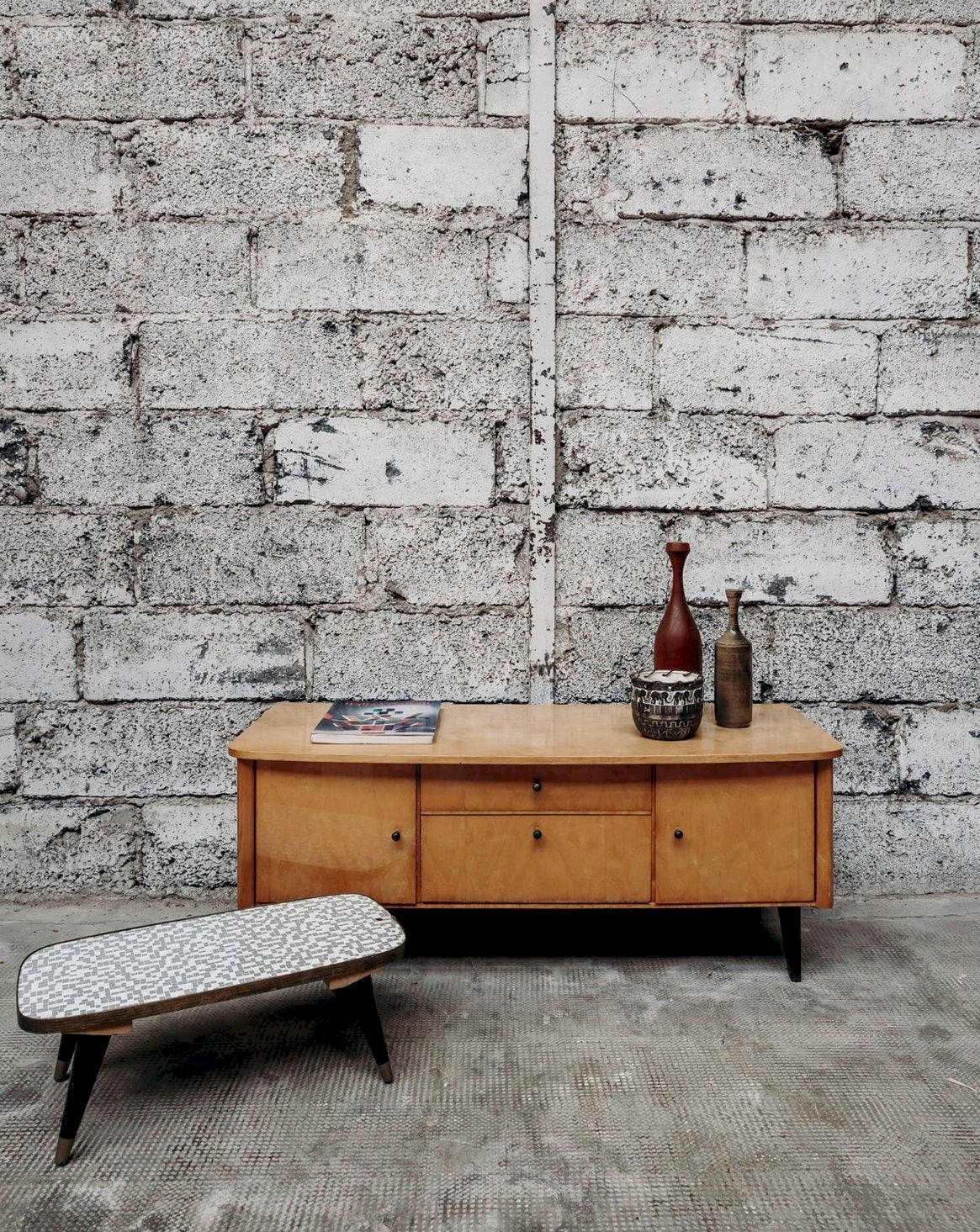Bring a touch of elegance to your interior with this small low sideboard in light wood. Its small round handles and slender black wooden legs give it a style that is both simple and refined. Practical and aesthetic, it offers a nice storage space without cluttering the room. Its sleek design easily adapts to different decoration styles. Ideal for a living room, an entrance, or a bedroom. Length: 113 cm Height: 45 cm Height of the compartment: 15 cm Height of the cupboards: 26 cm Height of the drawer: 8 cm Depth: 44 cm A brief history of the sideboard The first Scandinavian sideboards appeared in the 1950s. The Scandinavian-style sideboard is part of the innovative post-war furniture. Its airy lines and straight volumes reflect the simple style inspired by modernism, with all the characteristics of Norwegian, Swedish, and Finnish designers. The Scandinavian sideboard is made using traditional cabinetry, usually in teak wood. It is used as a replacement for the traditional dining room sideboard and now serves as a console. For a stylish and comfortable living room, the sideboard is the perfect piece of furniture! Condition: Used: Item has been used. Item shows some signs of superficial wear... Used: Item has been used. Item shows some signs of superficial wear, fully operational and functioning correctly. It may be a display model or an item returned to the store after a short period of use. any imperfections. Brand: Debongout Type: Vintage product Material: Wood Style: Contemporary Customized: Sideboards
