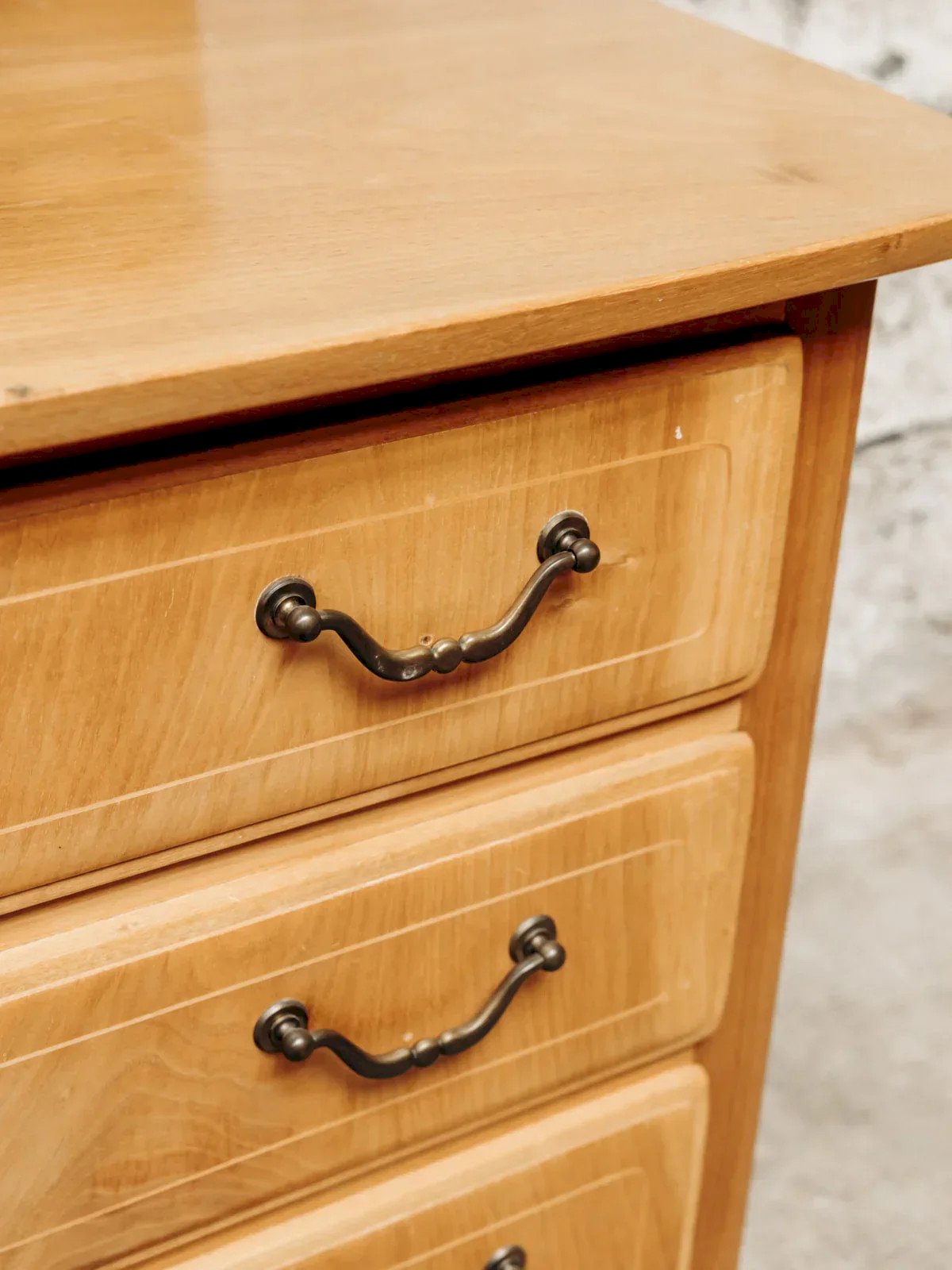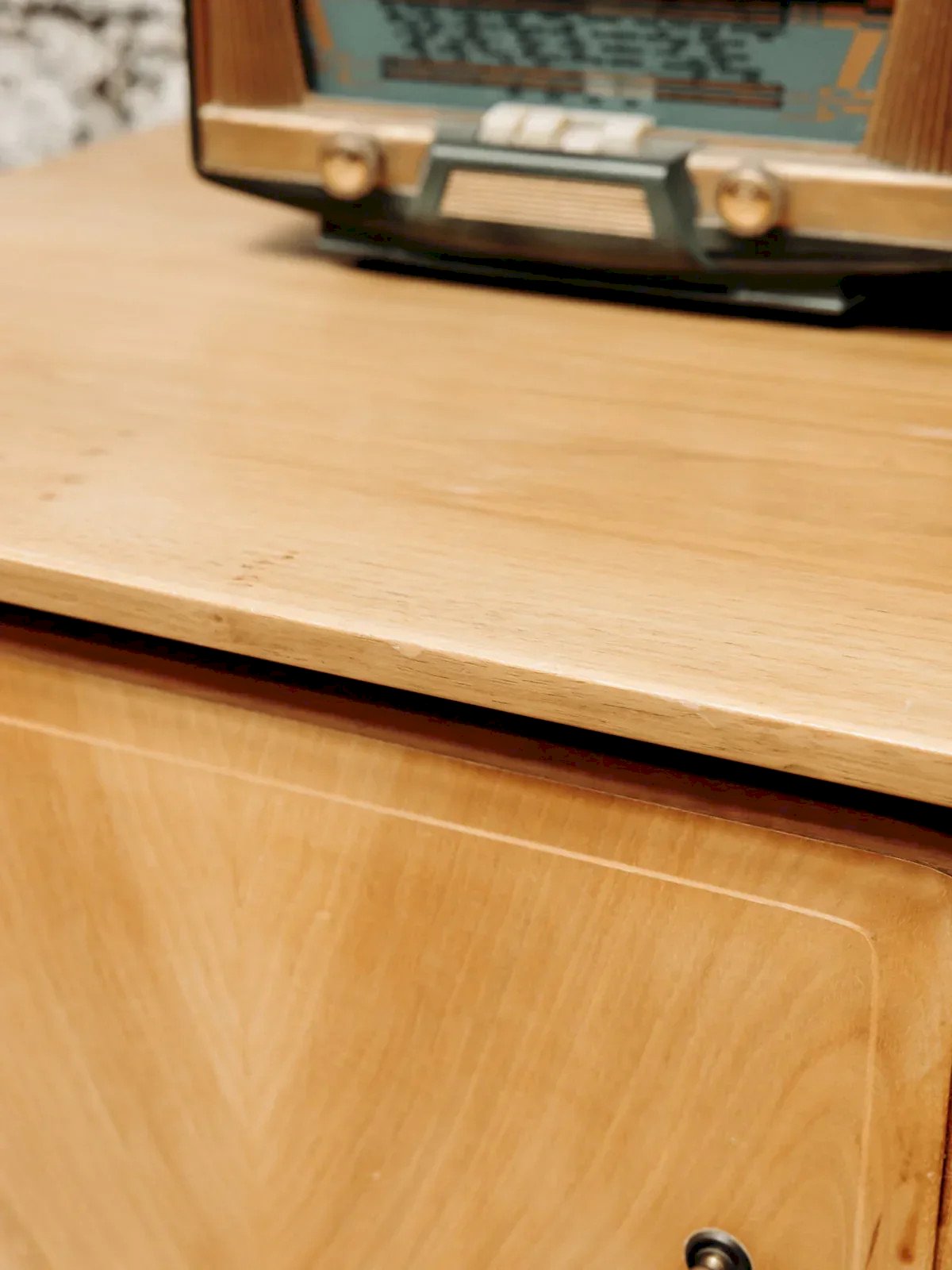 This low light wood furniture combines simplicity and natural charm. Featuring a solid wood top with a small rim at the back, it offers three drawers and a cupboard for practical storage. Original handles, discreet small legs: a functional and elegant piece, perfect for a living room, bedroom, or office. Length: 134 cm Width: 50 cm Height: 68 cm Drawer height: 11 cm Condition: Used item. Item has been used. Item showing some superficial signs of wear, fully operational and functioning correctly. It may be a demonstration model or a returned item after a short period of use. Any potential imperfections. Brand: Debongout Type: Thrifted product Material: Wood Style: Contemporary Customized: Sideboards