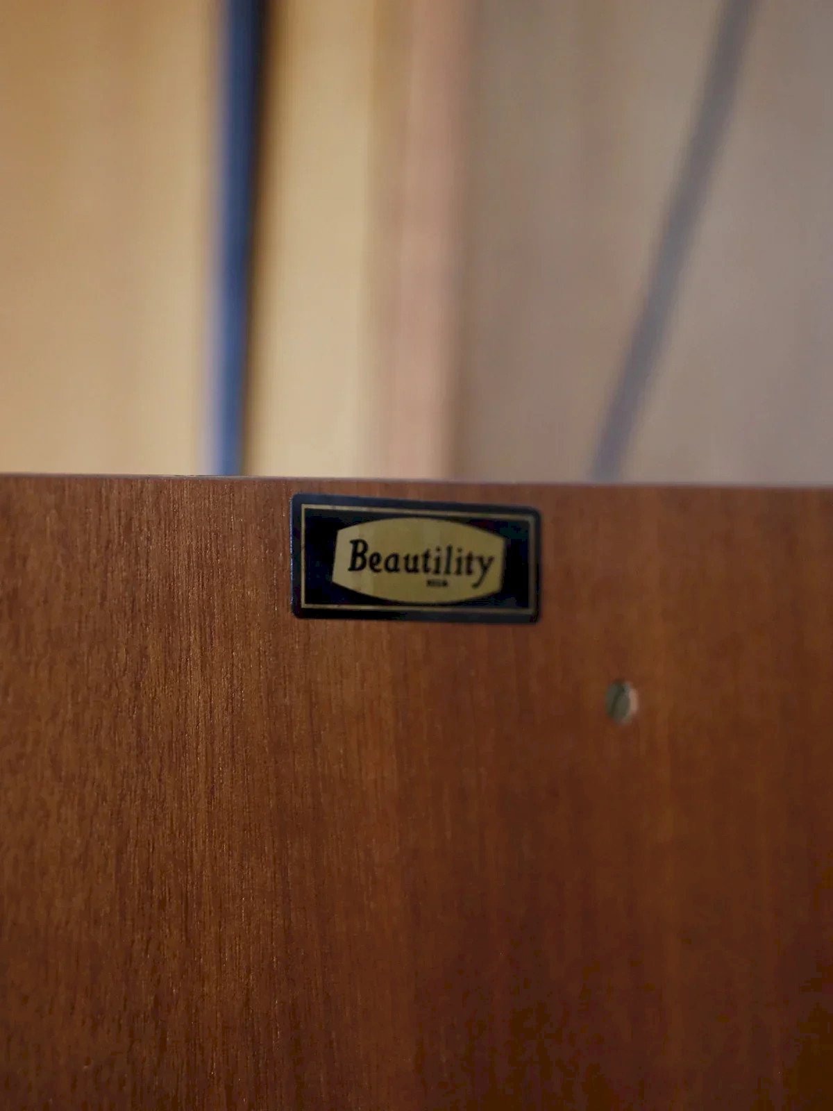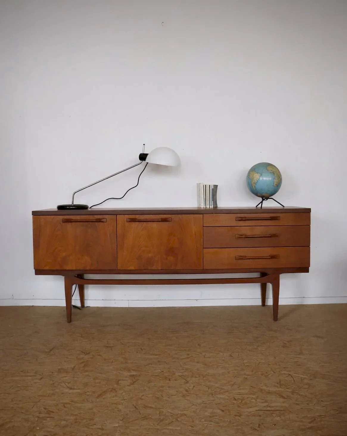 Bring a refined mid-century touch with this English sideboard from BEAUTILITY in teak veneer, featuring long lines and balanced proportions. Designed for the living room or dining room, it combines a cabinet, a front-opening bar, and three large drawers, providing organized storage for dishes, linens, or multimedia equipment. The adjustable interior shelves accommodate bottles and glasses while the drawers offer practical compartments. Its warm patina highlights a sober and timeless aesthetic. Length: 184 cm Width: 45 cm Height: 76 cm Cabinet: shelf heights: 19 cm and 17 cm Drawer heights: 5 and 9 cm A brief history of the sideboard: The first Scandinavian sideboards appeared in the 1950s. The Scandinavian-style sideboard is part of the innovative post-war furniture. Its airy lines and rectilinear volumes reflect the clean style inspired by modernism, showcasing all the characteristics of Norwegian, Swedish, and Finnish designers. The Scandinavian sideboard is crafted using traditional cabinet-making techniques, typically in teak wood. It replaces the traditional dining room buffet and now also serves as a console. For a stylish and comfortable living room, the sideboard is the perfect piece of furniture! Condition: Used: Item has been used. Item shows some superficial signs of wear, ... Used: Item has been used. Item shows some superficial signs of wear, fully operational and functioning properly. It may be a demonstration model or an item returned to the store after a short period of use with possible imperfections. Brand: Debongout Type: Vintage product Material: Teak Style: Contemporary Customized: Sideboards