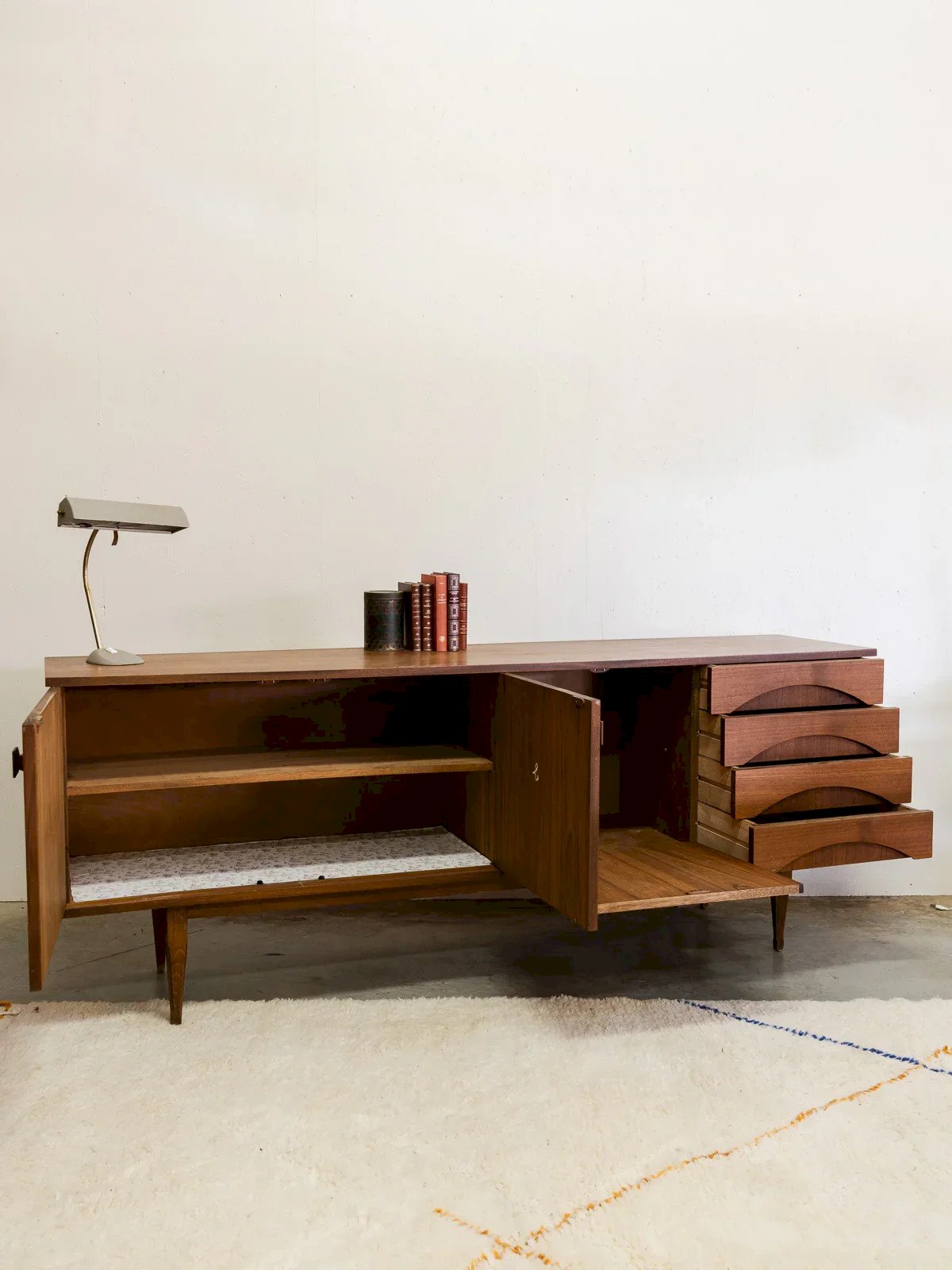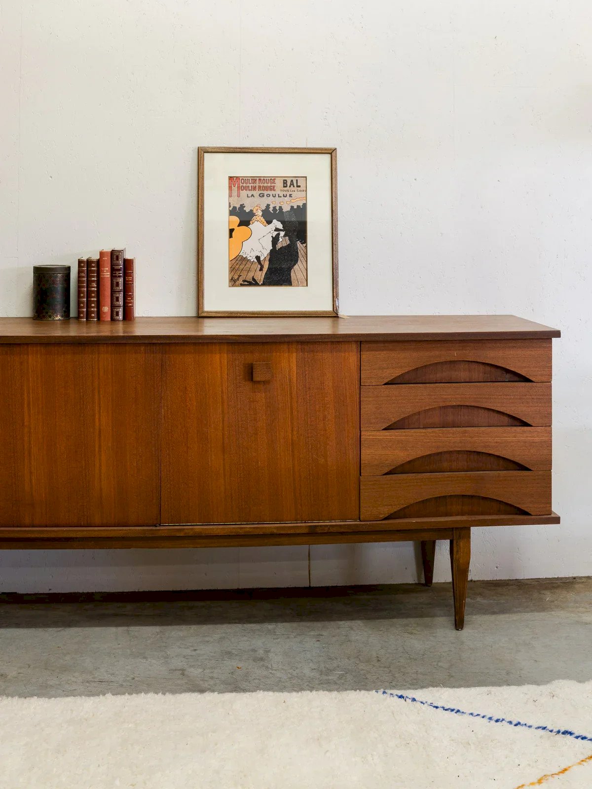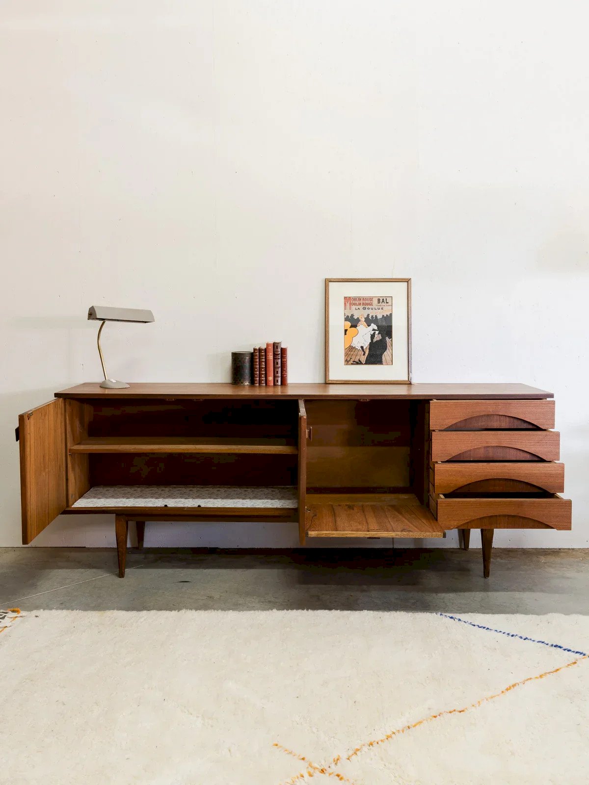 Adopt this elongated teak sideboard with clean lines, which brings a warm elegance to your living room. Four drawers, including a central drawer that unfolds into a tray, offer a clever use — discreet storage and occasional serving — while the two doors on the left reveal a practical shelf. The square teak handles emphasize its architectural character, and the beautiful patina of the wood creates a contemporary vintage ambiance. Some signs of time present that add to its authenticity. Length: 222 cm Width: 48 cm Height: 85 cm Drawer height: 10 cm A brief history of the sideboard The first Scandinavian sideboards appeared in the 1950s. The Scandinavian style sideboard is part of the innovative post-war furniture. Its airy lines and rectilinear volumes embody a modernist-inspired understated style, featuring all the characteristics of Norwegian, Swedish, Finnish designers… The Scandinavian sideboard is crafted using traditional cabinetmaking techniques, usually in teak wood. It is used as a replacement for the traditional dining room buffet and now serves as a console. For a stylish and pleasant living room, the sideboard is the perfect piece of furniture! Condition: Used: Item has been used. Item shows some signs of superficial wear...Used: Item has been used. Item shows some signs of superficial wear, fully operational, and functioning correctly. It may be a demonstration model or an item returned to the store after a short period of use. Possible imperfections. Brand: Debongout Type: Vintage item Material: Teak Style: Contemporary Custom: Sideboards