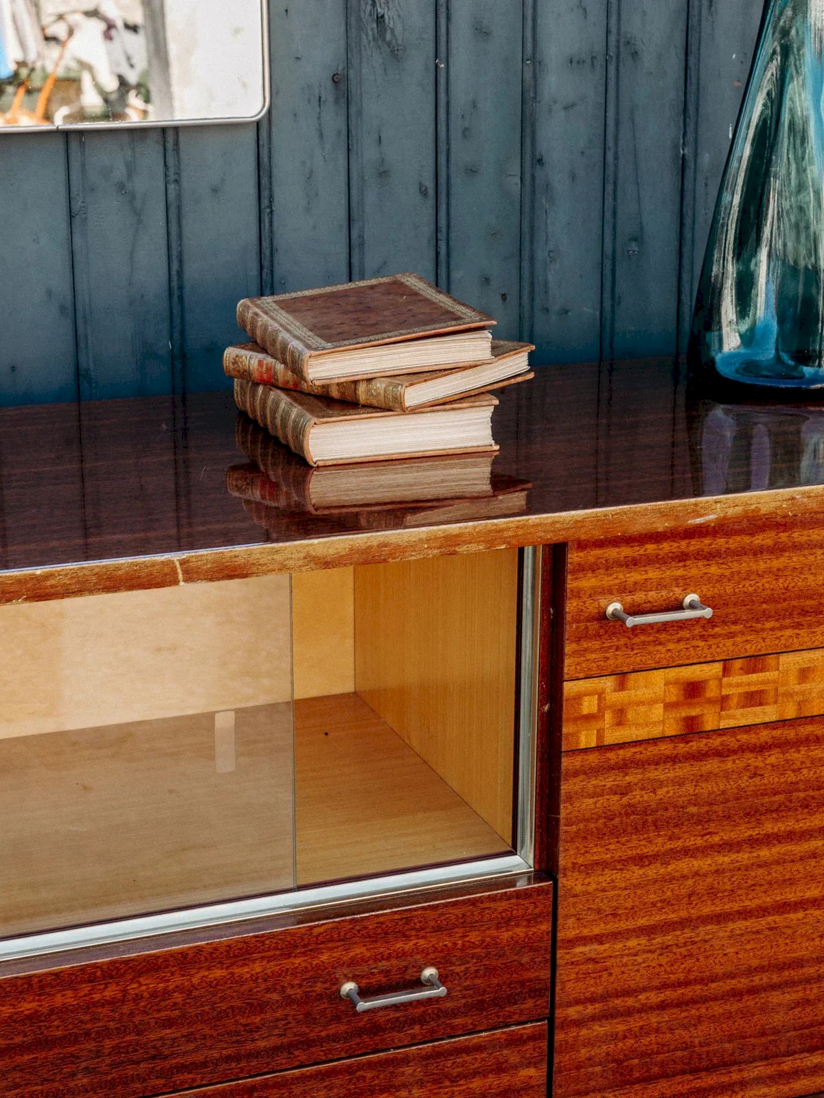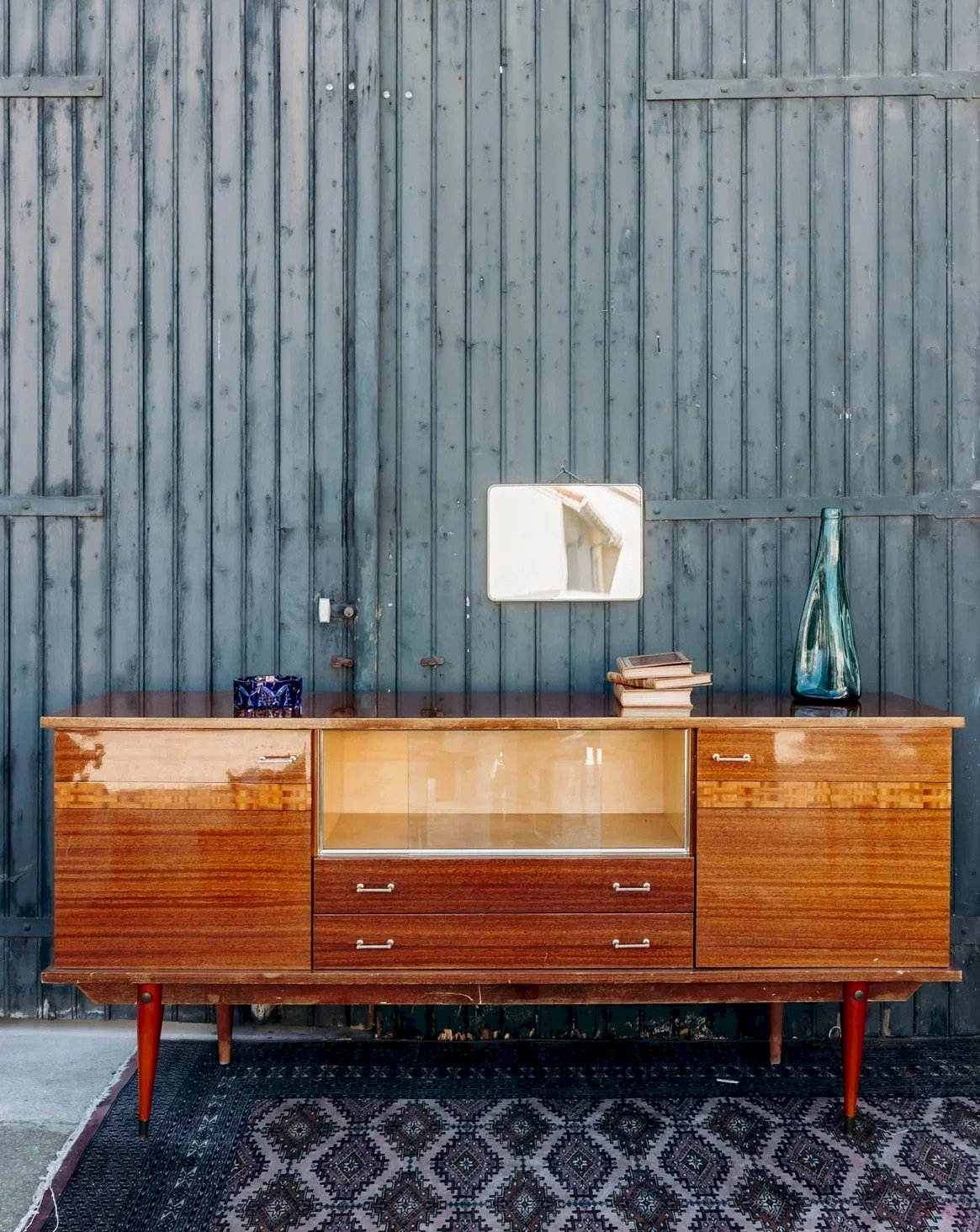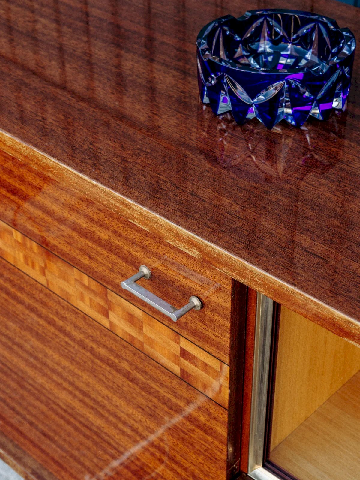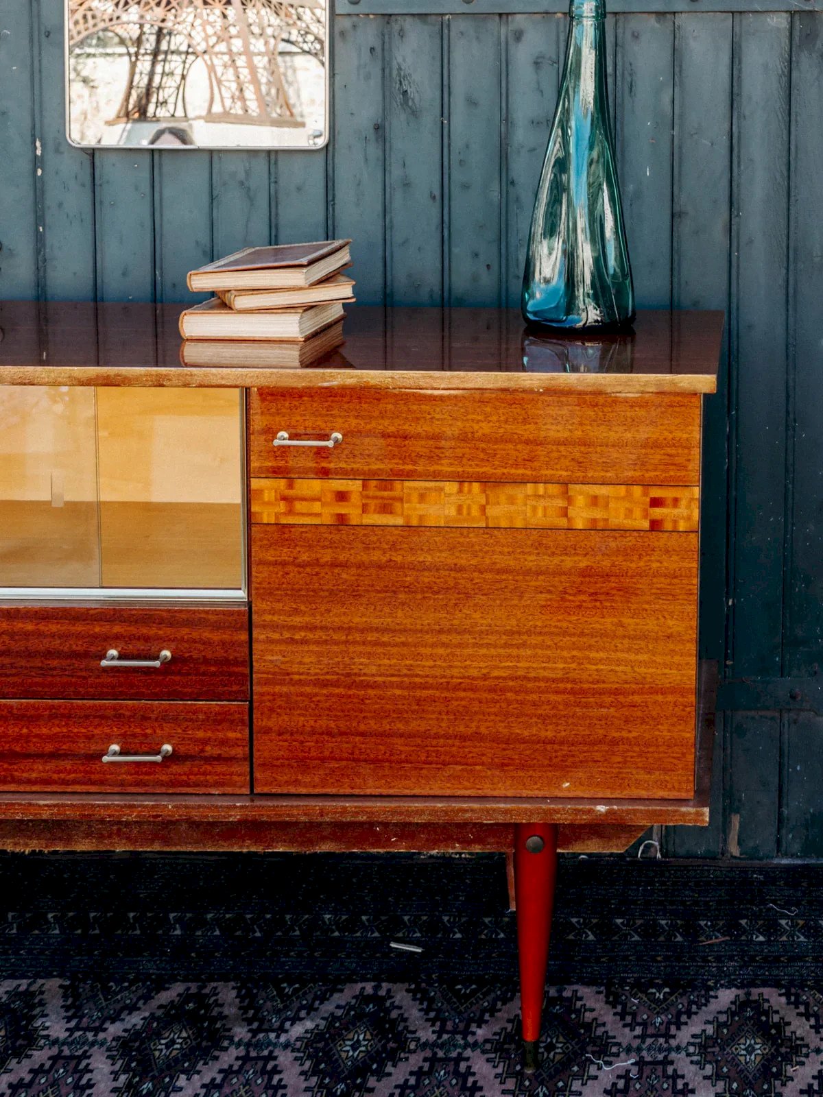 Discover this elegant lacquered sideboard, combining the charm of marquetry with contemporary lines. Featuring two cupboards, two practical drawers, and a showcase with two sliding glass doors, it blends style and functionality. Its slender legs and delicate handles add a refined touch to the whole. Although the bottom of the piece shows some visible imperfections, it remains a valuable element to enhance your interior. Length: 195 cm Height: 91 cm Drawer height: 8 cm Depth: 48.5 cm Niche height: 27 cm A brief history of the sideboard The first Scandinavian sideboards appeared in the 1950s. The Scandinavian-style sideboard is part of the innovative post-war furniture. Its airy lines and straight volumes reflect the sober style of modernist inspiration, with all the characteristics of Norwegian, Swedish, and Finnish designers... The Scandinavian sideboard is made using traditional cabinetmaking techniques, typically in teak wood. It is used as a replacement for the traditional dining room buffet and now serves as a console. For a stylish and pleasant living room, the sideboard is the perfect piece of furniture! Condition: Used: Item that has been used. Item showing some signs of superficial wear... Used: Item that has been used. Item showing some signs of superficial wear, fully operational and functioning correctly. It may be a demonstration model or an item returned to the store after a short period of use, plus any imperfections. Brand: Debongout Type: Vintage product Material: Wood, Glass Style: Contemporary Customized: Sideboards