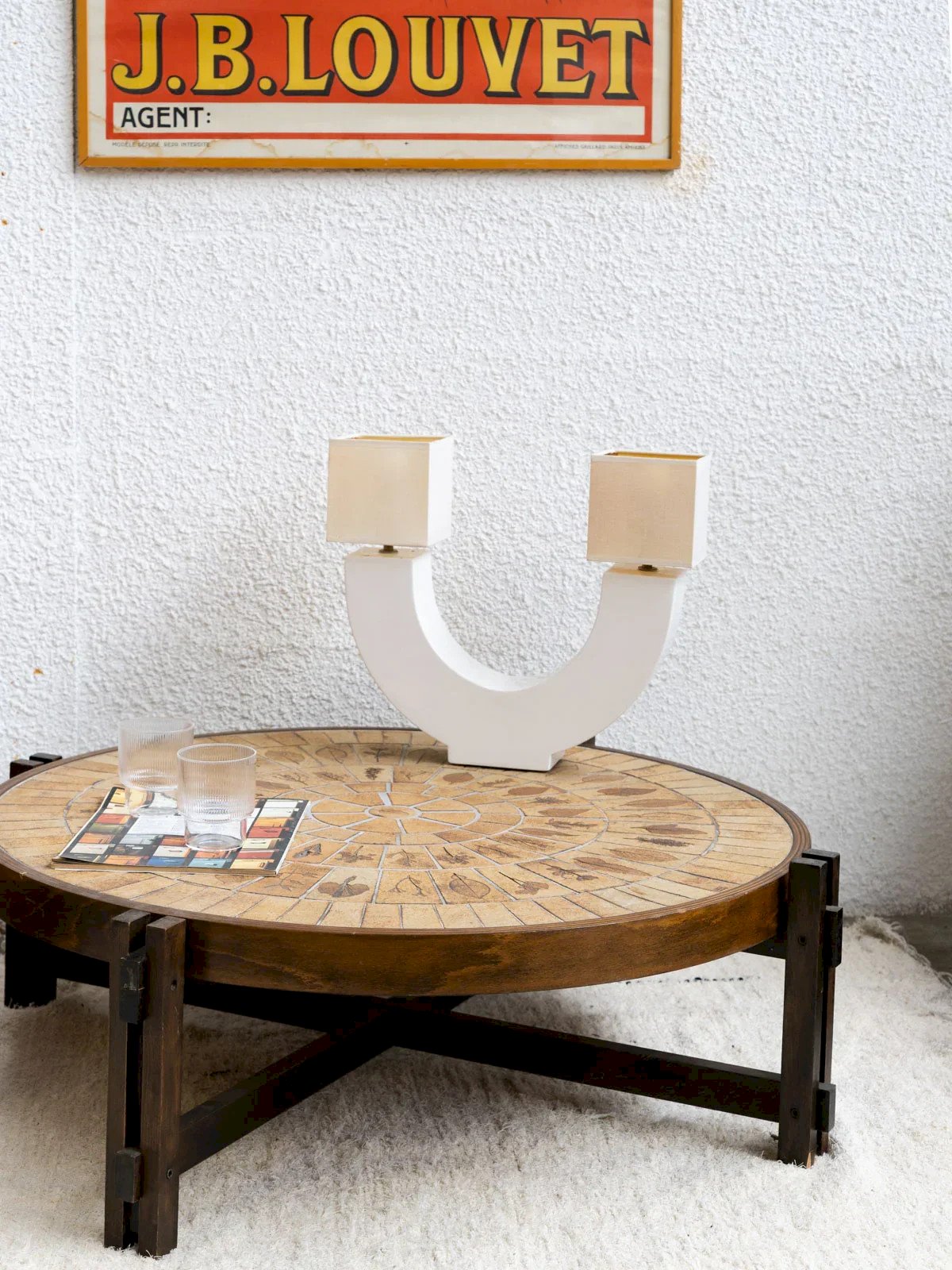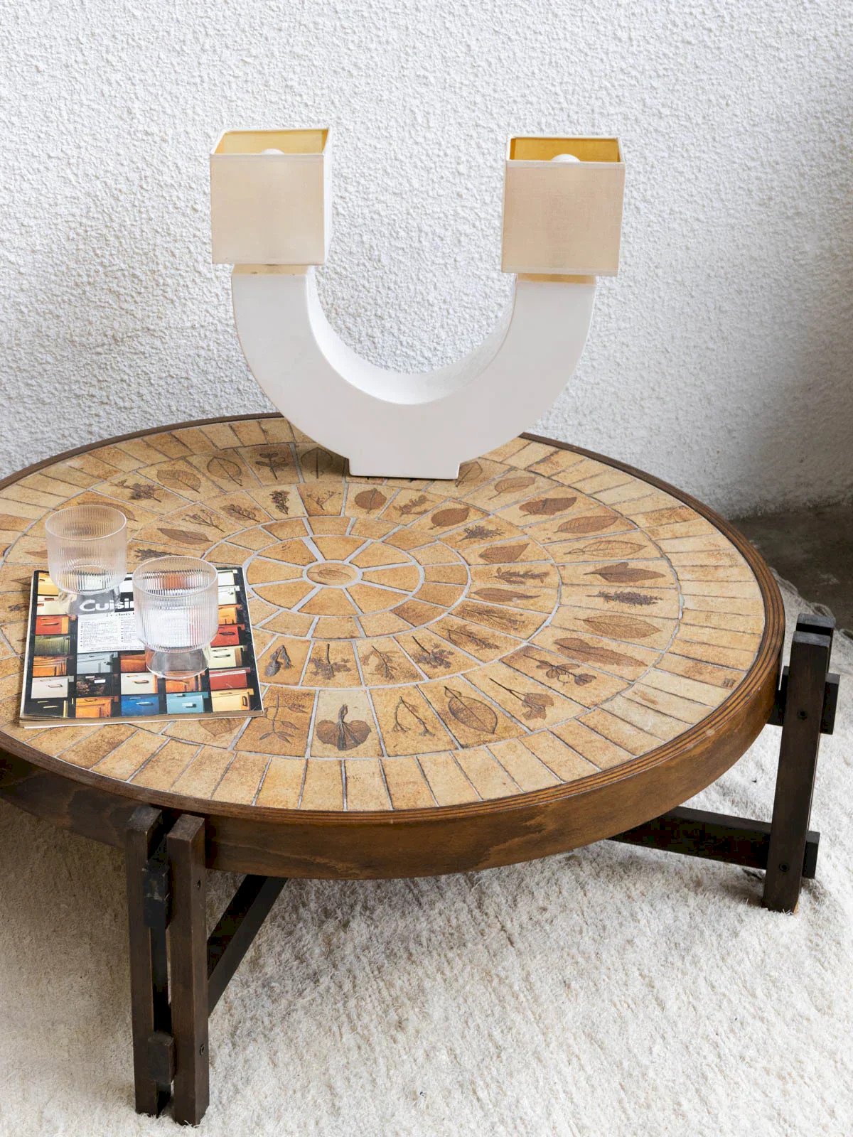 Enhance your living room with this round coffee table by Capron, featuring a glazed ceramic top and wooden legs with organic lines. Its compact shape invites sociability while providing a stable surface for books, cups, and decorative items. The design, blending sleek modernism with artisanal craftsmanship, fits perfectly in both contemporary interiors and spaces with vintage furniture. It creates a warm and soothing atmosphere, ideal for sharing moments. Height: 32 cm Diameter: 105 cm Condition: Used item. Item shows some superficial signs of wear... Used item. Item shows some superficial signs of wear, fully operational and functioning correctly. It may be a demonstration model or an item returned to the store after a short period of use. Possible imperfections. Brand: Debongout Type: Vintage product Material: Wood, Ceramic Style: Contemporary Custom: Coffee tables