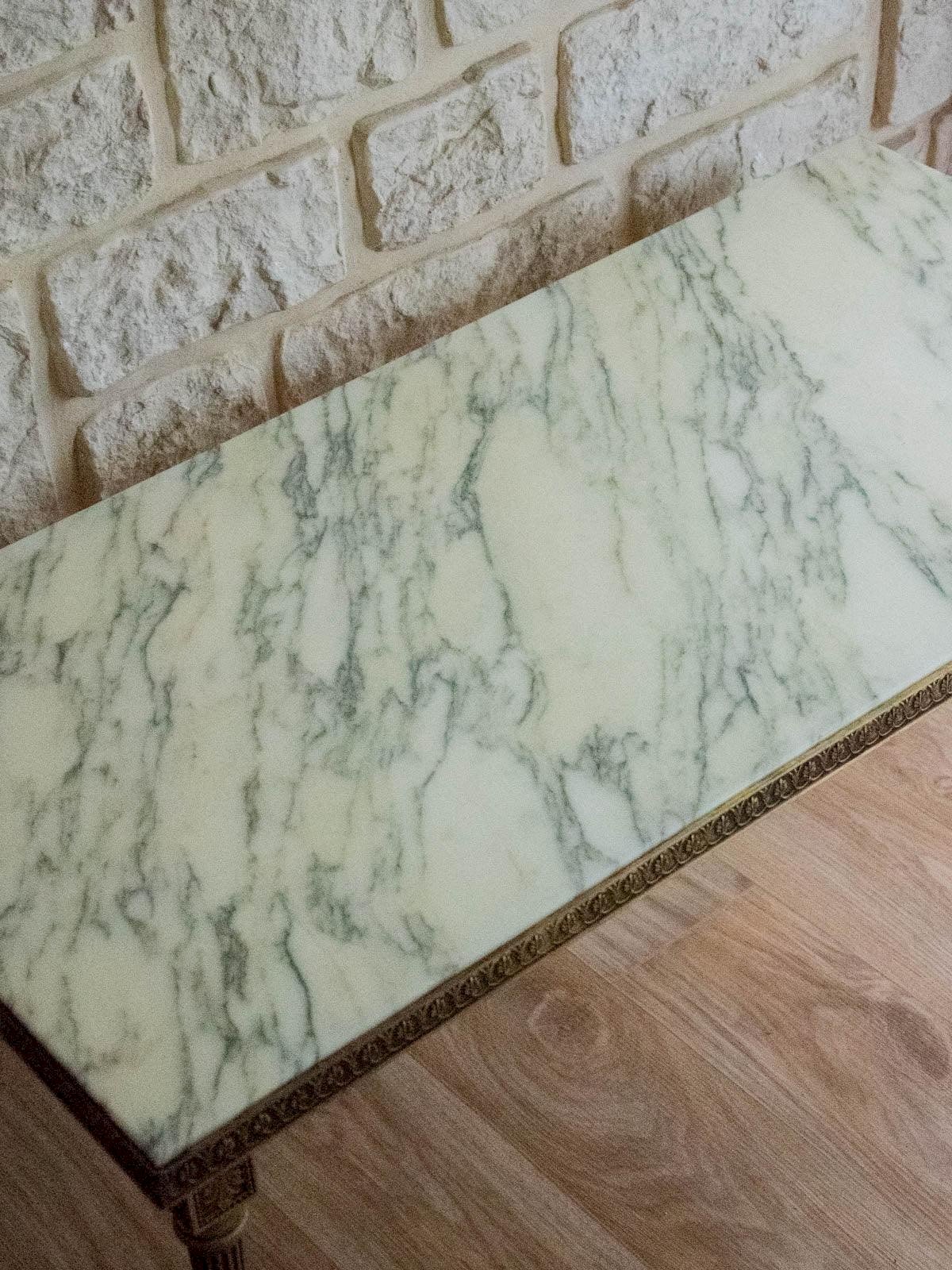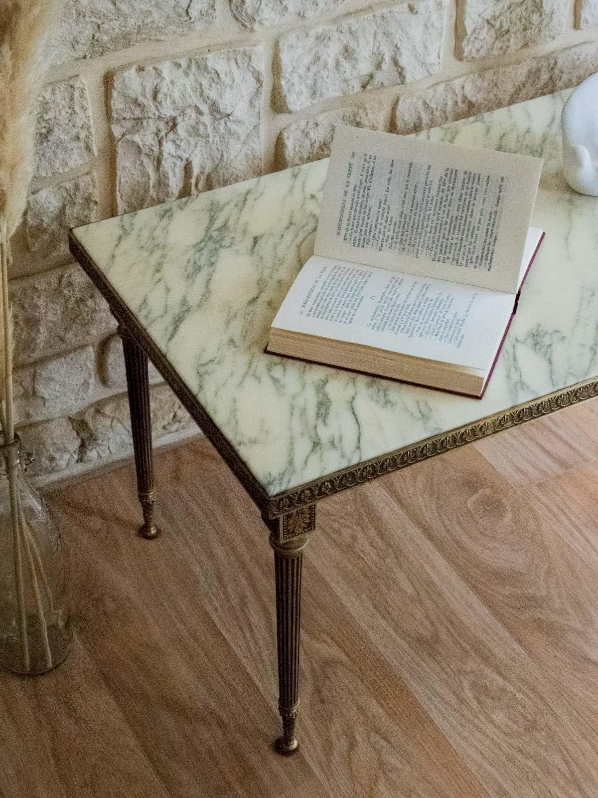 Elevate your living room with this beige and gray marble coffee table, set on a golden brass structure with airy lines. The marble blends warm veins and mineral tones, providing a sculptural presence while the golden base diffuses a soft and refined light. Its balanced proportions offer a tabletop suitable for books, plants, and tabletop objects, creating a living center that is both elegant and inviting. In perfect condition. Length: 91 cm Width: 45.5 cm Height: 43.5 cm Height under the top: 40 cm Condition: Used: Item has been used. Item shows some superficial wear marks, ...Used: Item has been used. Item shows some superficial wear marks, fully operational and functioning correctly. It may be a demonstration model or an item returned to the store after a short period of use. any potential imperfections. Brand: Debongout Type: Curated product Material: Brass, Marble Style: Contemporary Customized: Coffee tables