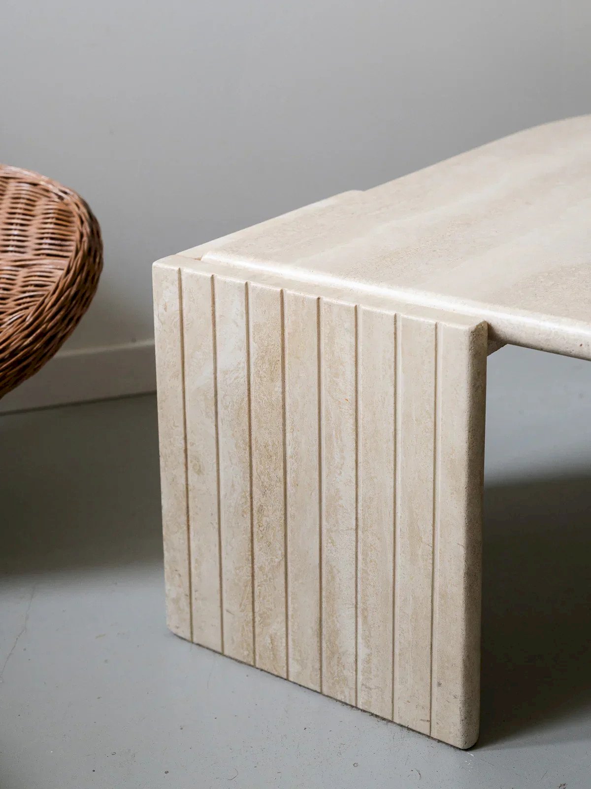 Discover this imposing travertine coffee table, a true centerpiece for your contemporary living room. Its slightly curved top rests on two sturdy legs adorned with subtle grooves, combining elegance and solidity. Although the top is in perfect condition, a small accident on one of the legs should be noted. However, it is not noticeable and does not affect the table's sturdiness. Bring a minimalistic and refined touch to your interior with this timelessly designed piece of furniture. Length: 150 cm Width: 107 cm Height: 37 cm Condition: Used: Item that has been used. Item showing some superficial wear marks, fully operational and functioning correctly. It may be a demonstration model or an item returned to the store after a short period of use. The potential imperfections. Brand: Debongout Type: Vintage product Material: Travertine Style: Contemporary Custom: Coffee tables