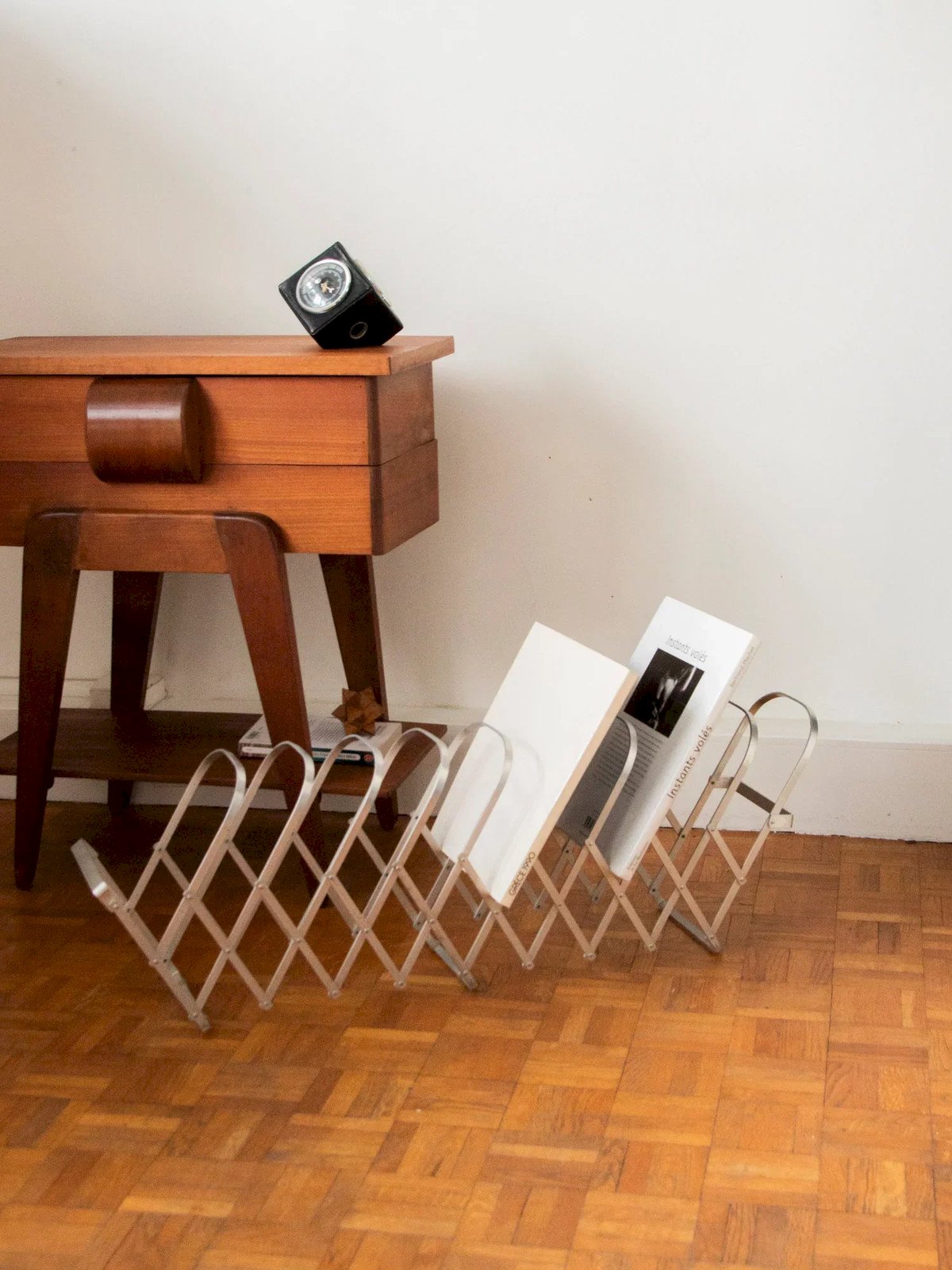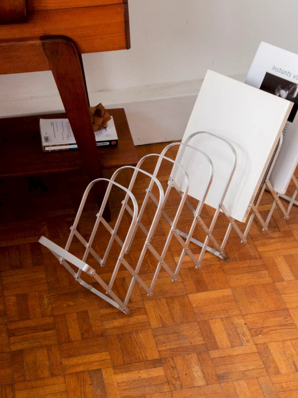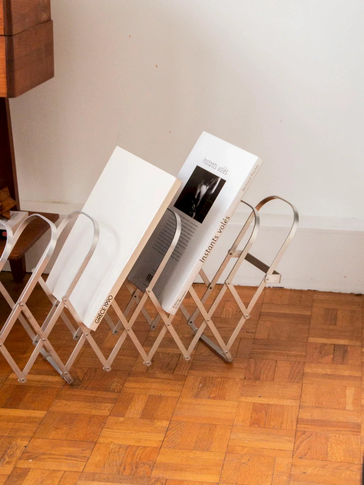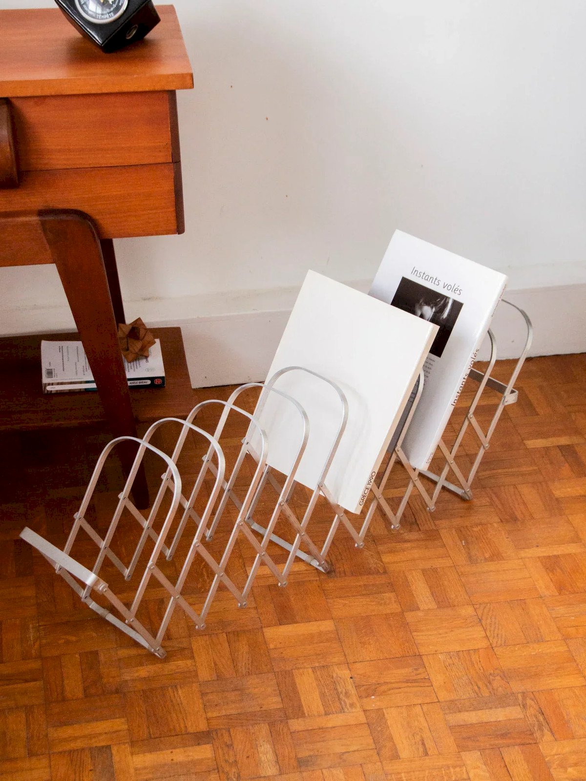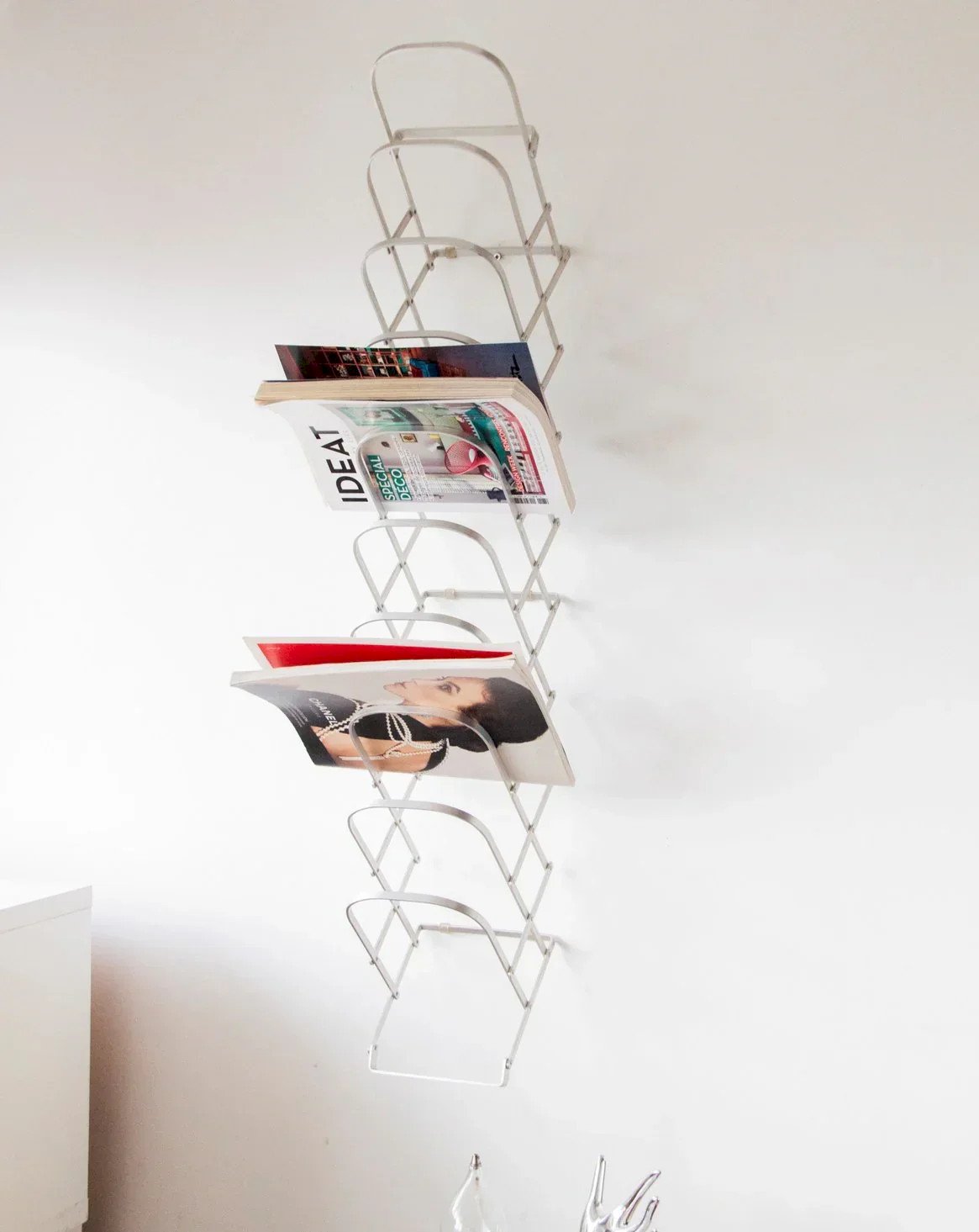 Adopt this foldable metal magazine rack, designed to be infinitely adjustable and easily attachable to the wall. Its ten storage areas hold magazines, newspapers, and folders, distributing the volume according to your habits, freeing up floor space and optimizing a compact room. Its lightweight structure and graphic lines provide a discreet and contemporary presence, bringing both order and character to a living room, office, or entryway. Length: 105 cm Width: 16 cm Height: 30 cm A brief history of the magazine rack The term "magazine rack" emerged in the early 20th century when newspapers and magazines became common in households. This piece of furniture, often made of wood or metal, is designed to organize and showcase printed publications. Initially present in living rooms and waiting areas, it embodies order and access to culture. Today, the magazine rack adapts to all interior styles, offering a practical decorative touch. Condition: Used: Item has been used. Item shows some superficial signs of wear... Used: Item has been used. Item shows some superficial signs of wear, fully operational and functioning correctly. It may be a display model or an item returned to the store after a short period of use, with possible imperfections. Brand: Debongout Type: Curated product Material: Metal Style: Contemporary