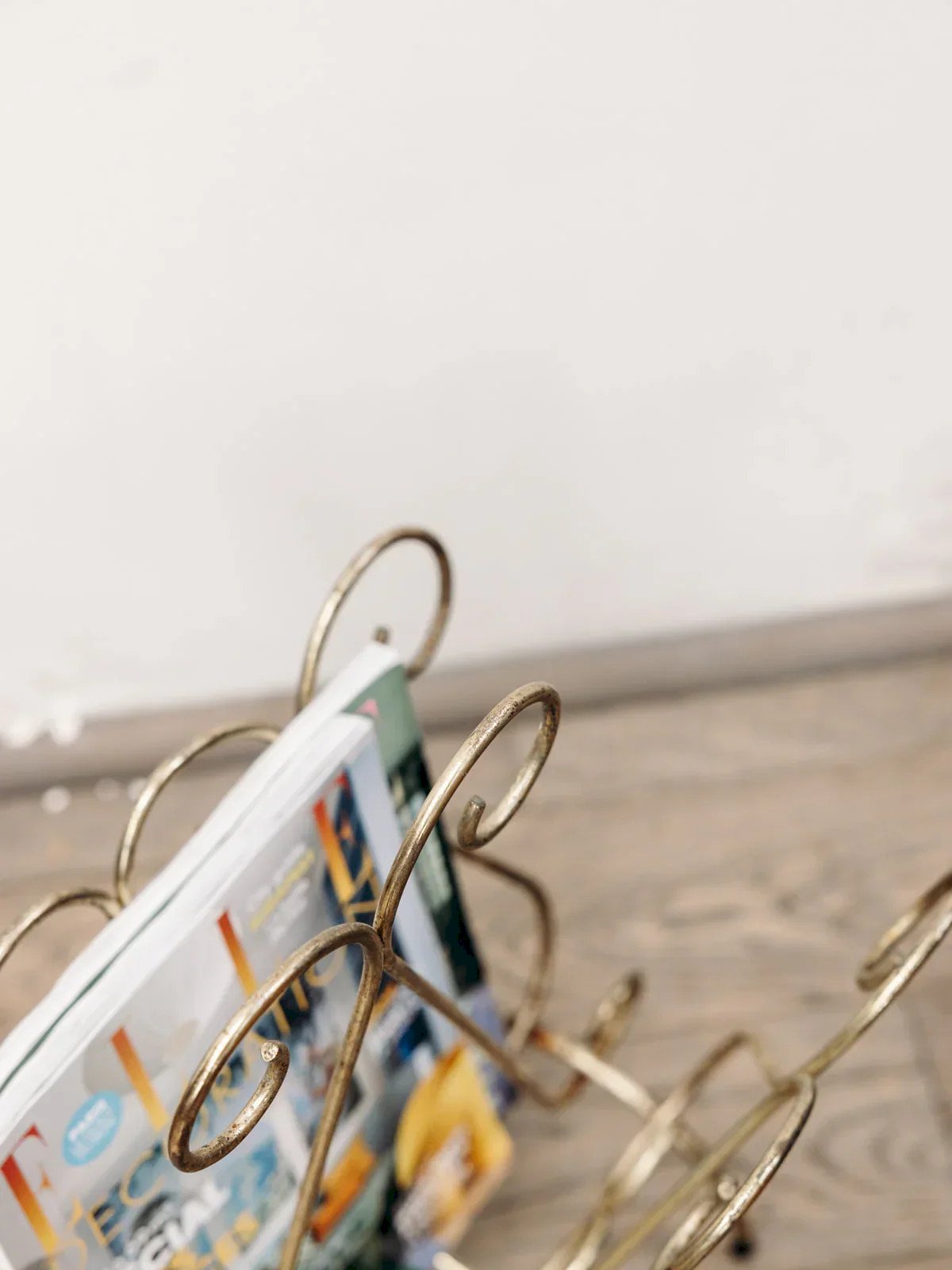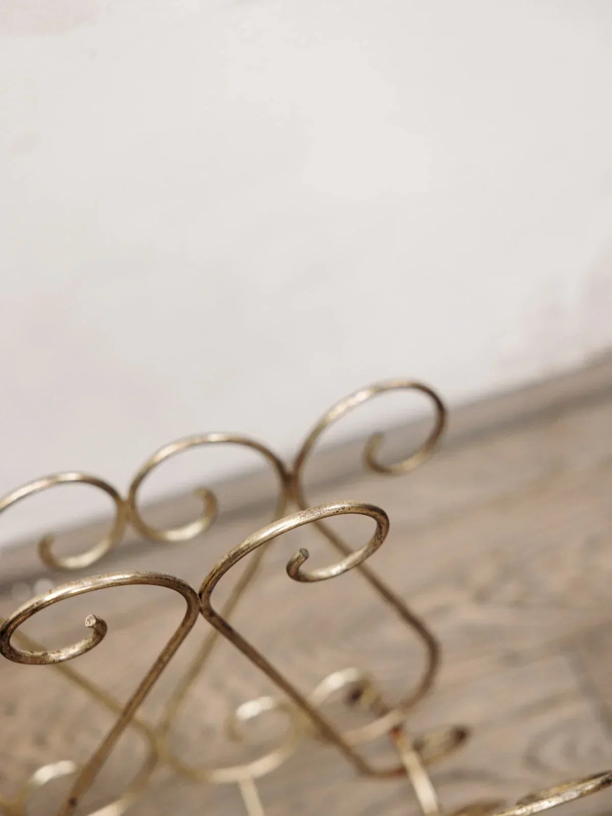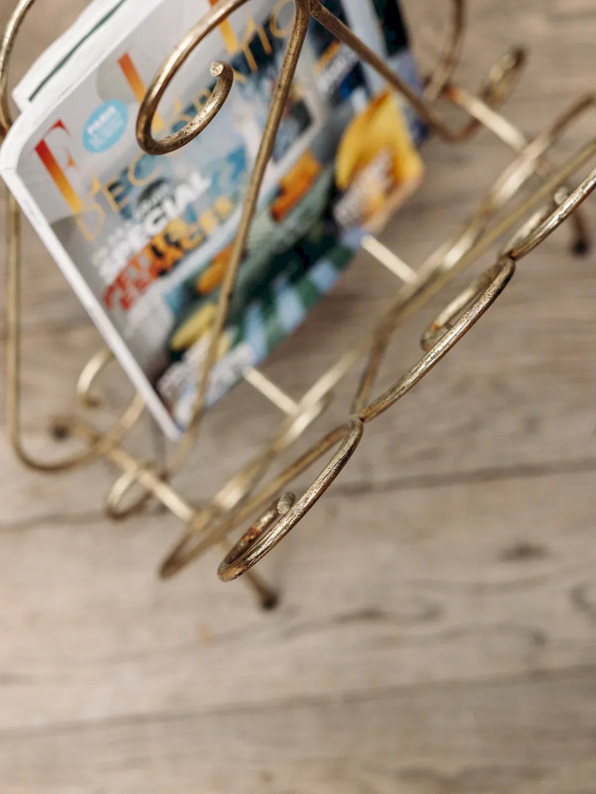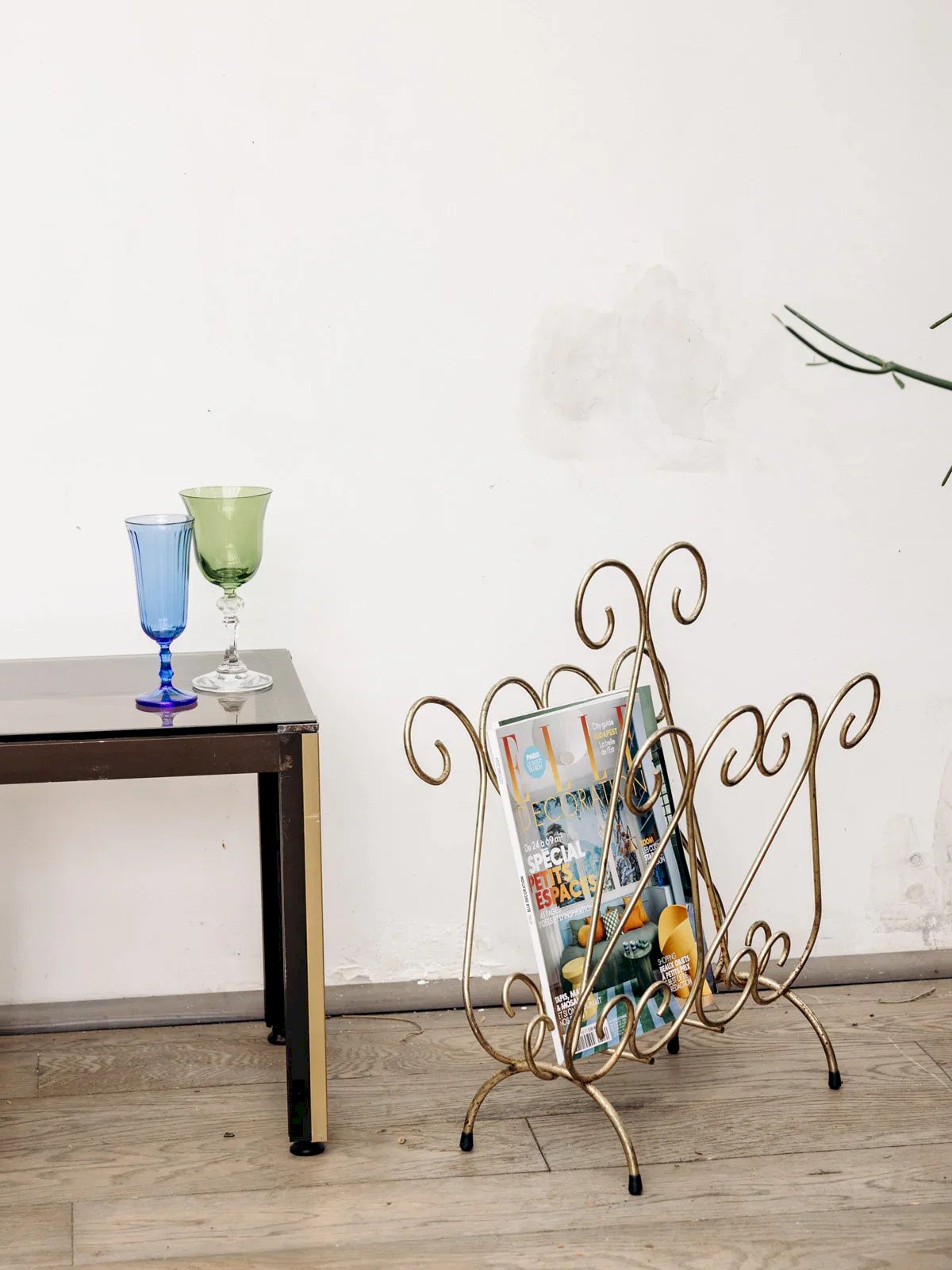 Add a vintage touch to your interior with this beautiful thin metal and gold magazine rack. Its elegant and timeless design will bring the ideal vintage touch to your living room or office. Please note that it shows some signs of pitting, visible in the photos, which gives it authentic charm and a unique patina. Perfect for stylishly storing your magazines while enhancing your decor. Web exclusive, the meeting will take place at your home! Length: 38 cm Width: 24.5 cm Height: 50 cm A little history of the magazine rack The term "magazine rack" appeared in the early 20th century when newspapers and magazines became common in households. This piece of furniture, often made of wood or metal, is designed to organize and display printed publications. Initially found in living rooms and waiting areas, it embodies order and access to culture. Today, magazine racks adapt to all interior styles, providing a practical decorative touch. Condition: Used: Item has been used. Item showing some superficial signs of wear... Used: Item has been used. Item showing some superficial signs of wear, fully operational and functioning properly. It may be a demonstration model or an item returned to the store after a short period of use. Any imperfections. Brand: Debongout Type: Vintage product Material: Metal Style: Contemporary