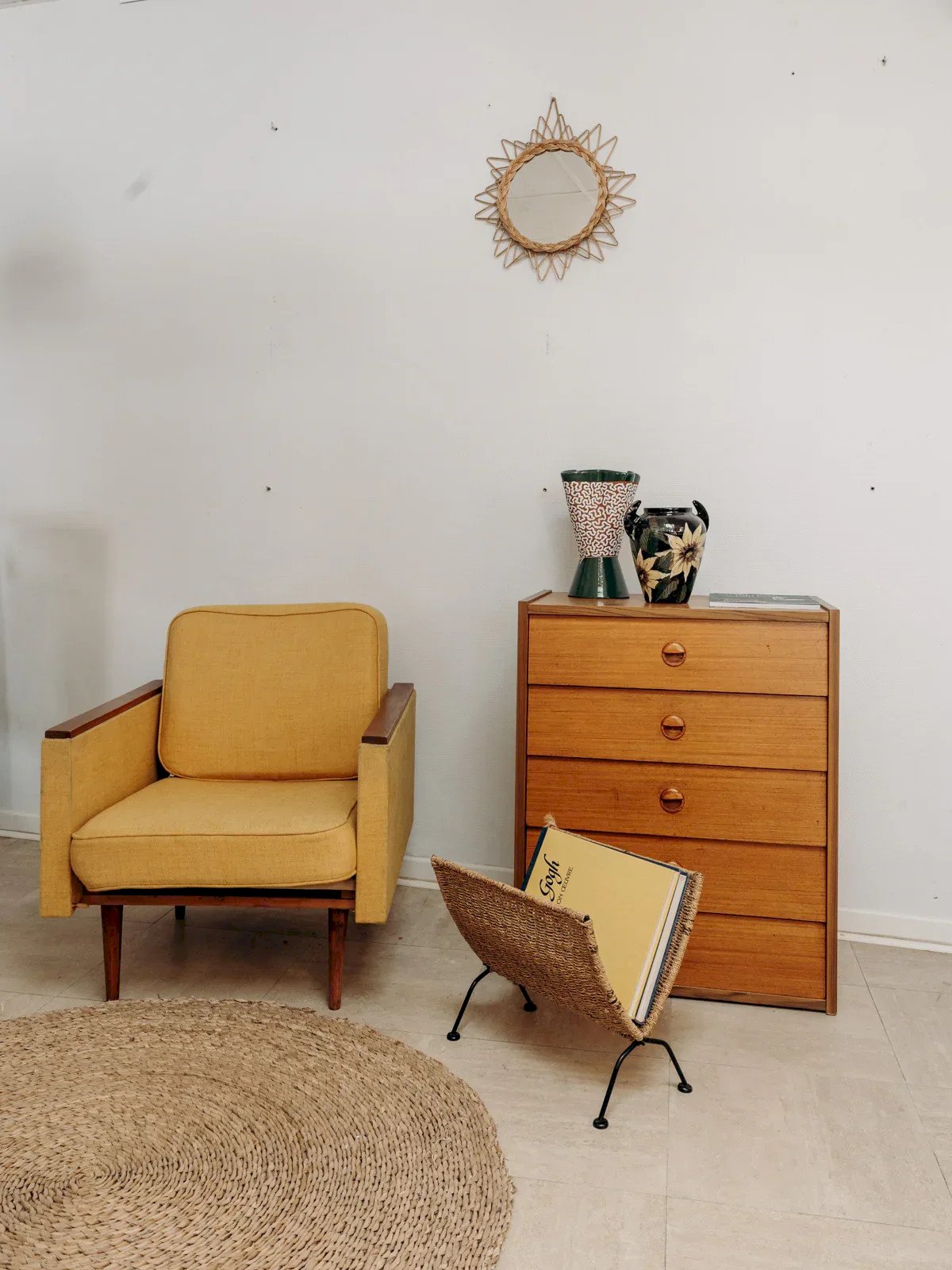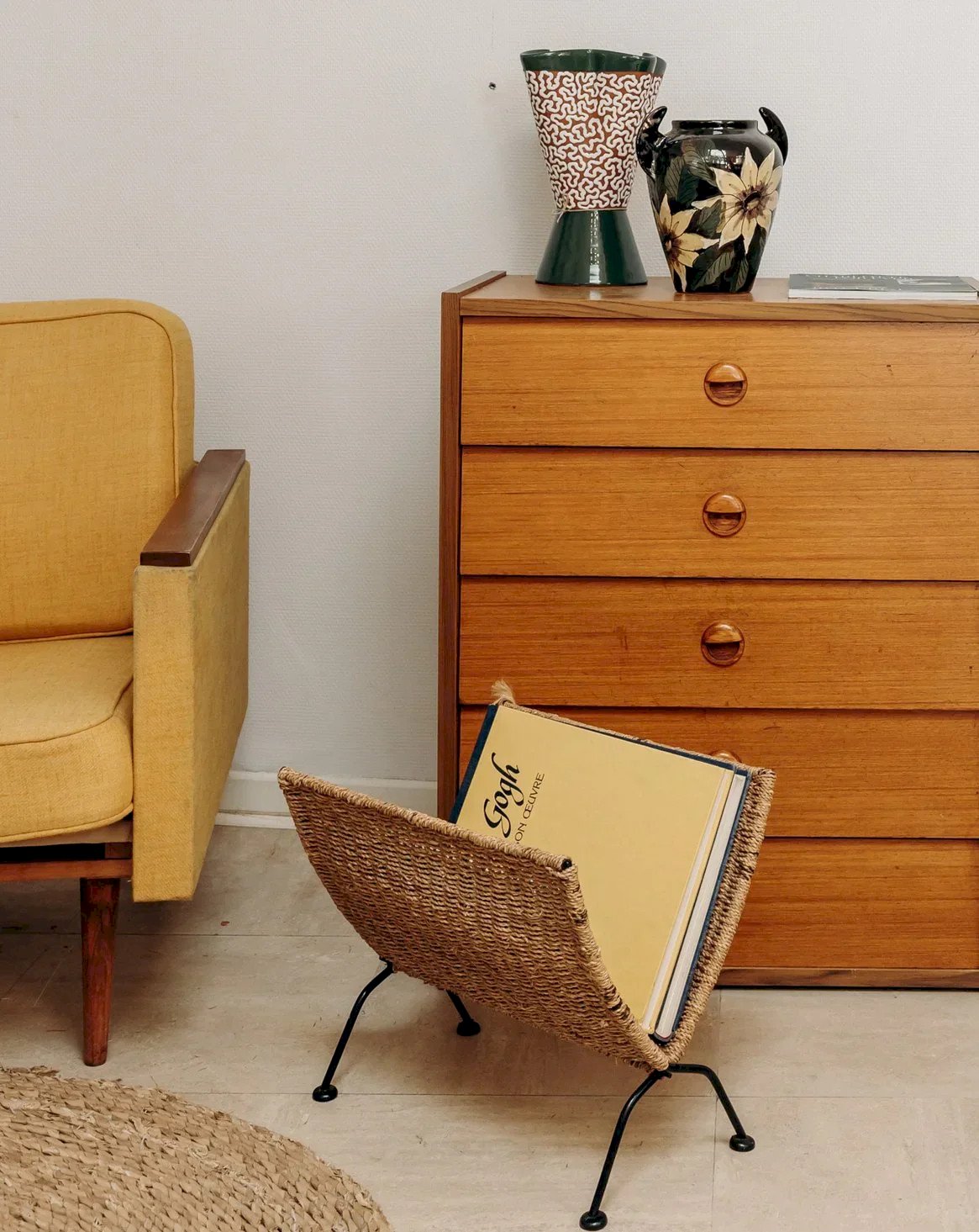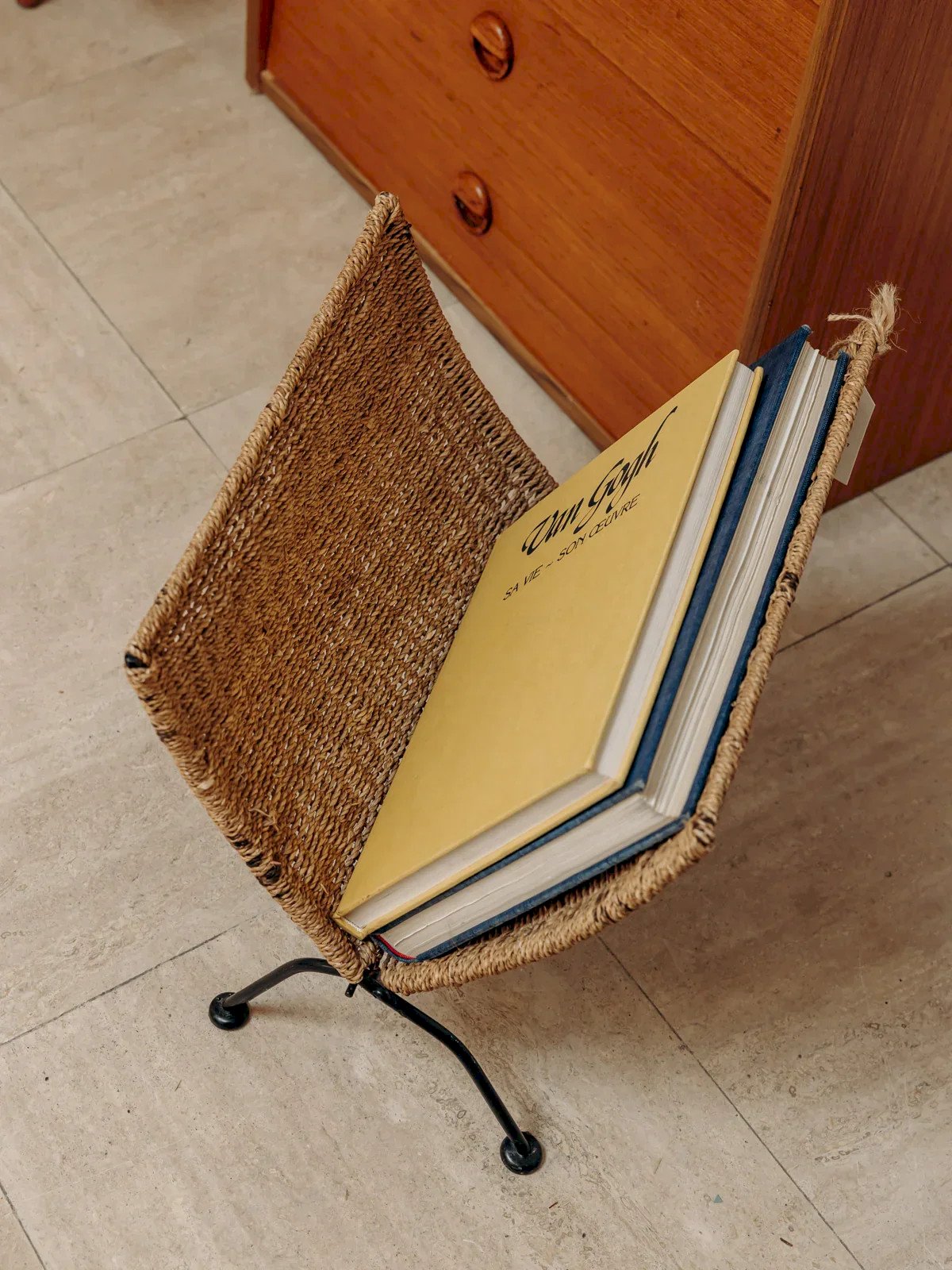 Discover this vintage 1970s rope magazine rack, an accessory with timeless charm. Its black lacquered metal legs add a touch of elegance while ensuring remarkable stability. Although it is in fair condition with a slight loosening of the rope, this item remains sturdy and ready to enhance your interior while keeping your readings within reach. A must-have for retro design enthusiasts! Width: 40 cm Height: 36 cm Depth: 30 cm A brief history of the magazine rack The term "magazine rack" appeared in the early 20th century, when newspapers and magazines became common in households. This piece of furniture, often made of wood or metal, is designed to organize and display printed publications. First found in living rooms and waiting areas, it embodies order and access to culture. Today, the magazine rack adapts to all interior styles, providing a practical decorative touch. Condition: Used: Item that has been used. Item showing some superficial signs of wear, ... Used: Item that has been used. Item showing some superficial signs of wear, fully operational and functioning correctly. It may be a demonstration model or an item returned to the store after a short period of use, with any possible imperfections. Brand: Debongout Type: Vintage find Material: Jute, Rope Style: Contemporary