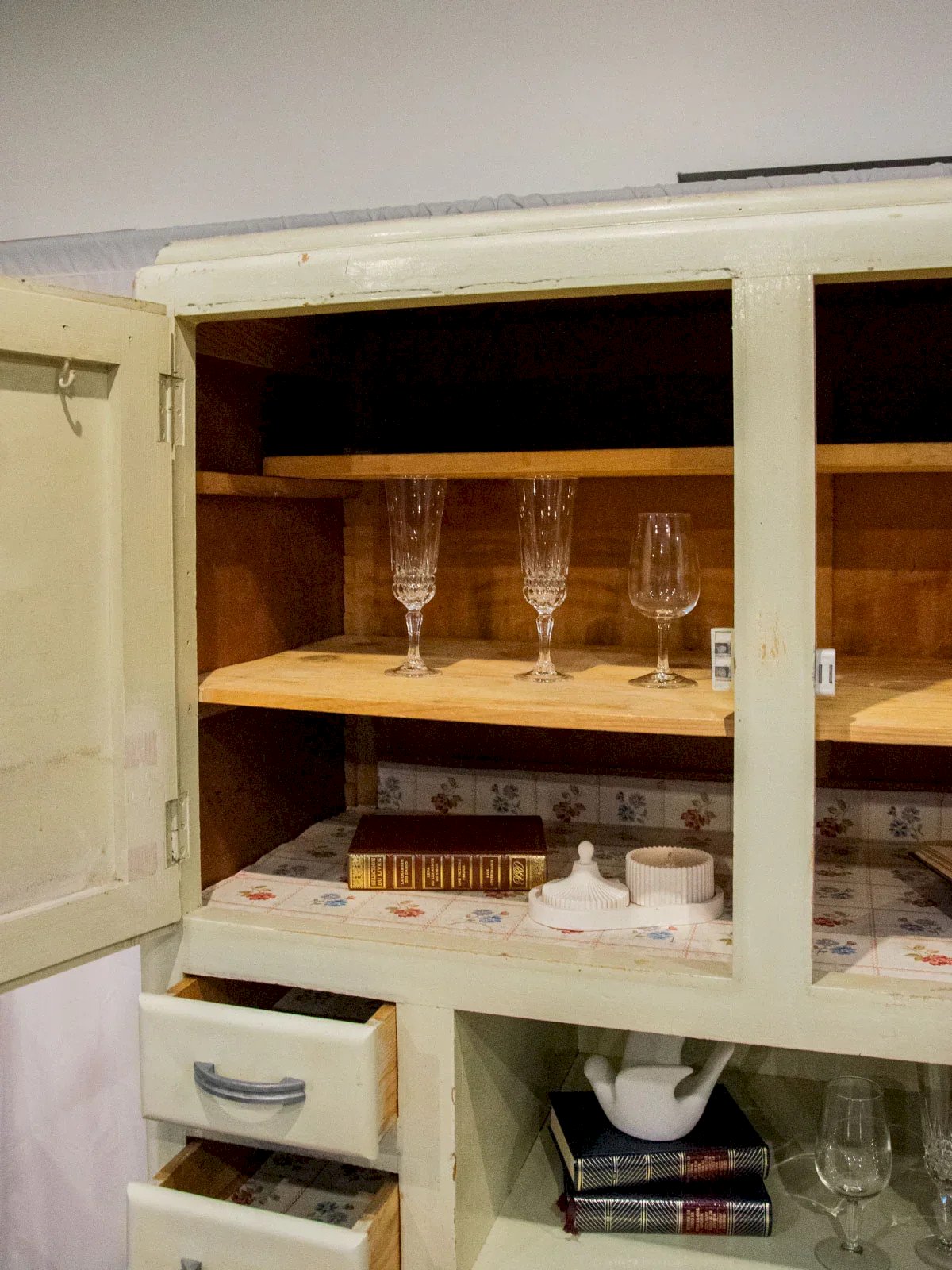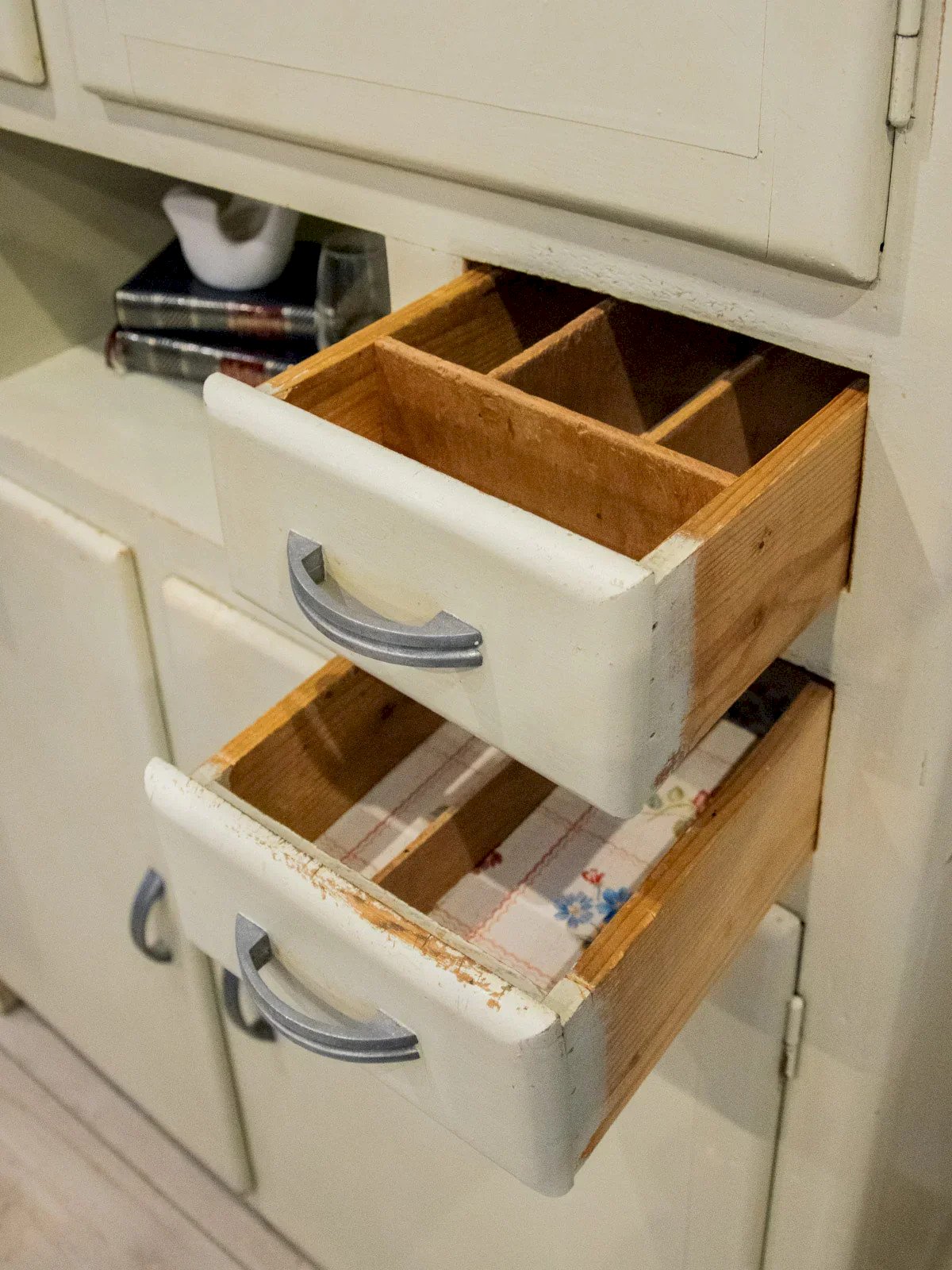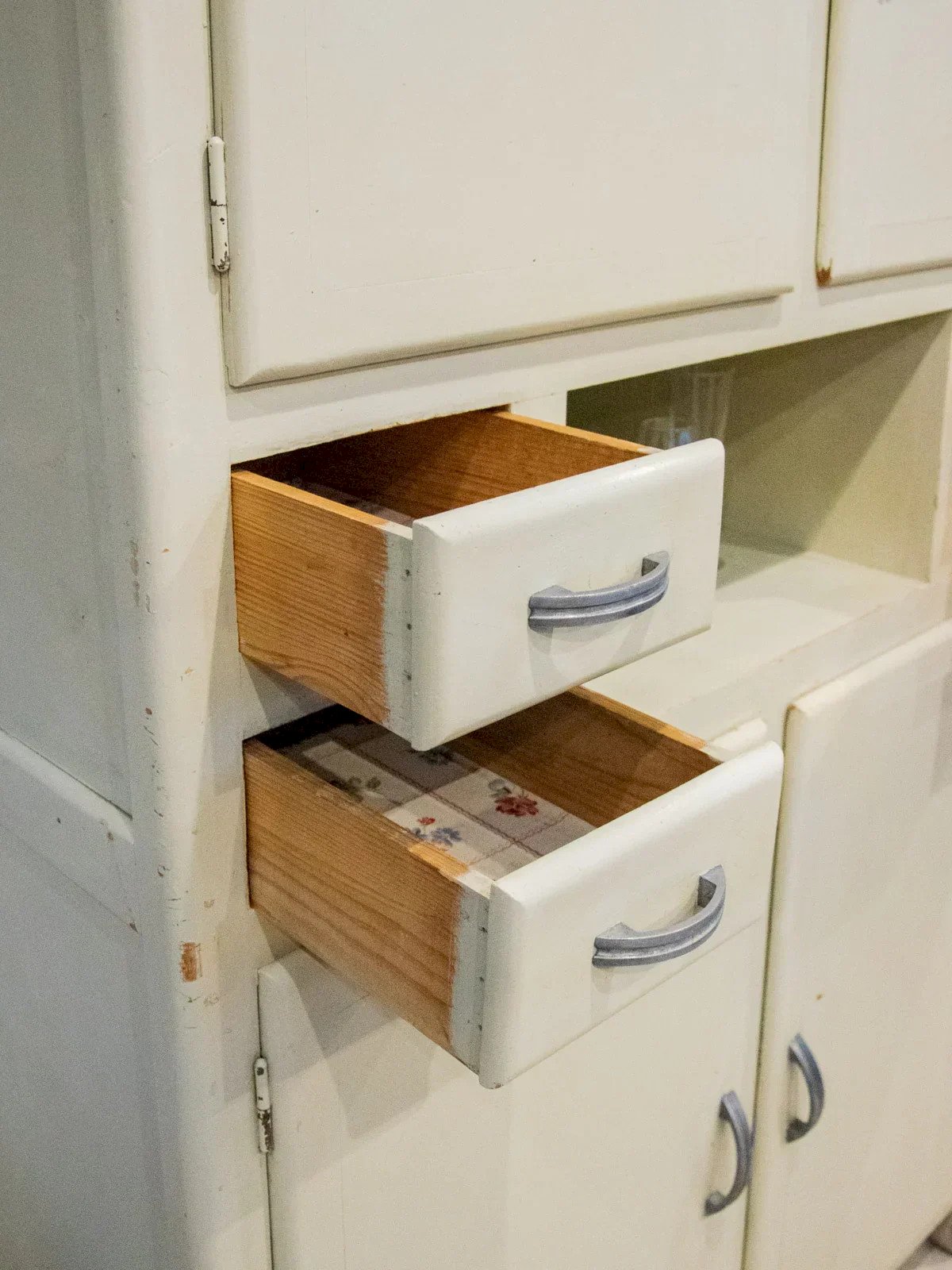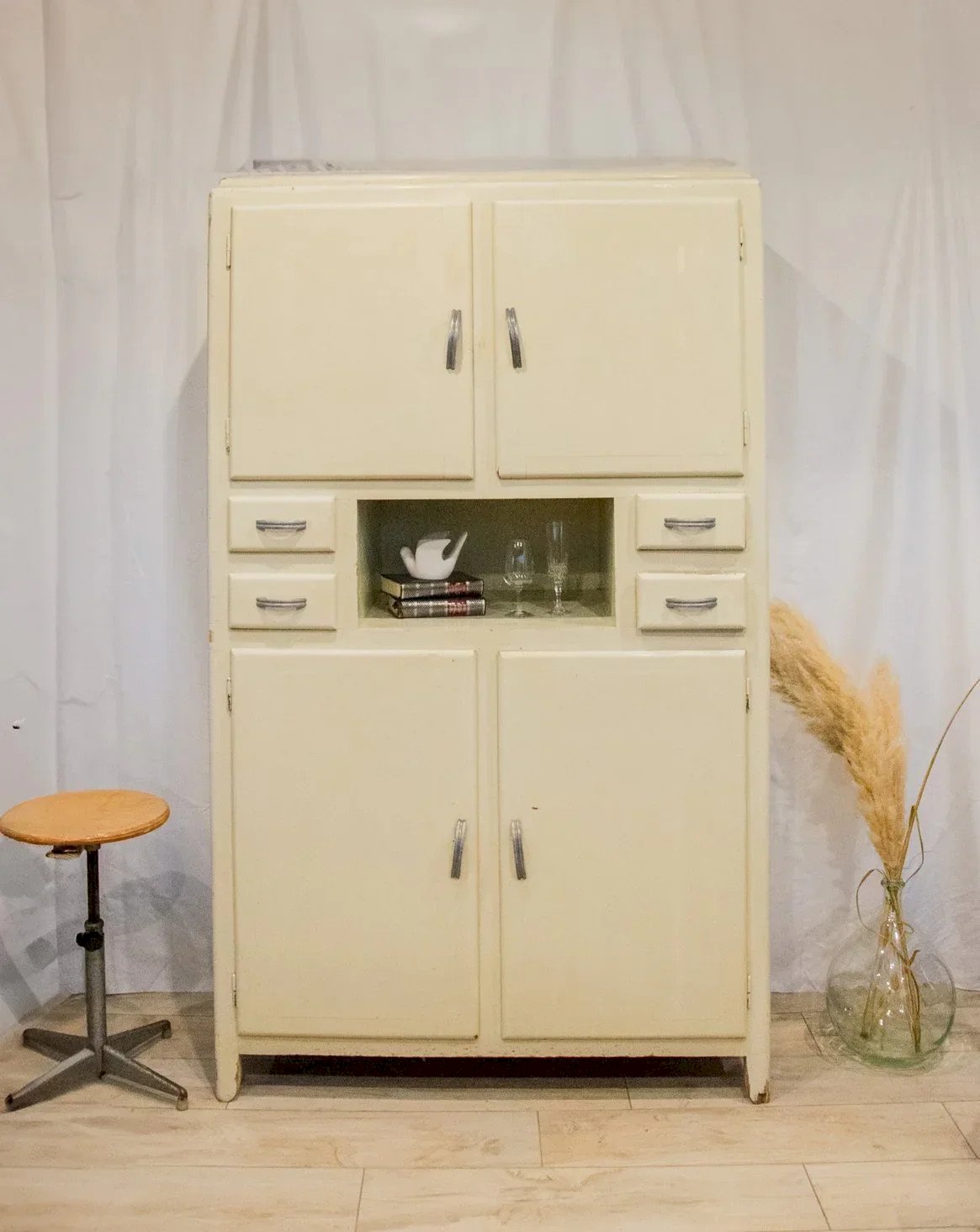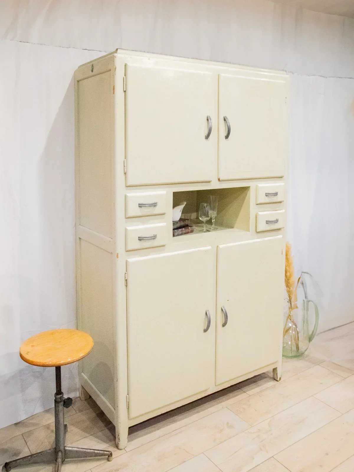 Adopt this authentic and compact gray-beige sideboard, which exudes a discreet elegance thanks to its angled handles and distressed paint finish. Designed for practicality, it features two cabinets, four drawers — one specifically designed for cutlery — adjustable interior shelves, integrated hooks, and various storage options, while the bottoms and shelves are protected by a plastic film. Its compact size makes it suitable for a kitchen, laundry room, or entryway, where it creates a warm and organized atmosphere. There are several paint chips, various signs of wear, and a damaged but stable front right leg, all of which testify to its unique and authentic character. Length: 113 cm Width: 55 cm Height: 184 cm Drawer height: 8 cm Condition: Used item with some superficial signs of wear, fully operational and functioning properly. It may be a demonstration model or an item returned to the store after a short period of use. Any imperfections. Brand: Debongout Type: Vintage product Material: Wood, Metal, Zinc Style: Country Custom: Buffets and display cabinets