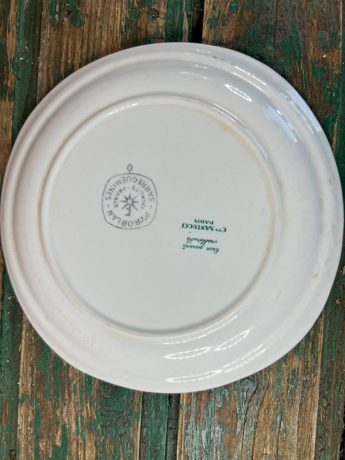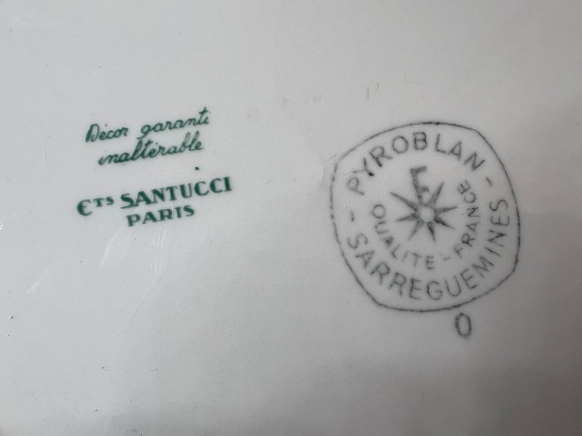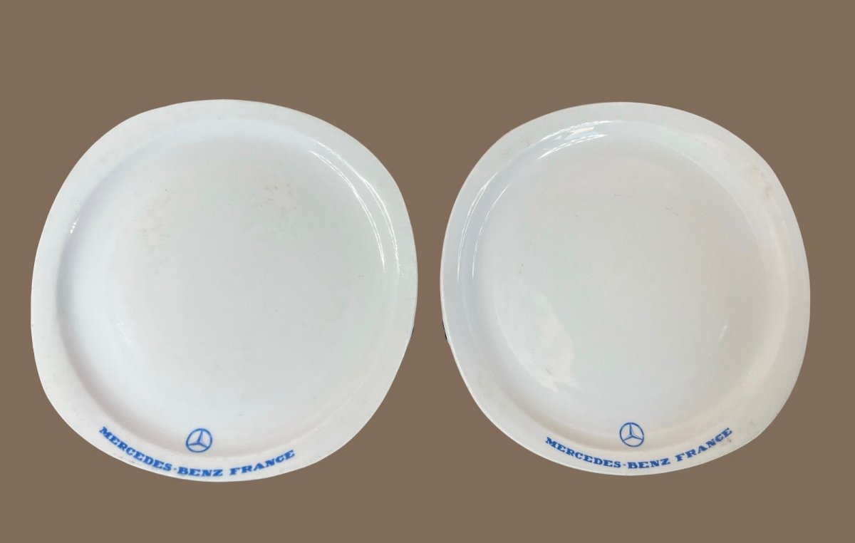 Set of 2 vintage Mercedes-Benz France plates – Ø 19 cm Rare set of two promotional plates used in Mercedes-Benz France dealerships and events. These plates are made of white Sarreguemines – Pyroblan earthenware, a professional line resistant to heavy use. On the reverse side, there is also the green stamp "Est Santucci Paris," a renowned supplier of dishes for communities and restaurants in the 1950s-1970s. Authentic pieces that have become hard to find, ideal for an automobilia collection. Features: • Diameter: 19 cm • Earthenware: Sarreguemines – Pyroblan • Green stamp: Est Santucci Paris • Front marking: "Mercedes-Benz France" + blue star logo • Overall good condition, slight normal signs of use on this type of professional dishware Collection interest: ✔ Mercedes-Benz automobilia ✔ Automotive dealership items ✔ French promotional dishware ✔ Vintage garage/office/shelf decor ✔ Collectors of Sarreguemines Pyroblan Country of origin: France