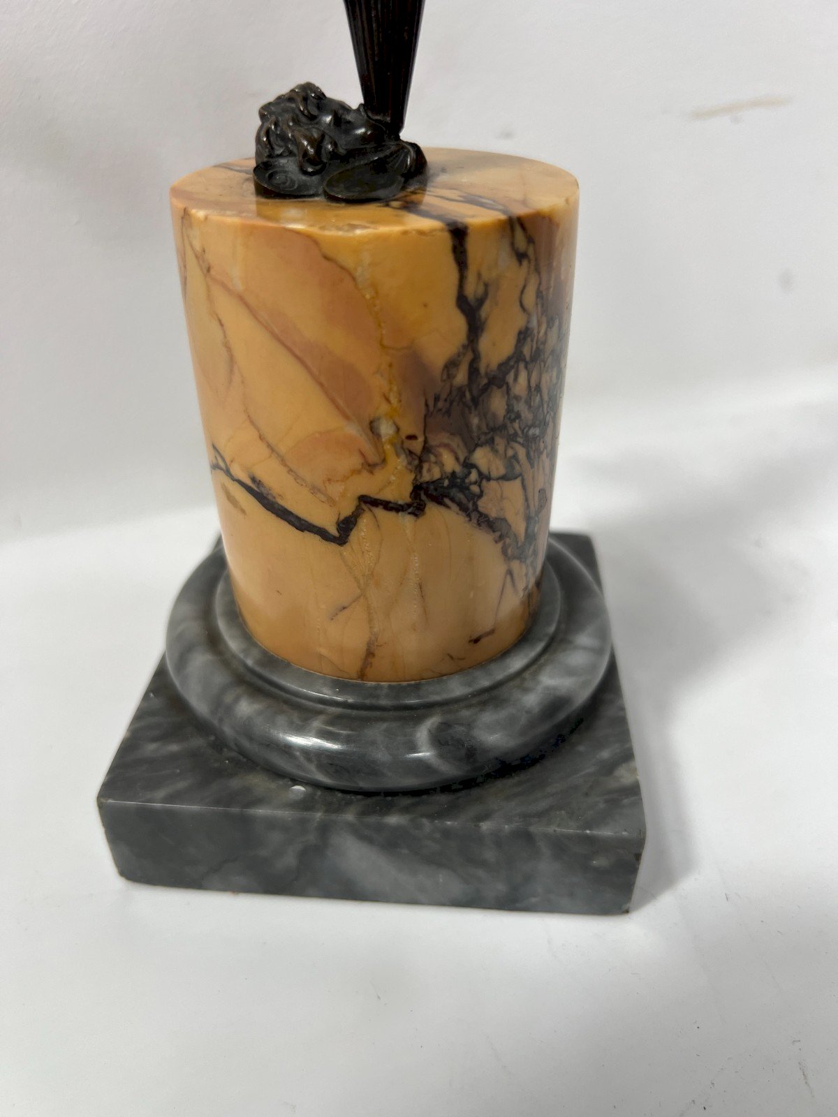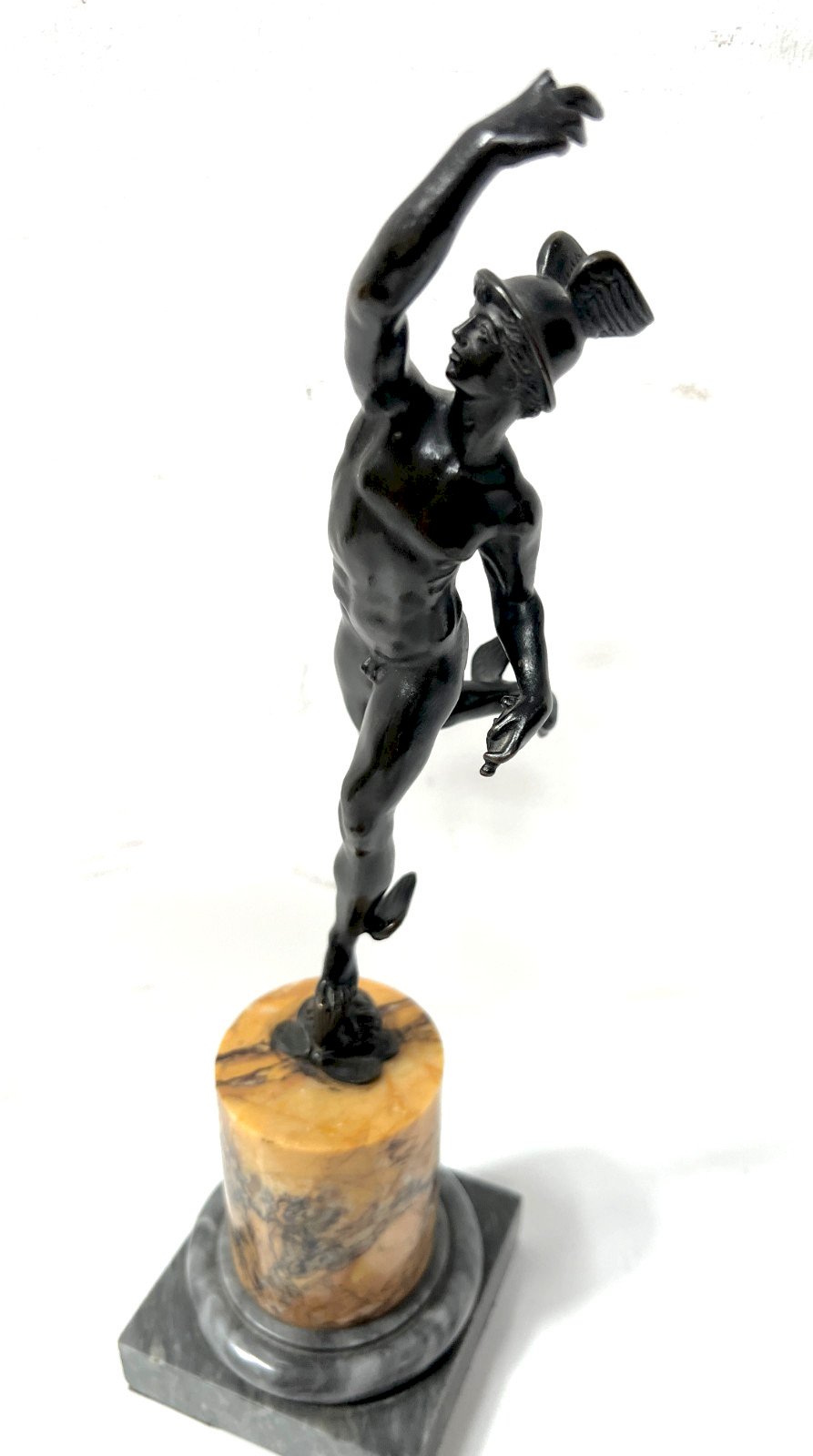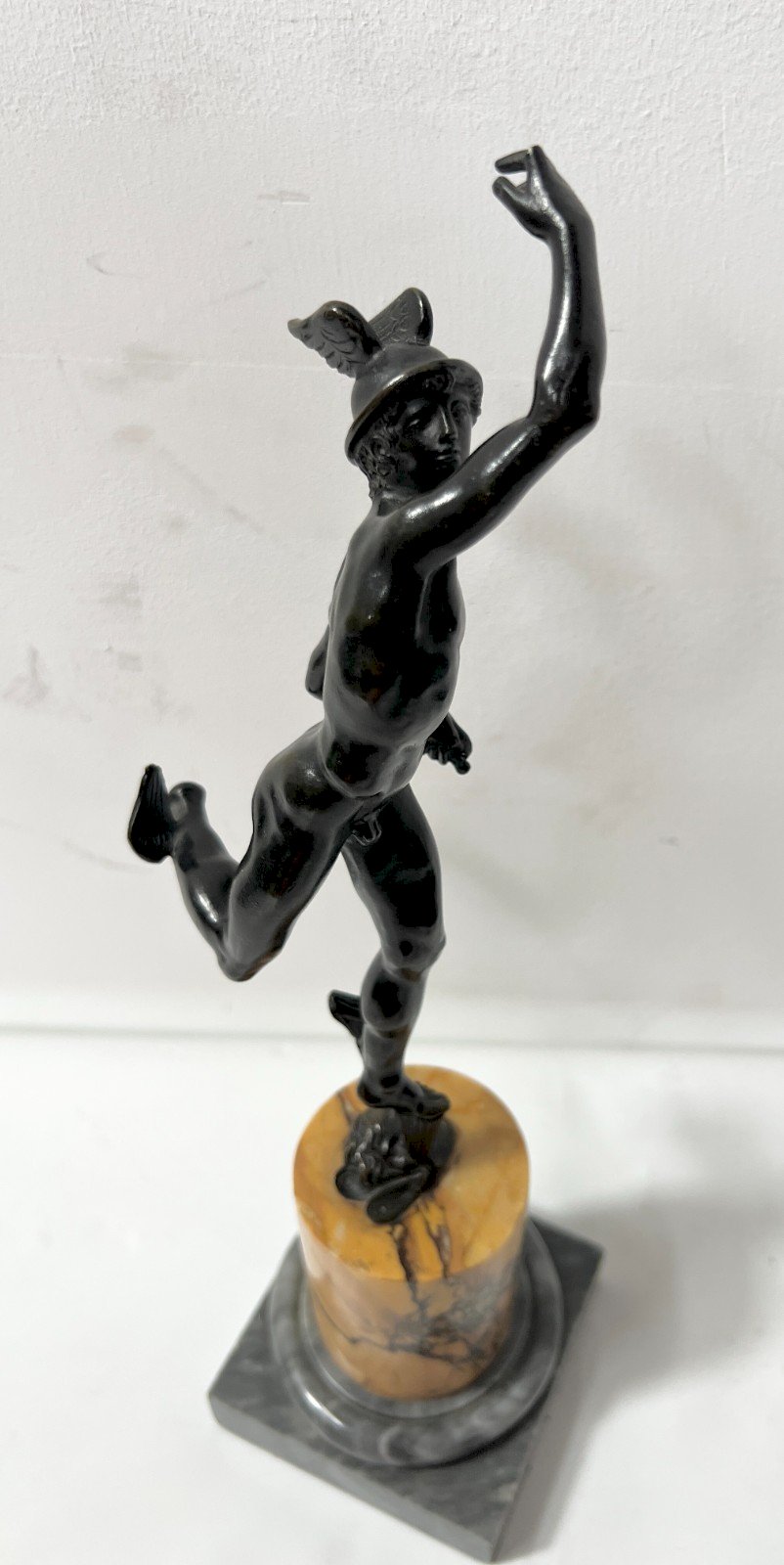 "MERCURY flying on the breath of AEOLUS" Bronze group with brown patina Gray marble base and round column in veined yellow marble Missing a small finger Very beautiful patina Dimension H 35 x L 19 x 10 cm Mercury H 23 cm 19th century Type: Showcase object, Decorative Origin: France Country of manufacture: France Height: 33 Material: Bronze Style: Napoleon III Length: 9 Width: 9