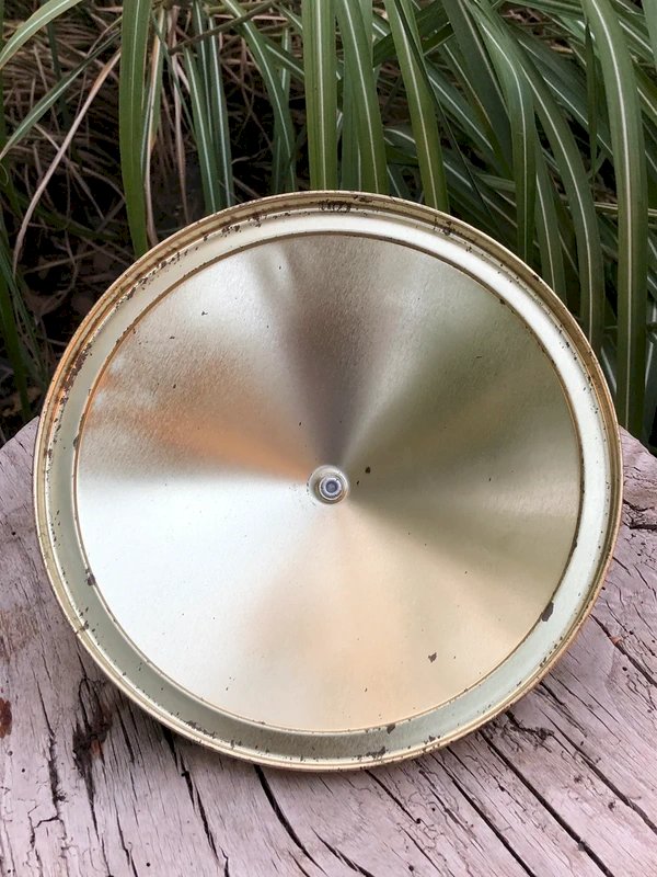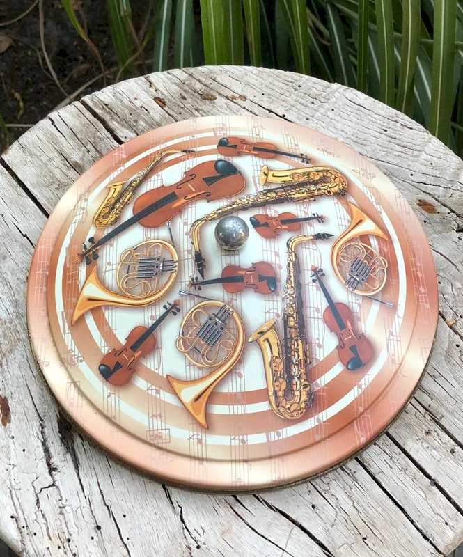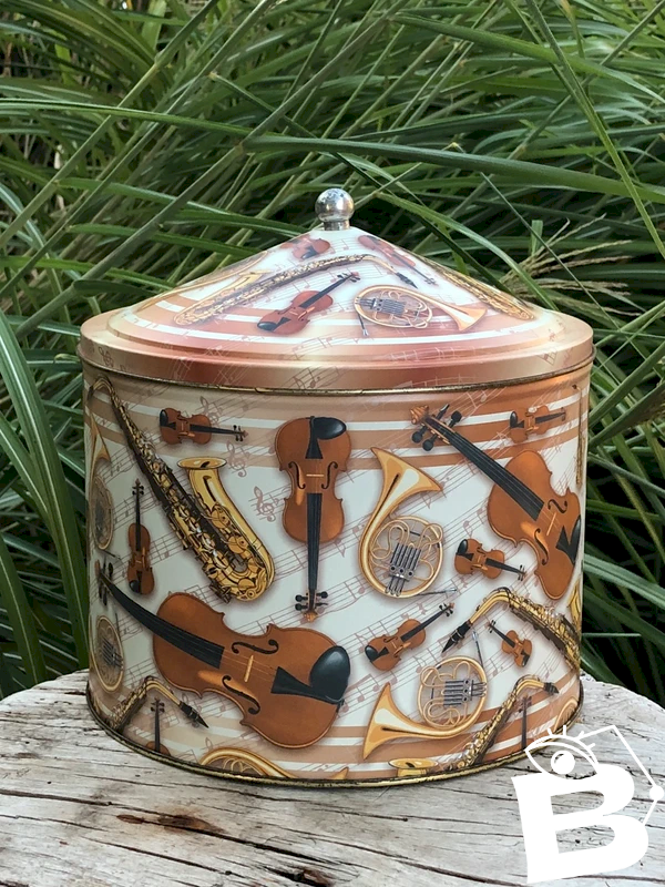 Metal box with musical instrument patterns in good overall condition, some signs of use but opens and closes very easily. Total height 23 cm, diameter 22 cm.